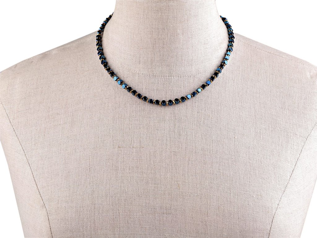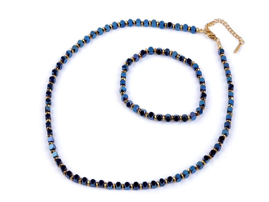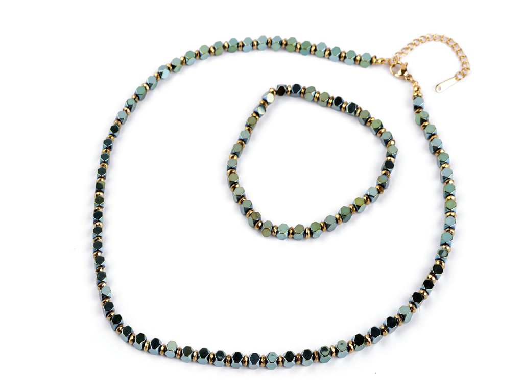 Luxusní sada náhrdelníku a náramku je vyrobená z broušených korálků pokoveného hematitu a kvalitní nerezové oceli. Je velice elegantní, patří mezi šperky, které díky své fascinující povrchové úpravě zaujmou na první pohled. Broušené plošky vytvářejí efektní světelné odlesky. Sada potěší každou ženu, je dárkem, se kterým nešlápnete vedle. Hodí se ke slavnostním příležitostem, skvěle podtrhne i business styl oblékání. Náhrdelník se zapíná na karabinku a prodlužovací řetízek. Náramek má díky pružence univerzální velikost, snadno se natáhne na ruku.- Délka náhrdelníku: 42 cm