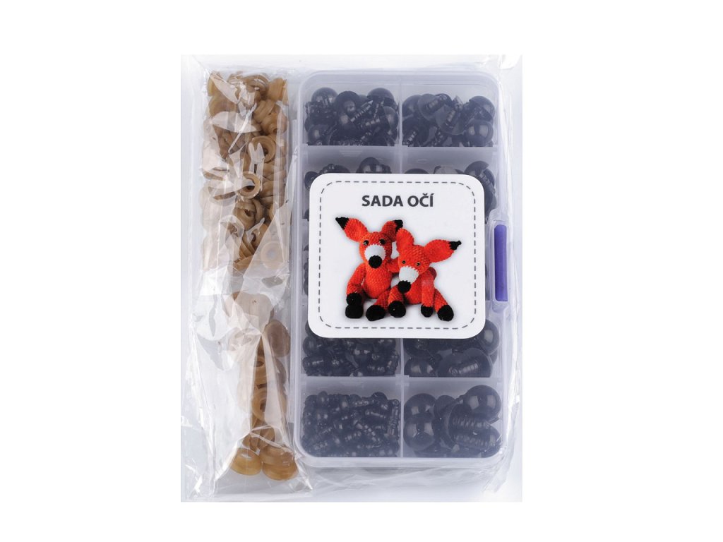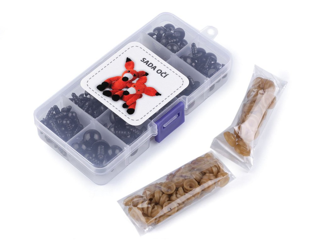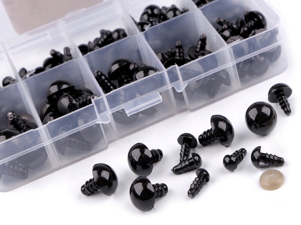 Souprava černých polokulatých bezpečnostních očí je ideální pro kreativce, kteří rádi vyráběji zvířátka a dekorační postavičky. Mají závit, který se provleče materiálem, a z druhé strany se pak nacvakne pojistka, která oči bezpečně připevní na místo. Vše je roztříděné a uložené v praktické krabičce s přihrádkami. 1 sada = 1 oko + 1 pojistka Krabička obsahuje: - 10 přihrádek černých očí - Ø6; 7,5; 9; 10 a 12 mm - balíček s pojistkami- Rozměry krabičky: 7 x 13 x 2 cm