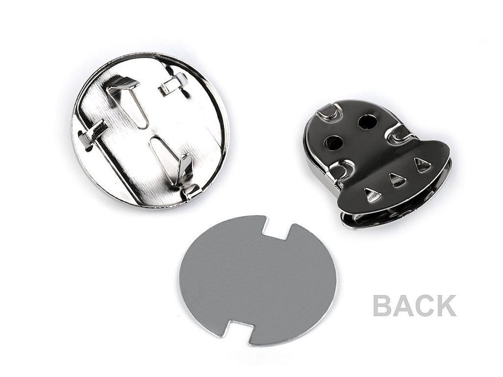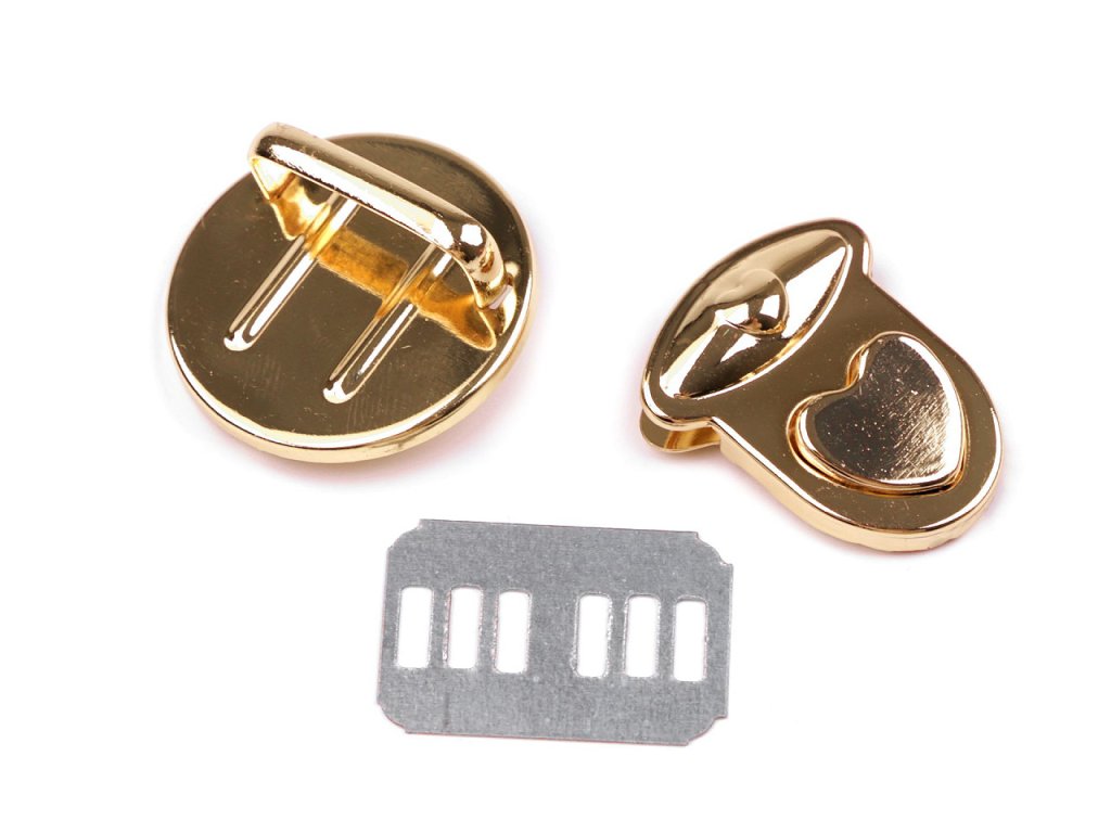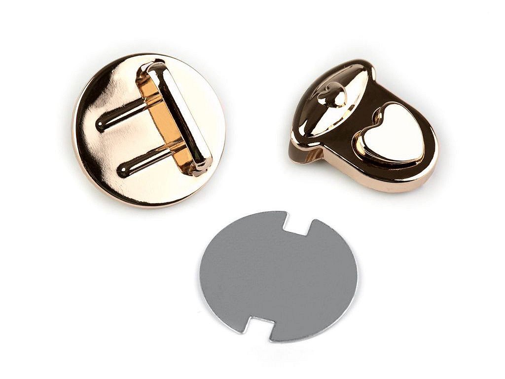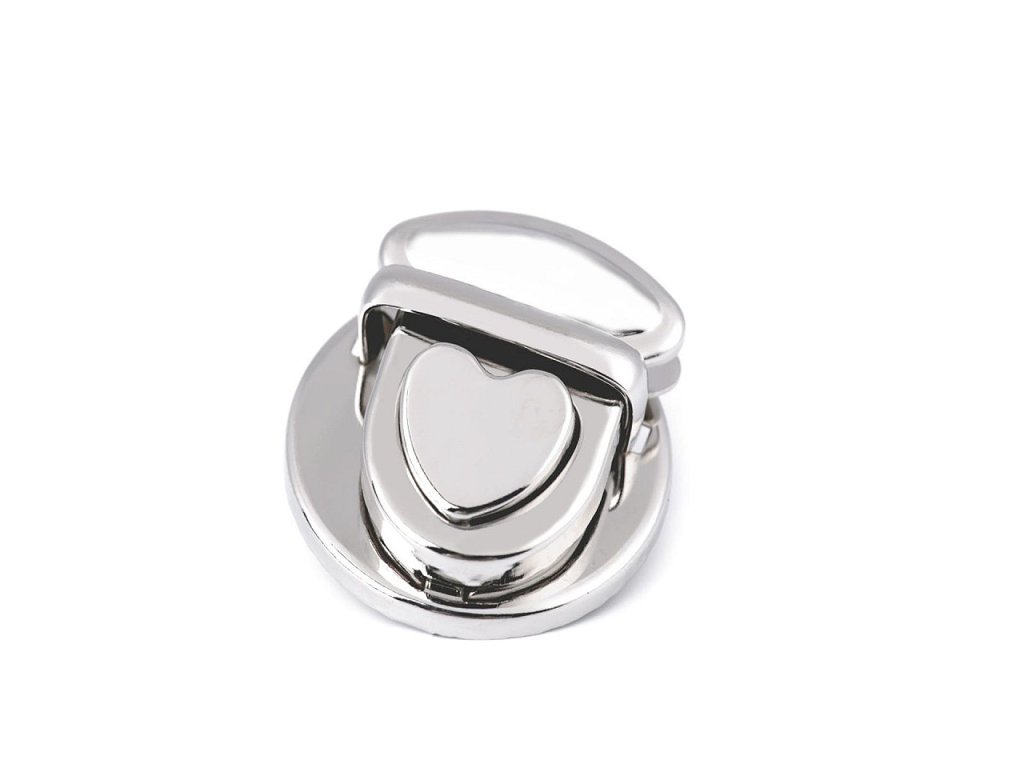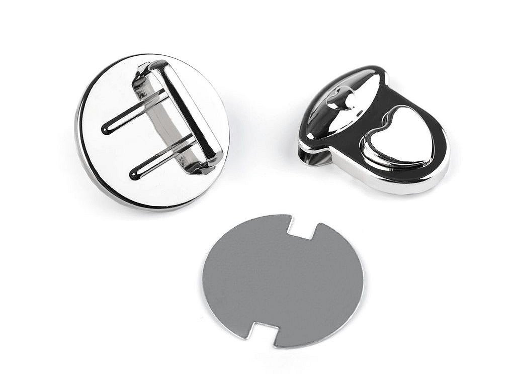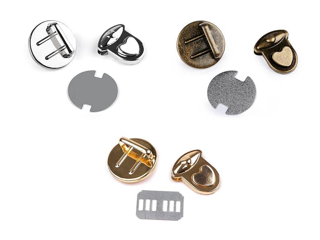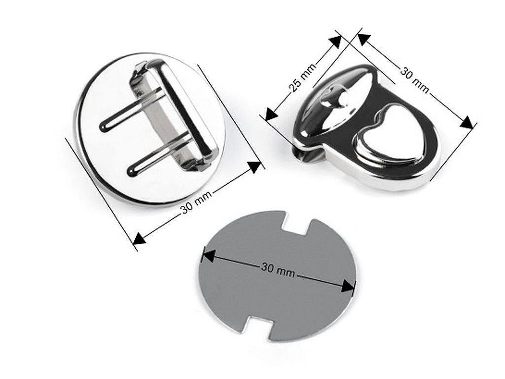 Sada zapínání na kabelku či tašku se skládá ze tří dílů. Jeden díl se připevní na vnitřní část tašky, druhý (s nožkami) na vnější část a třetí díl na její chlopeň. Díl na chlopeň se upevní tak, že rozevřete čelisti, na kterých jsou zoubky a mezi ně vložíte materiál, na který chcete zapínání upevnit. Následně čelisti sevřete, zoubky tak zamezí pohybu látky. Zapínání zdobí knoflík ve tvaru srdíčka. Rozměry viz foto: - vnitřní díl: Ø30 mm - vnější díl: Ø30 mm - díl na chlopeň: 25 x 30 mm Celkové rozměry po zapnutí jsou 30 x 32 mm.- Rozměry: 30 x 32 mm