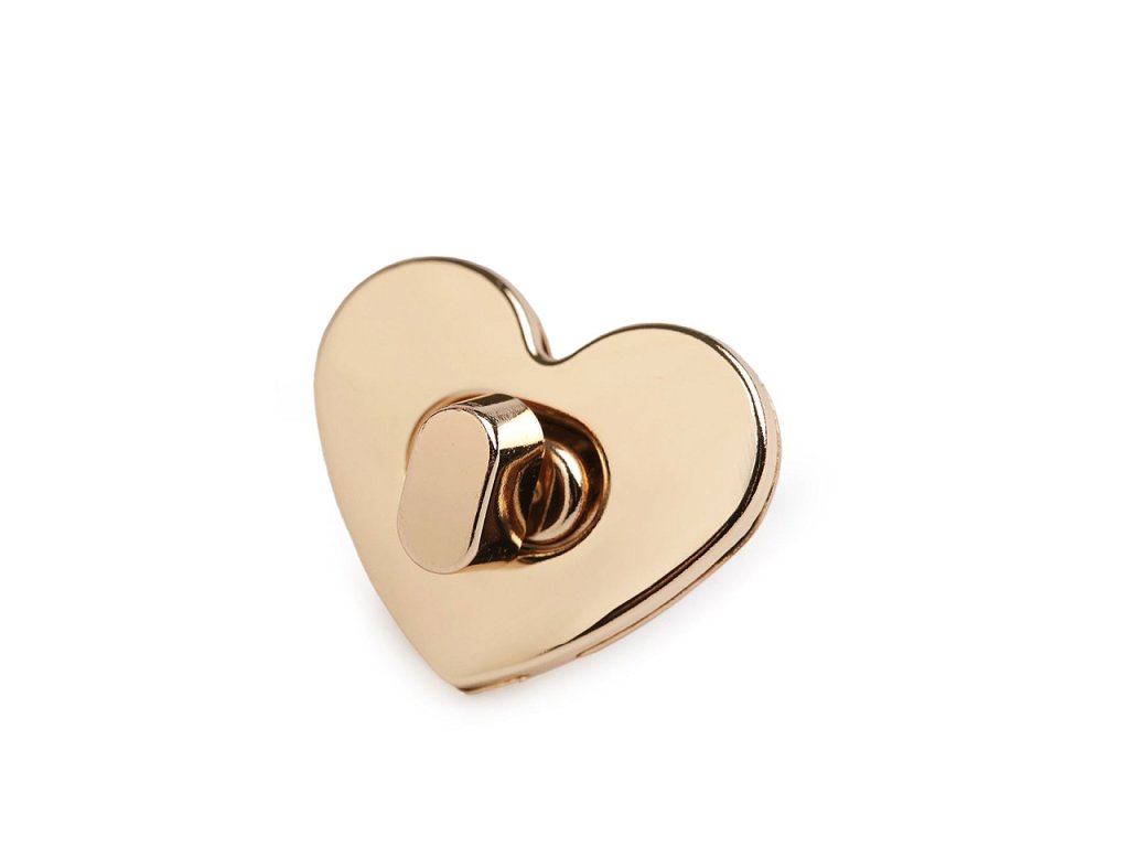 Zapínání ve tvaru srdce na kabelku či tašku se skládá ze čtyř dílů. Plíšek se připevní na vnitřní část tašky, díl s nožkami na vnější část (nožky se zaháknou do plíšku a roztáhnou). Stejným způsobem se připevní i díly se srdcem - část s nožičkami se připevní na vrchní část chlopně. Rozměry: - plíšek: 16 x 22 mm - díl s nožkami: 12 x 16 mm - díl se srdcem: 26 x 32 mm.- Rozměry: 26 x 32 mm