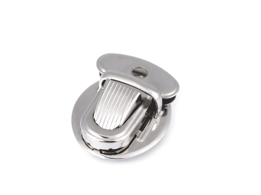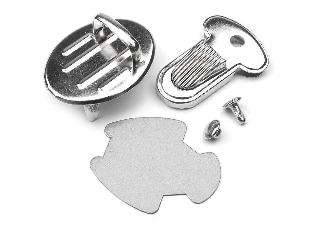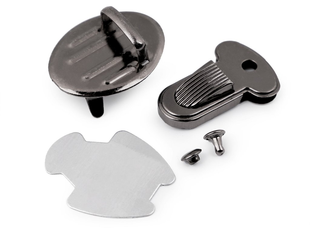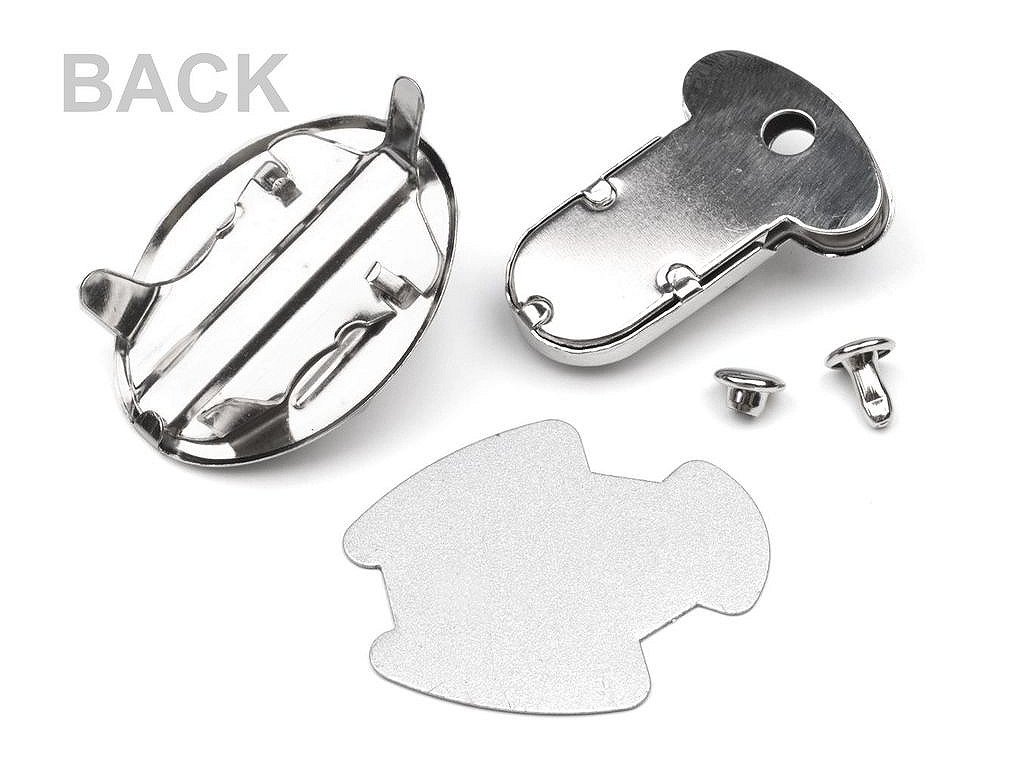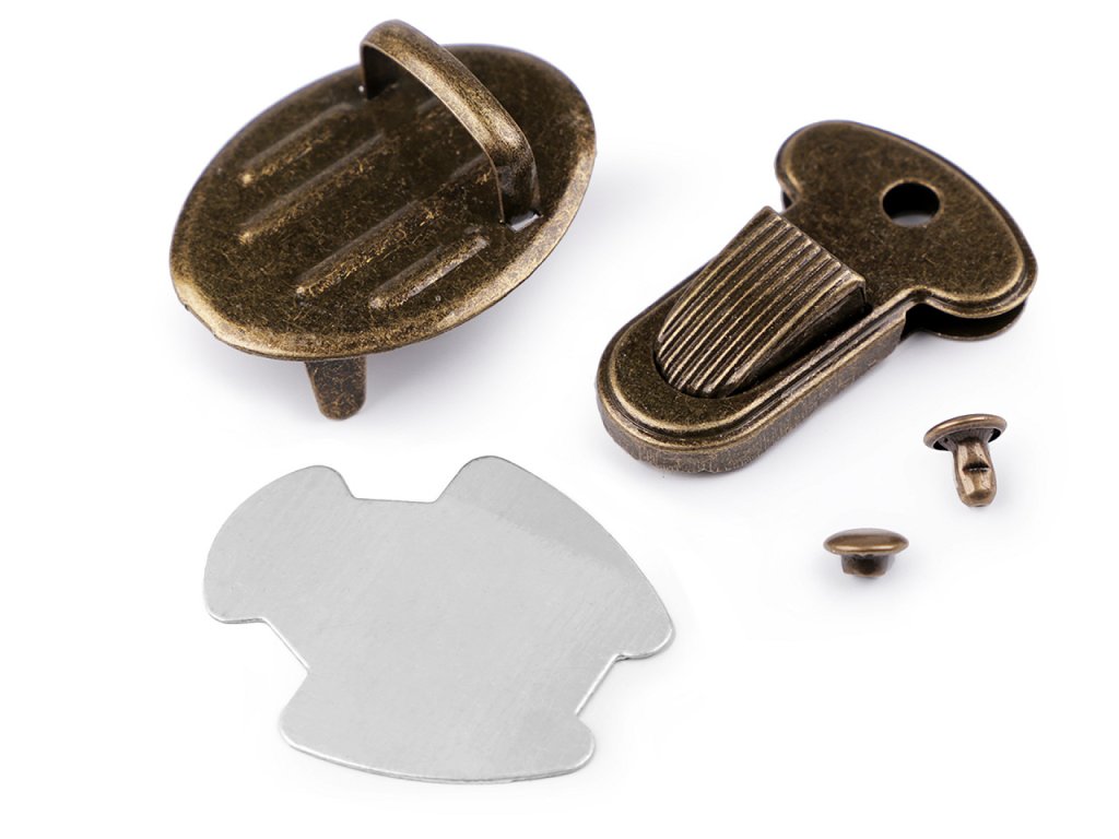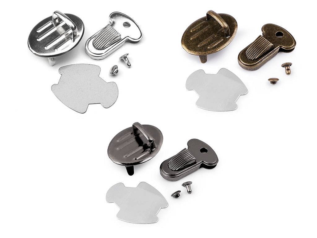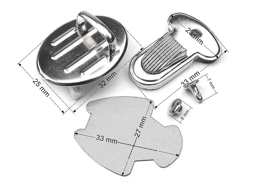 Zapínání na kabelku či tašku se skládá ze dvou dílů a plíšku. Jeden díl se připevní na na vnější část kabelky, z druhé strany se zajistí plíškem, a další díl na chlopeň kabelky. Pak už jen stačí zasunout do sebe tak, až uslyšíte cvaknutí. Potom je teprve kabelka bezpečně uzavřena.Součástí sady jsou nýtky, které patří k dílu na chlopeň.- Rozměry: 25 x 33 mm