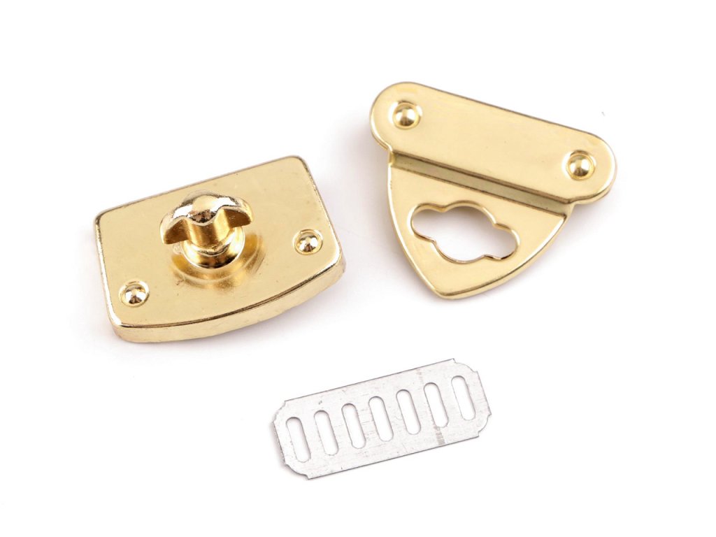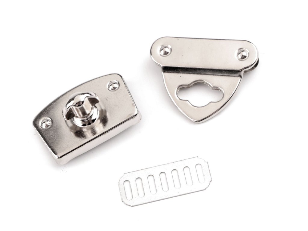 Otočné zapínání na kabelku či tašku se skládá ze tří dílů. Plíšek se připevní na vnitřní část tašky, díl s nožkami na vnější část (nožky se zaháknou do plíšku a roztáhnou) a třetí díl se zoubky na její chlopeň. Díl na chlopeň se upevní tak, že rozevřete čelisti, na kterých jsou zoubky a mezi ně vložíte materiál, na který chcete zapínání upevnit. Následně čelisti sevřete, zoubky tak zamezí pohybu látky. Rozměry: - plíšek: 12 x 30 mm - díl s nožkami: 22 x 34 mm - díl na chlopeň: 29 x 37 mm. Celkové rozměry po zapnutí jsou 32 x 37 mm.- Rozměry: 32 x 37 mm