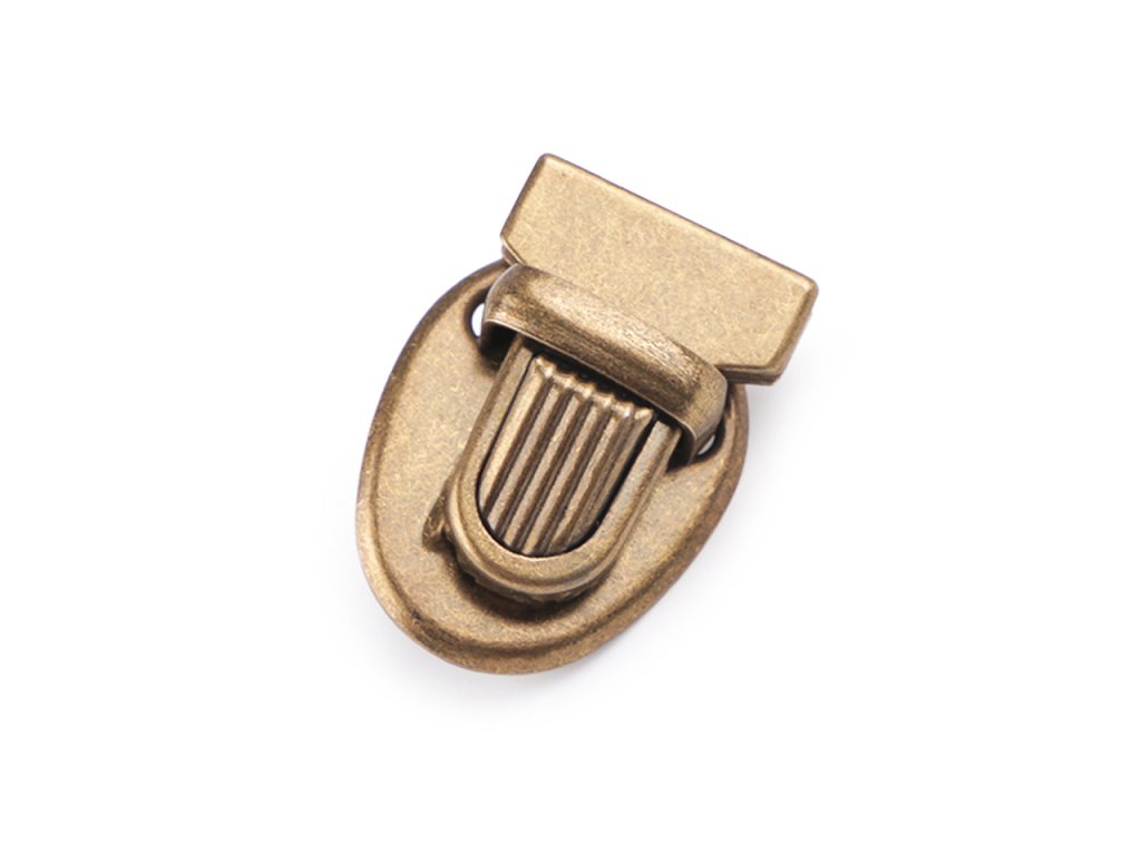 Mini kovové zapínání na psaníčko, kabelku, tašku či batůžek se skládá ze tří dílů. Plíšek se připevní na vnitřní část tašky, díl s nožkami na vnější část (nožky se zaháknou do plíšku a roztáhnou) a třetí díl se zoubky na její chlopeň. Díl na chlopeň se upevní tak, že rozevřete čelisti, na kterých jsou zoubky a mezi ně vložíte materiál, na který chcete zapínání upevnit. Následně čelisti sevřete, zoubky tak zamezí pohybu látky. Rozměry: - plíšek: 12 x 26 mm - díl s nožkami: 18 x 23 mm - díl na chlopeň: 15 x 20 mm Celkové rozměry po zapnutí jsou 18 x 24 mm.- Rozměry: 18 x 24 mm