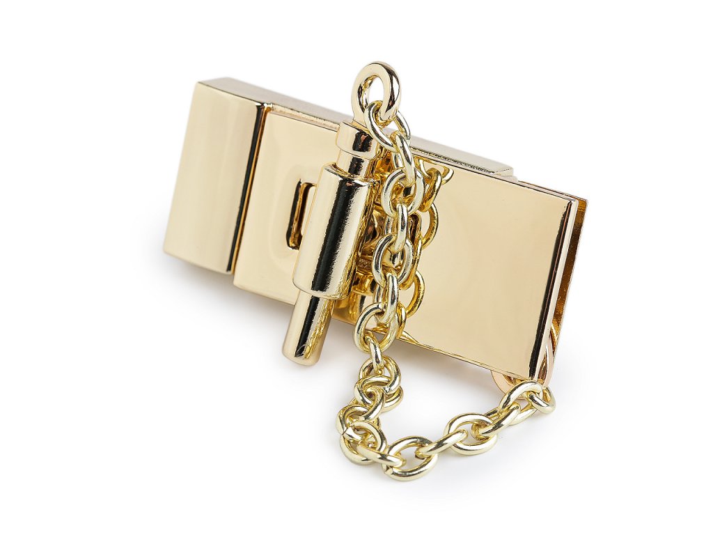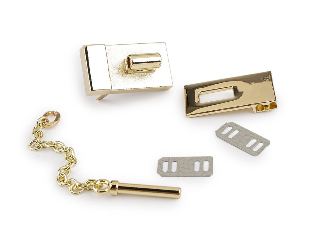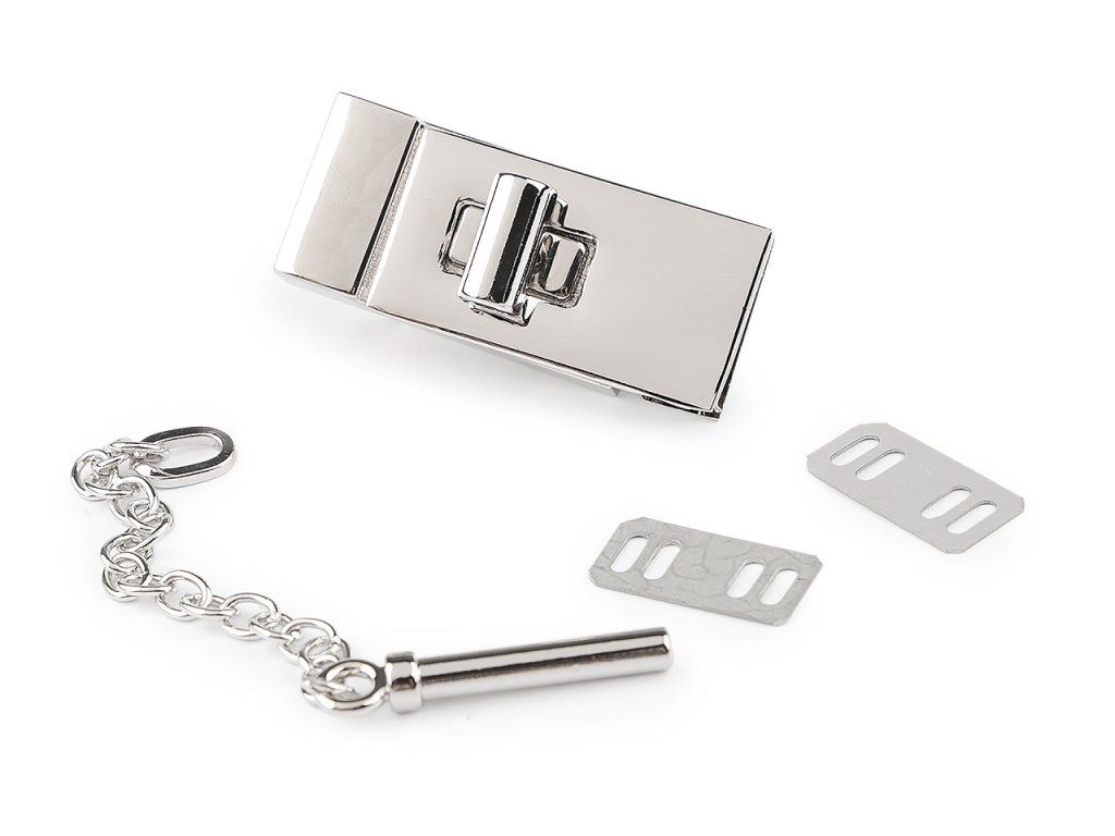 Designové kovové zapínání elegantně vynikne na taškách, kabelkách a městských batozích s klopou. Jeden díl se připevňuje pomocí přiložených šroubků a druhý díl se upevňuje nožičkami, které se z rubové strany zajistí plíšky. Zapínání se zajistí tyčinkou na řetízku, která se připevňuje v místě, kde jsou šroubky. Sada obsahuje kovové zapínání, které se skládá ze 2 kusů, 2 šroubky, 2 plíšky a tyčinku na řetízku.- Rozměry: 25 x 58 mm