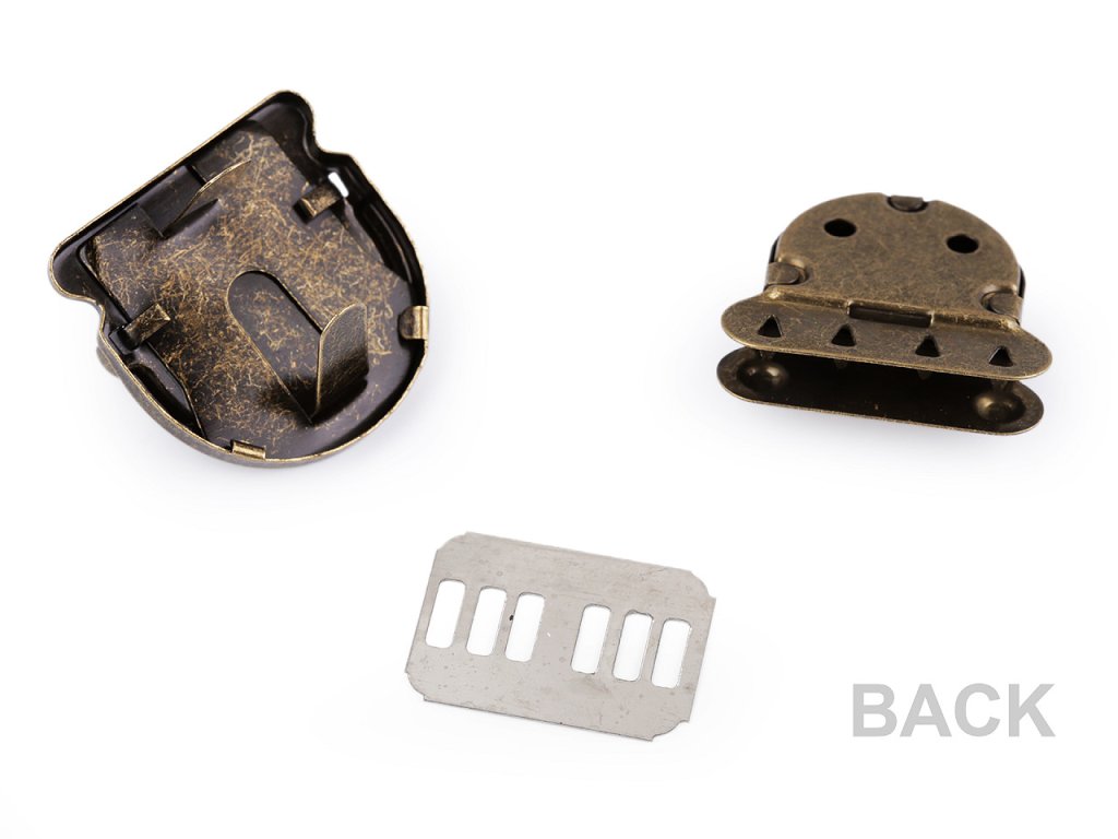 Zapínání na kabelku či tašku se skládá ze tří dílů. Díl s nožičkami se připevní na vnější část kabelky, plíšek z druhé strany na vnitřní část a třetí díl pomocí zoubků na její chlopeň. Pak už jen stačí zasunout do sebe tak, až uslyšíte cvaknutí. Potom je teprve kabelka bezpečně uzavřena. Zapínání je vyrobené z magnetizujícího kovu. Nožičky na zadní straně jsou dlouhé 15 mm.- Rozměry: 30 x 31 mm