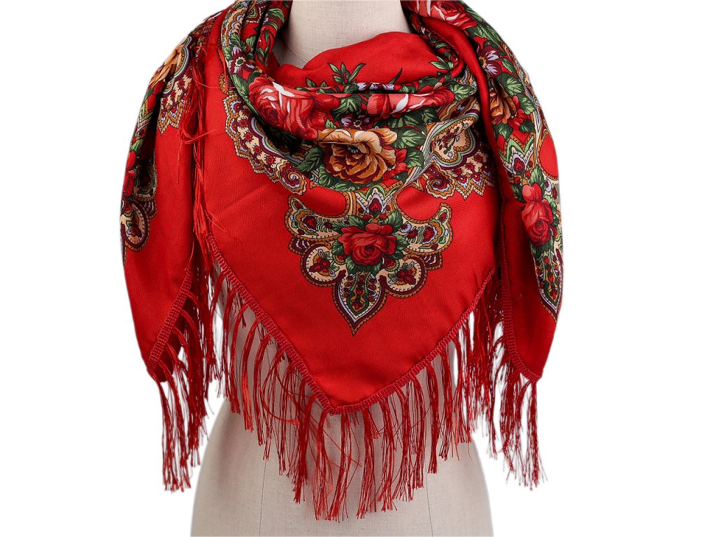 Velký folklórní šátek je doslova jako z dob našich babiček. Býval součástí tradičního oblečení a krojů. Je vyrobený z příjemného materiálu, na všech stranách je ozdobený dlouhými střapci, které krásně splývají. Velký čtvercový tvar můžete variabilně upravit, využijete jej jak při nošení pod krkem, tak i na zádech. Upozorňujeme zákazníky, že květy na šátcích se mohou lišit. Může se lišit i složení na štítcích, materiál je polyester. Děkujeme za pochopení.- Šířka: 105 cm