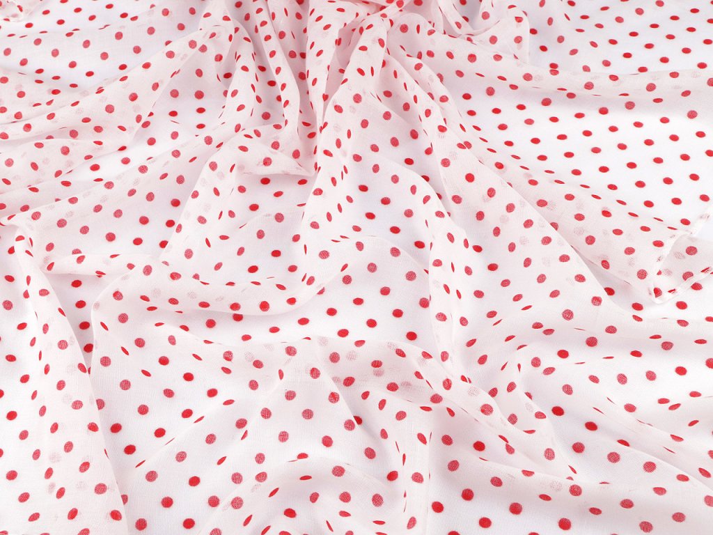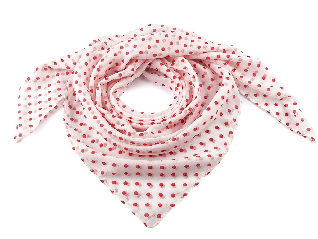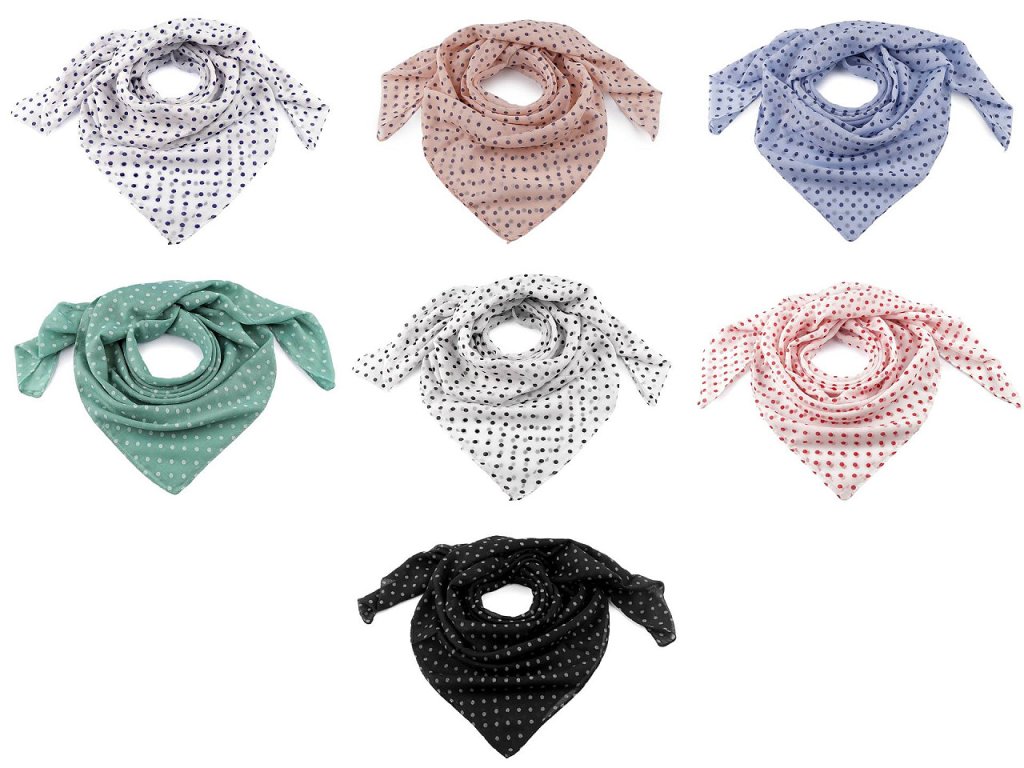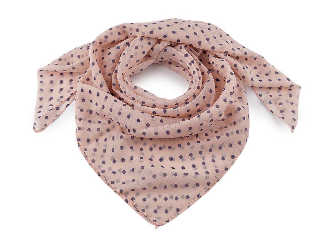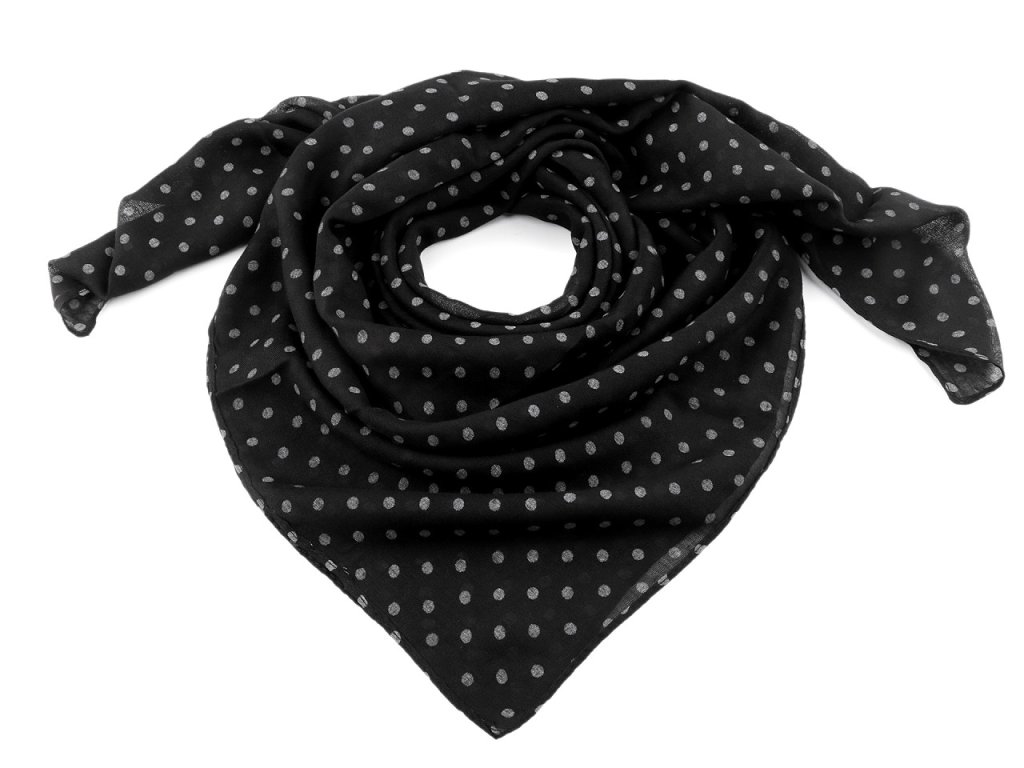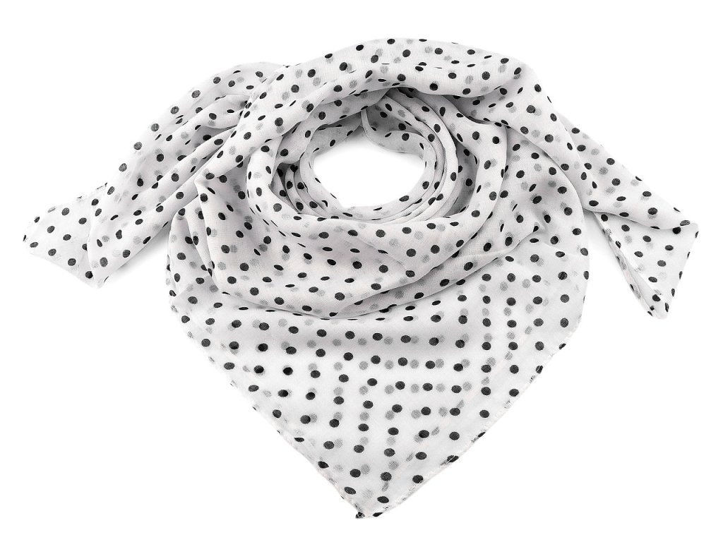 Puntíkovaný šátek je vzdušný a lehounký, velice příjemný na dotek. Je jemně průsvitný, doladí váš outfit, ať už si vezmete sako, halenku, svetřík či šaty. Šátky mohou mít špatné štítky, skutečné složení je 100% polyester.- Šířka: 85 cm