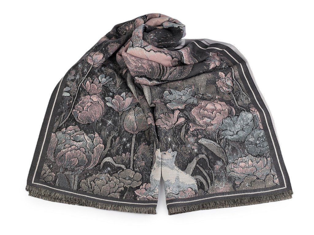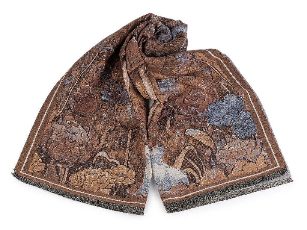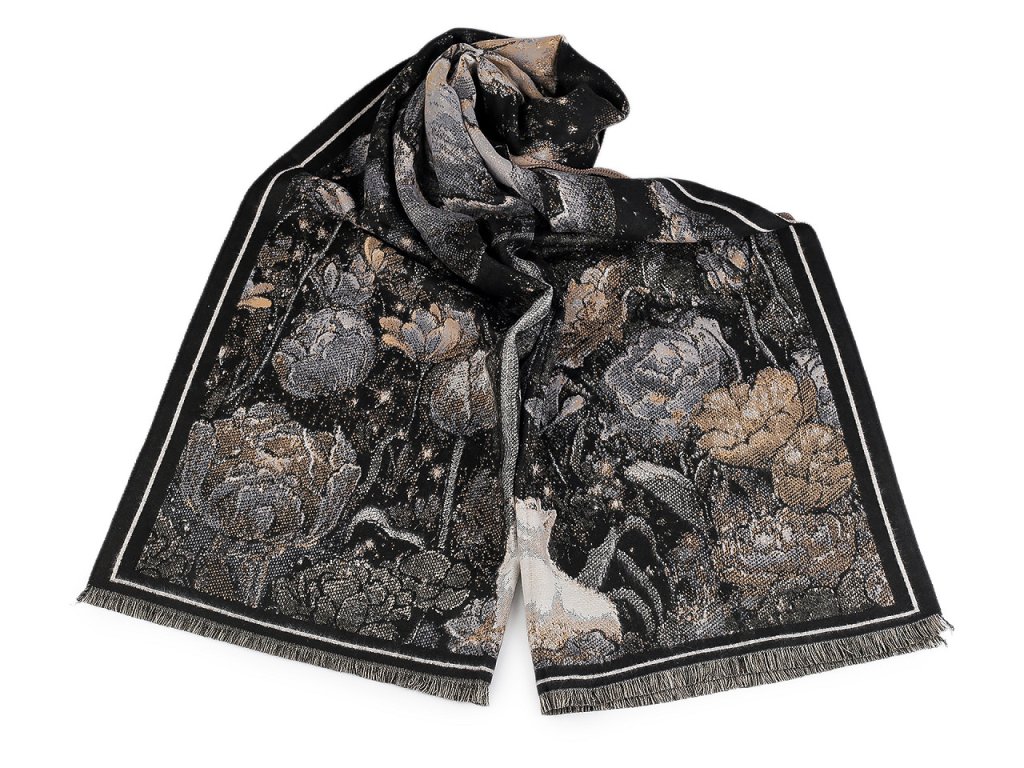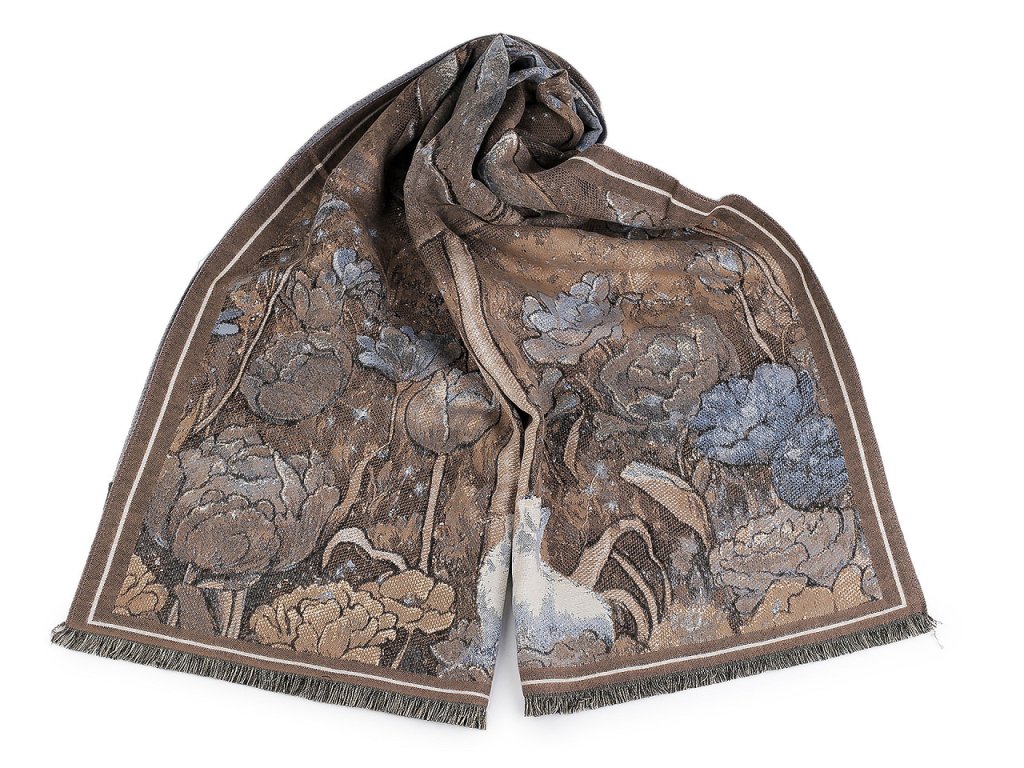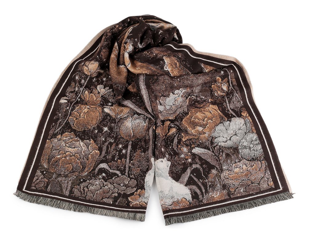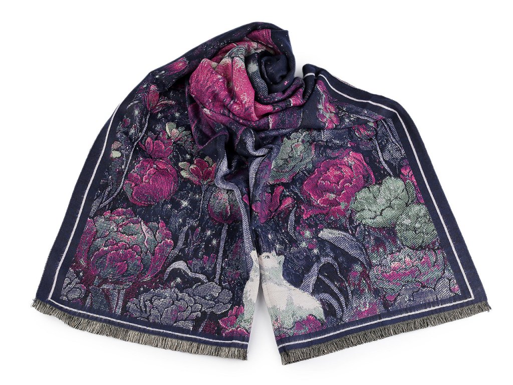 Velký luxusní šátek typu kašmír je ozdobený květinovým motivem. Je vyrobený z hřejivého materiálu, který je příjemně hebký na dotek. Perfektně vás zahřeje v chladném a sychravém počasí. Hodí se ke kabátu, bundě i svetru. Na koncích je zakončený krátkými třásněmi. Šátky typu kašmír jsou téměř dva metry dlouhé, skýtají široké možnosti při nošení. Můžete je nosit do práce i do společnosti, jejich elegantní vzhled váš outfit dokonale dozdobí. Některé šátky mají špatné štítky, skutečné složení je viskóza a polyester. Omlouváme se za toto nedopatření a děkujeme za pochopení.- Šířka: 70 cm