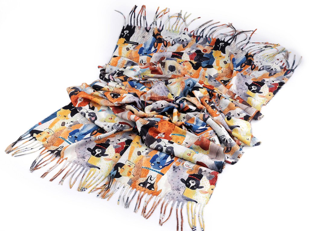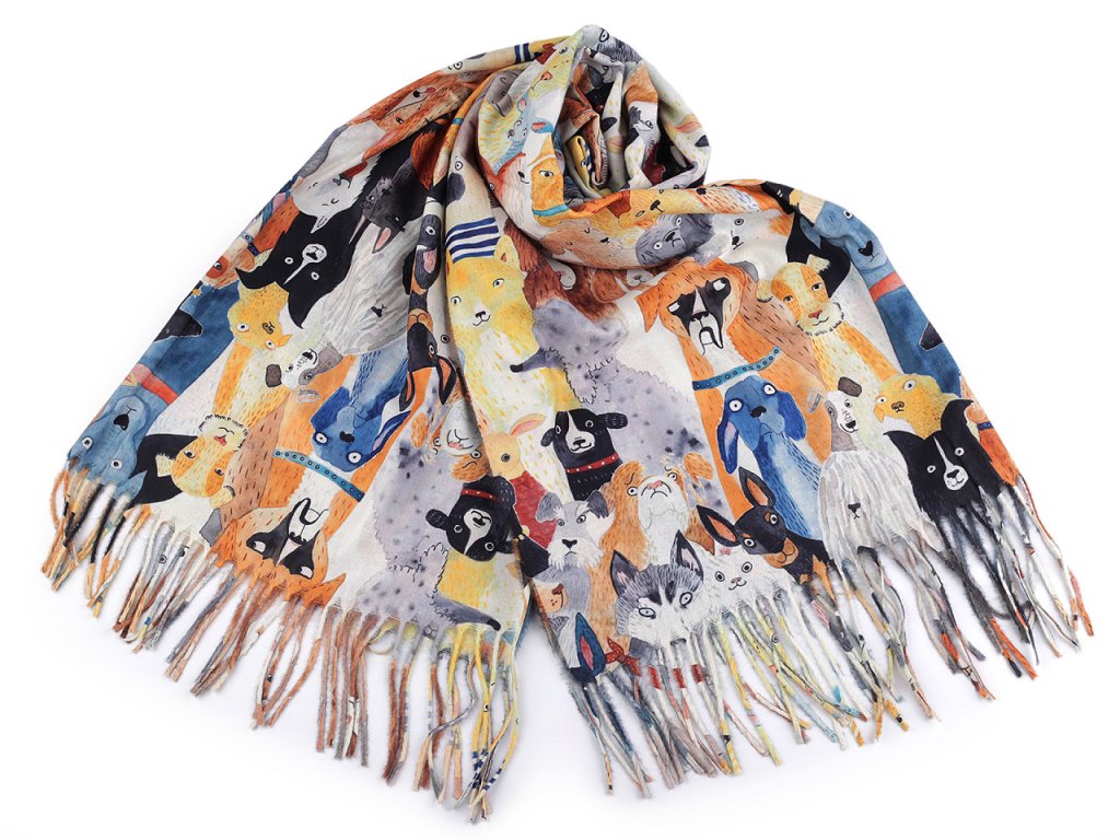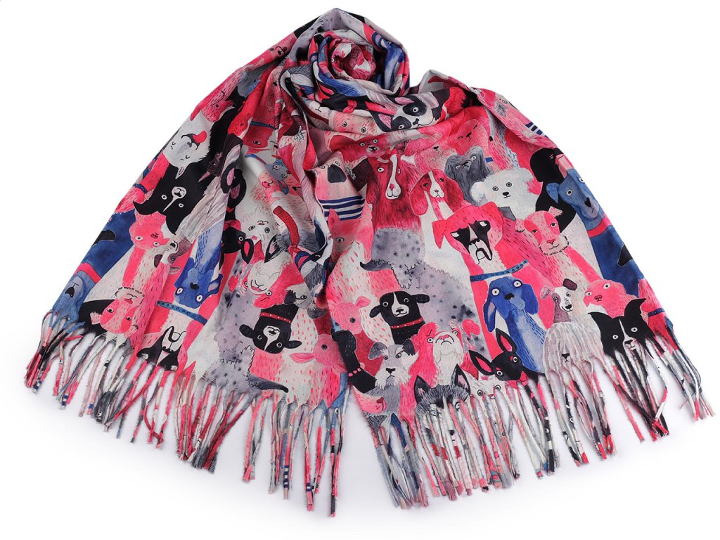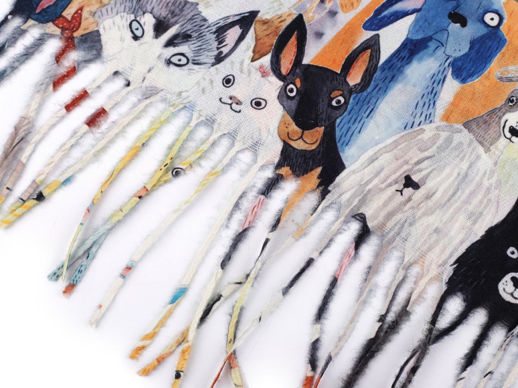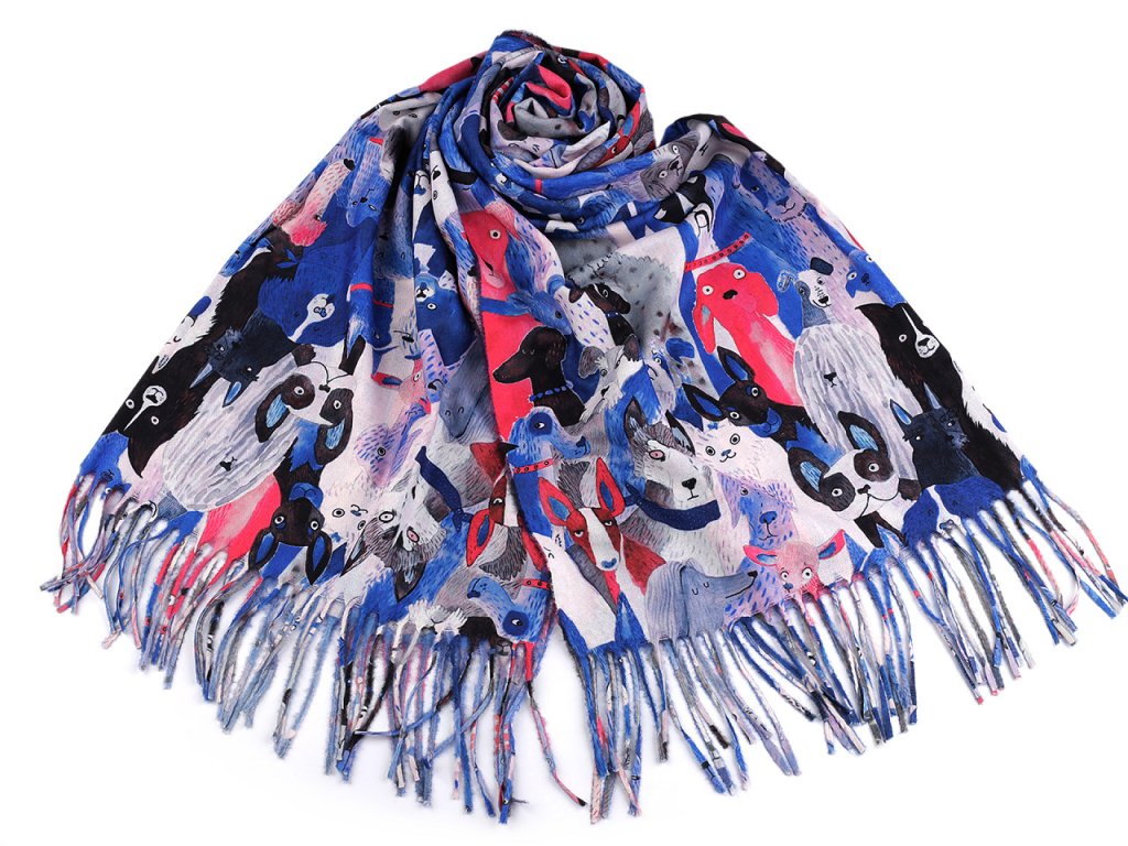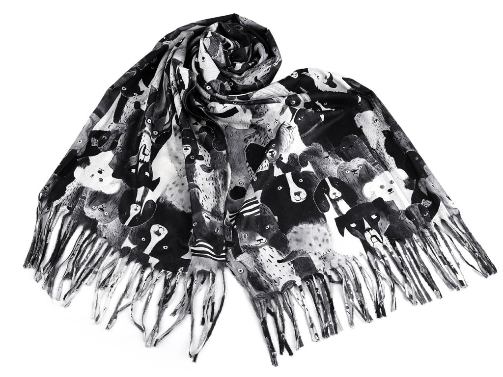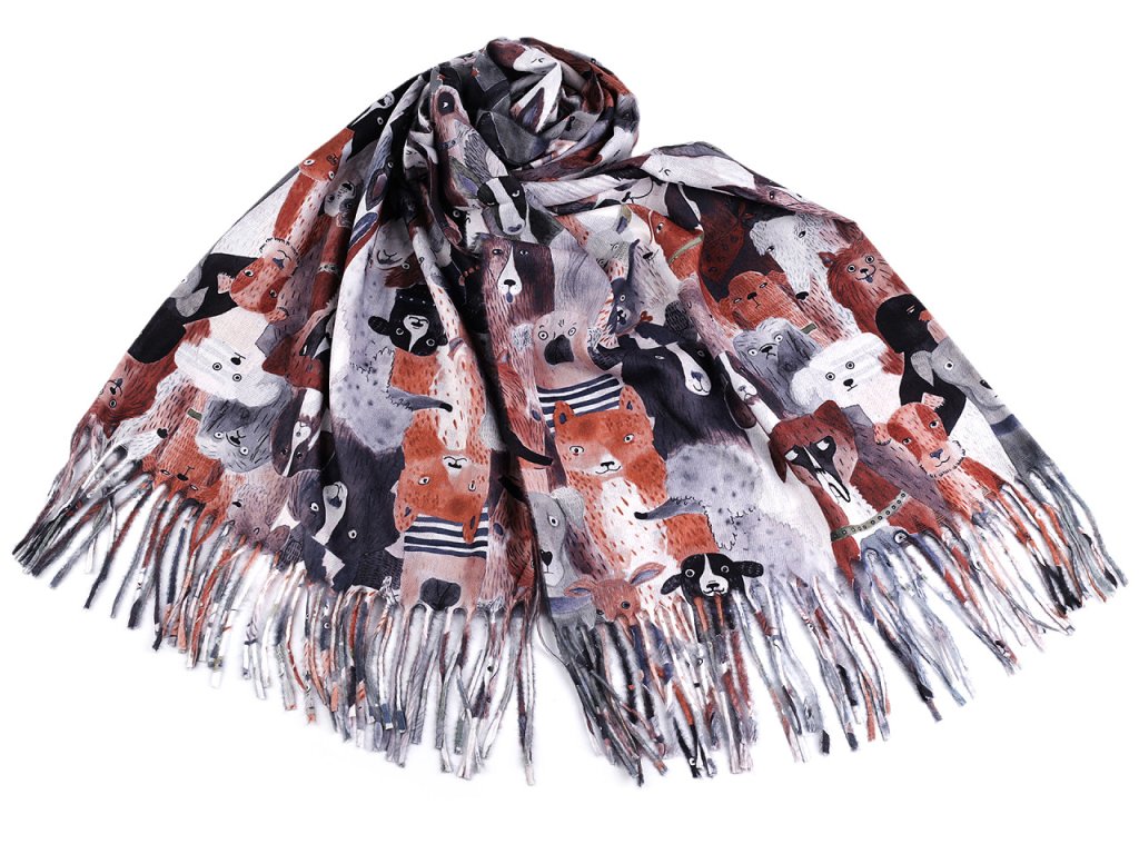 Šátek / šála typu kašmír s třásněmi, psi 70x180 cm
