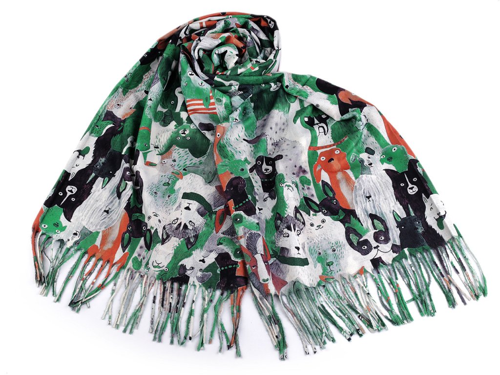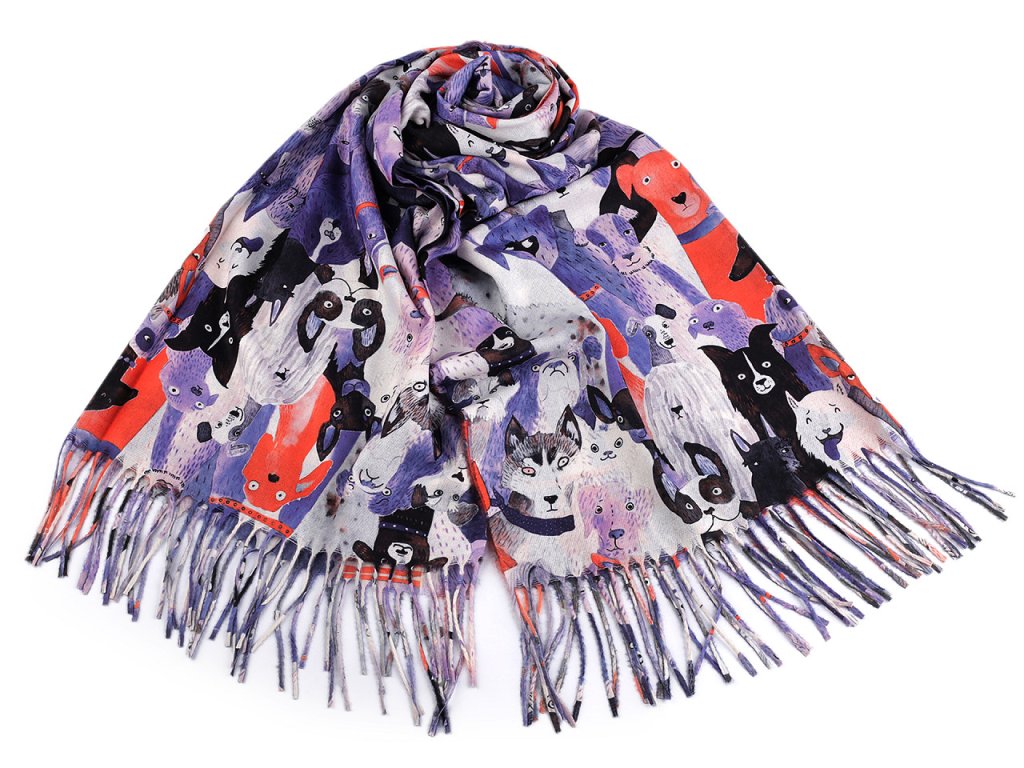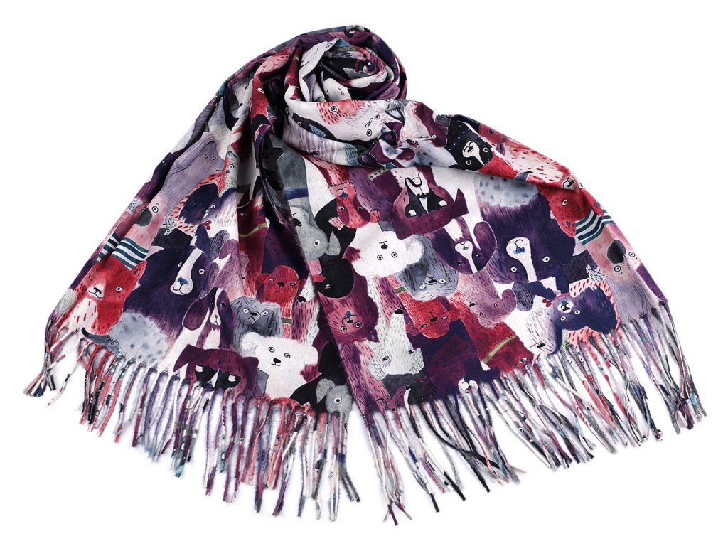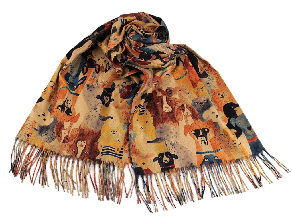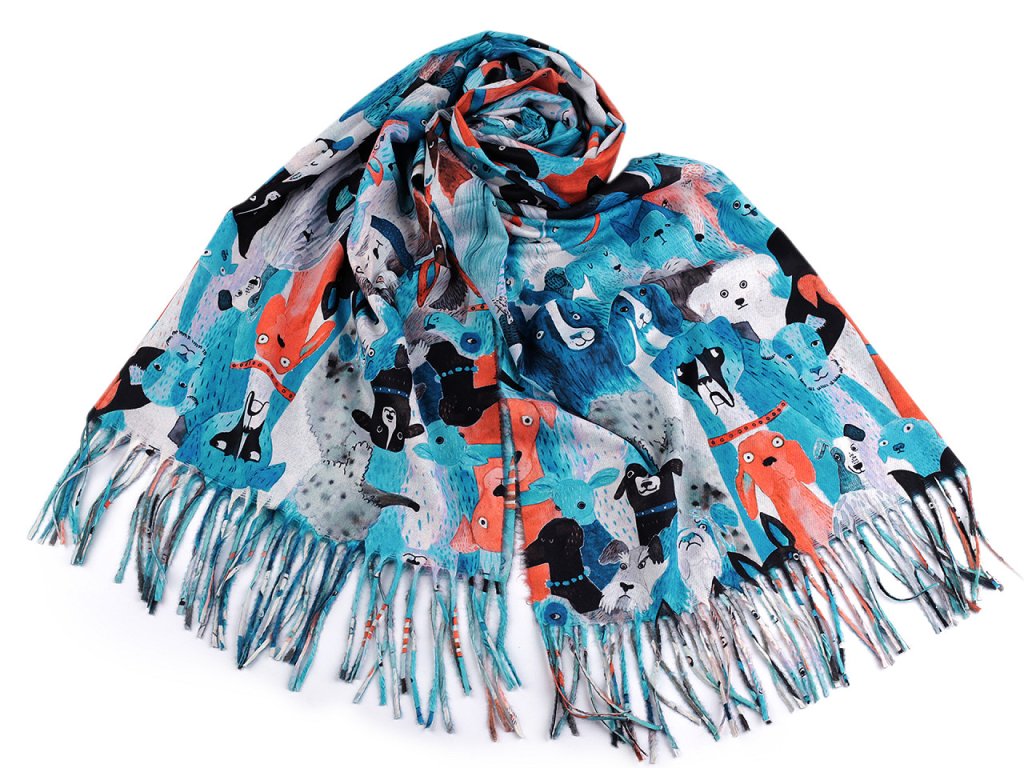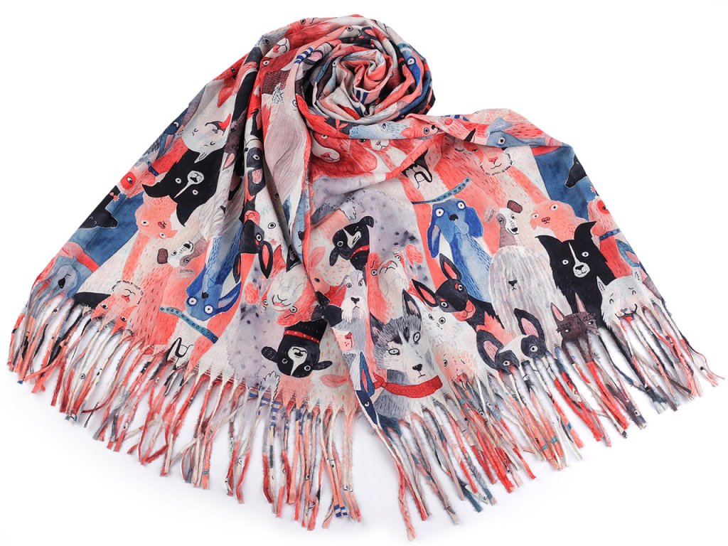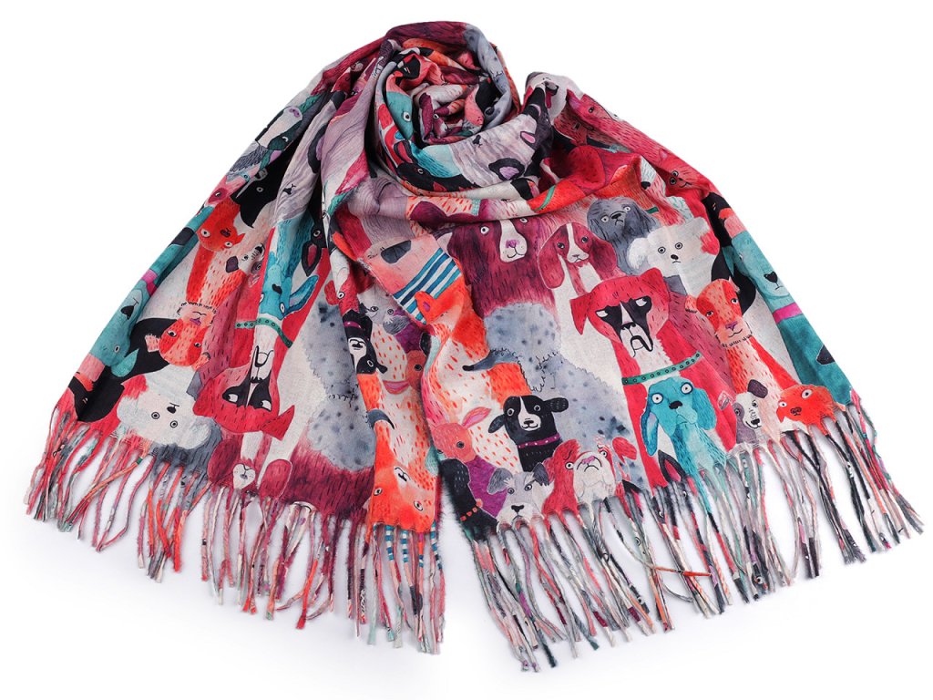 Šátek / šála typu kašmír s třásněmi, psi 70x180 cm