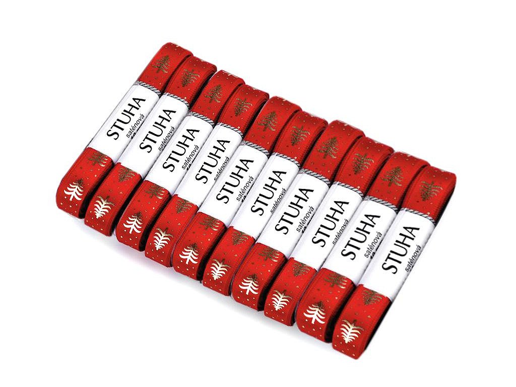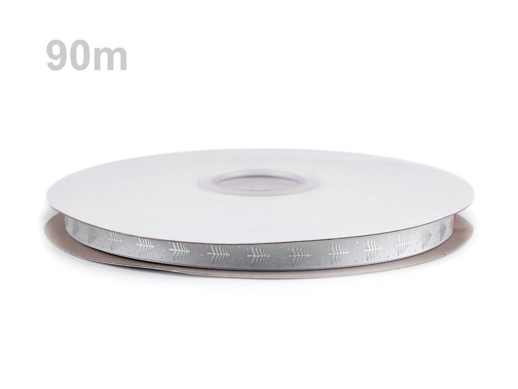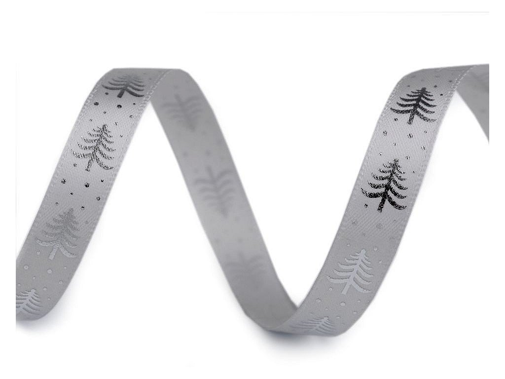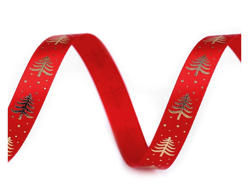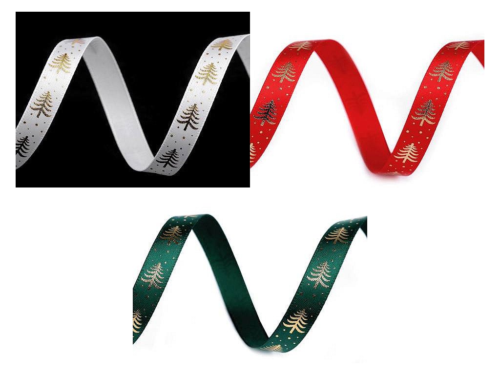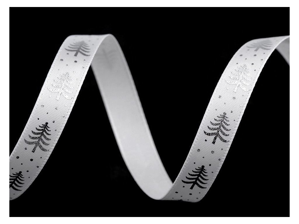 Dekorační saténová stuha s potiskem stromečků se sněhem. Potisk je jednostranný, metalický, připomíná lurex. Použití: Stuha se bude skvěle vyjímat u vánočních dekorací. Můžete ji také naaranžovat na věnce a ikebany, kterým dodá punc elegance. Vkusně s ní zabalíte i dárky. Hodí se k nalepení na přáníčka, alba, deníky apod. v technice scrapbooking. Návin 90 m na cívce dodáváme v celku. Návin 50 m je nabalený z 10 cívek po 5 m.- Šíře: 10 mm