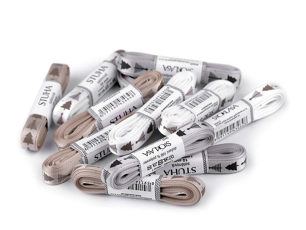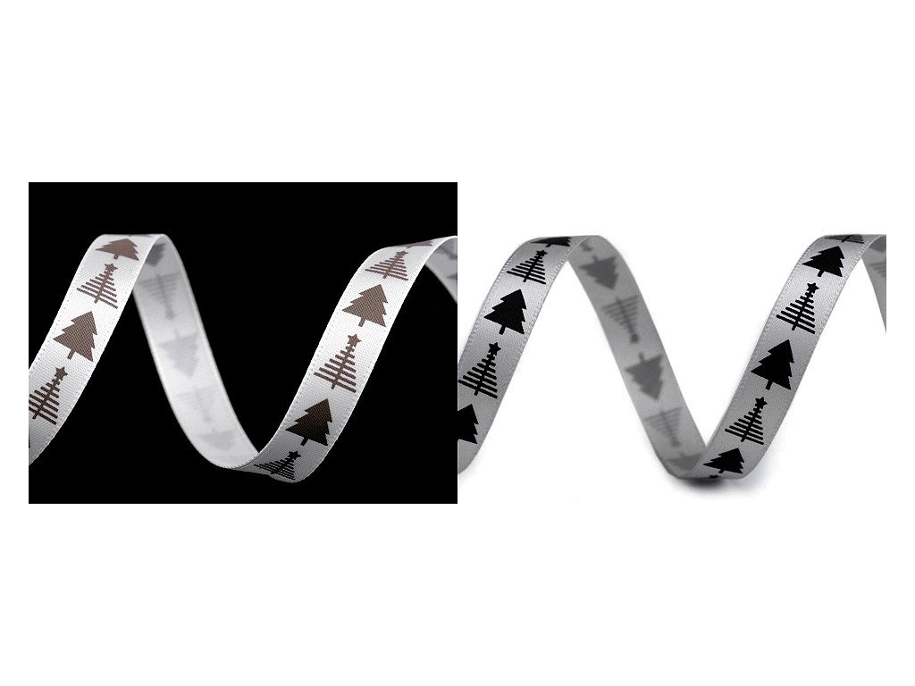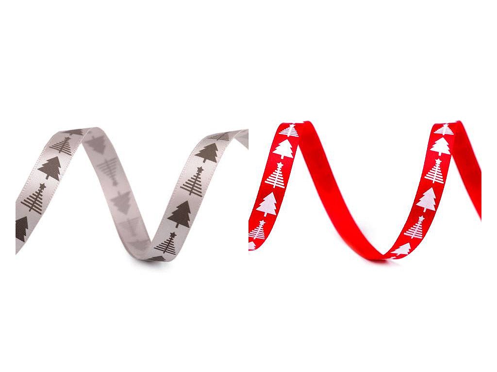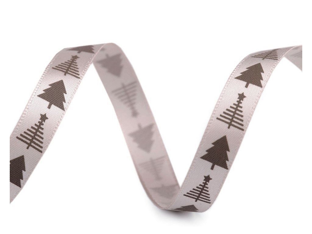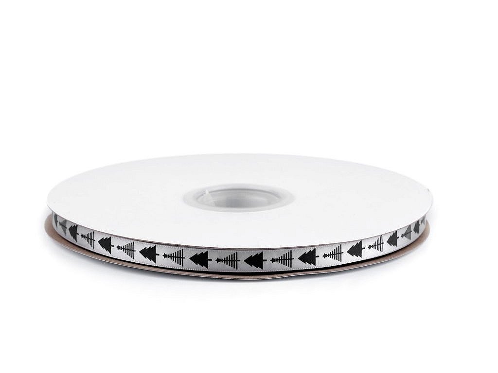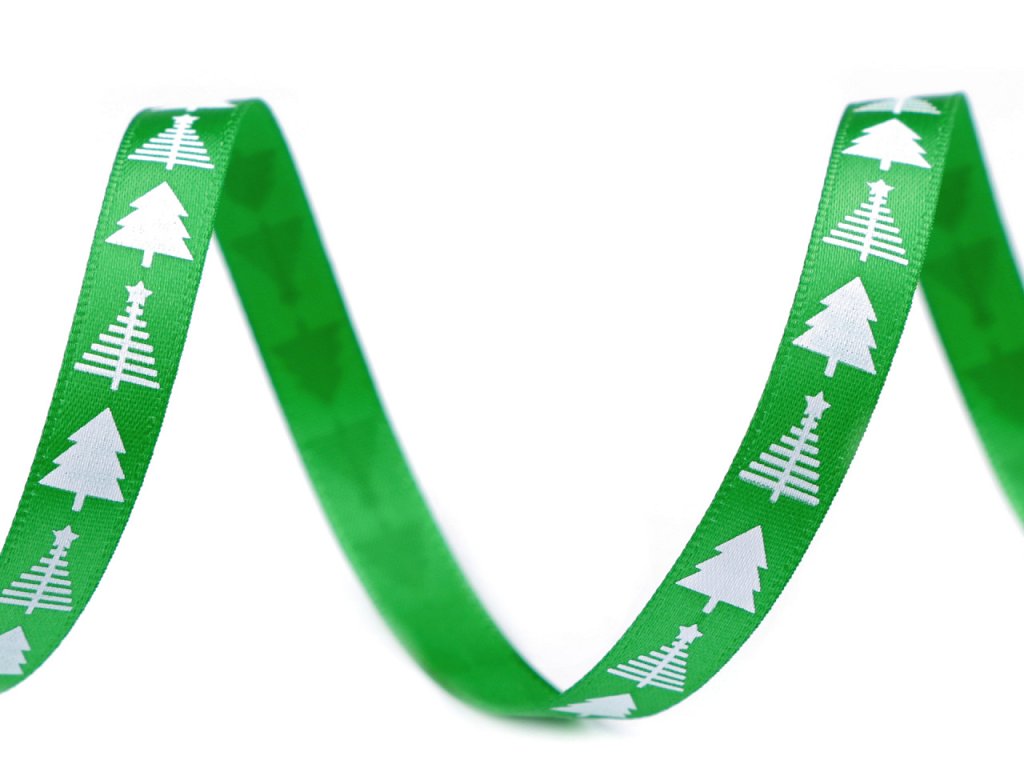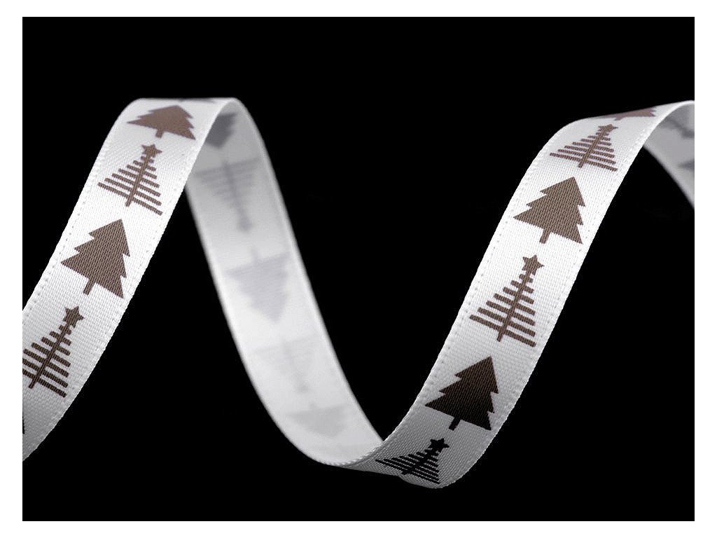 Saténová stuha s potiskem stromečků. Potisk je jednostranný. Použití: Stuhu můžete našít na oděvy nebo s ní ozdobit polštáře, ubrusy, dečky, tašky apod. Využijete ji i ve scrapbookingu k nalepení na přáníčka, alba, deníky apod. Díky ní elegantně zabalíte dárky či ozdobíte květinové vazby a věnce. Návin 90 m na cívce dodáváme v celku. Návin 60 m je nabalený ze 12 cívek po 5 m.- Šíře: 10 mm