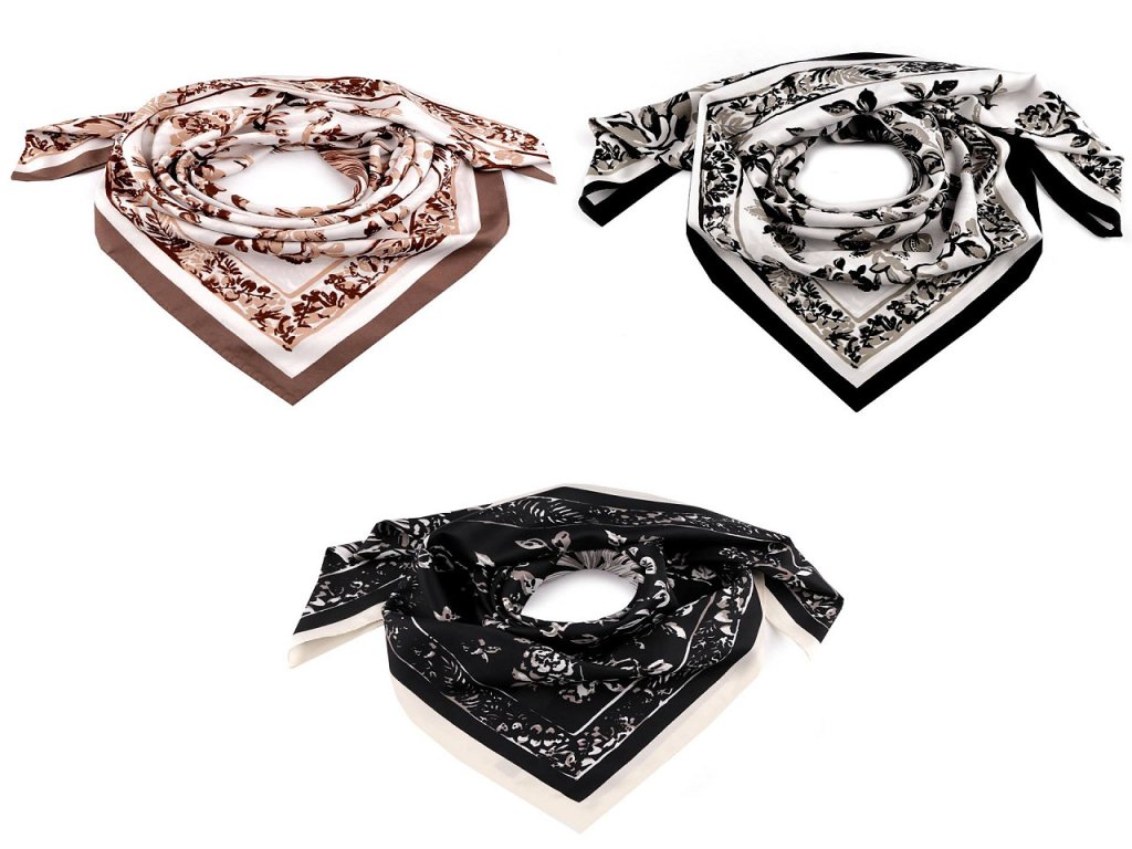 Velký saténový šátek s motivem větviček a květů využijete na každodenní nošení. Je lehounký a měkký, doslova vás bude hýčkat, protože na dotek připomíná hedvábí. Šátek můžete uvázat do slušivého uzlu, který podtrhne eleganci vašeho oděvu. Šátek je jednostranný. Některé šátky mají špatné štítky, skutečné složení je polyester. Omlouváme se za toto nedopatření a děkujeme za pochopení.- Šířka: 90 cm