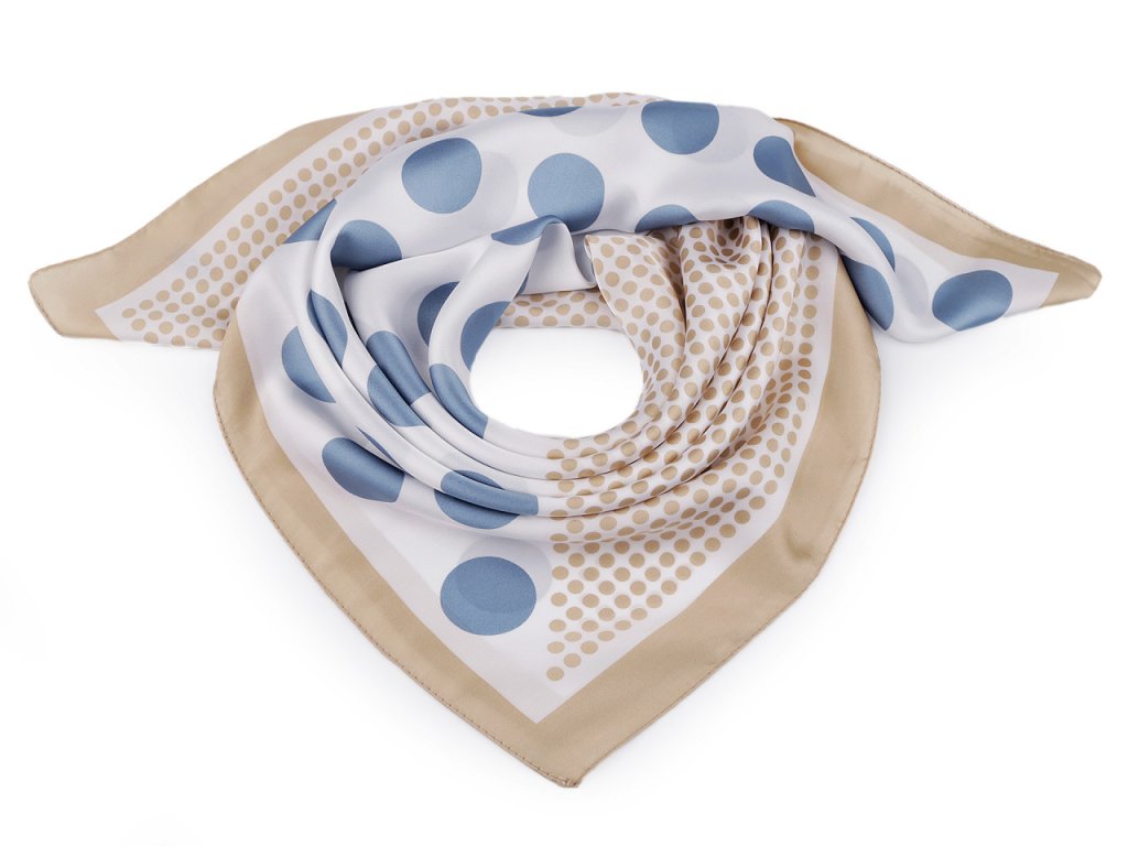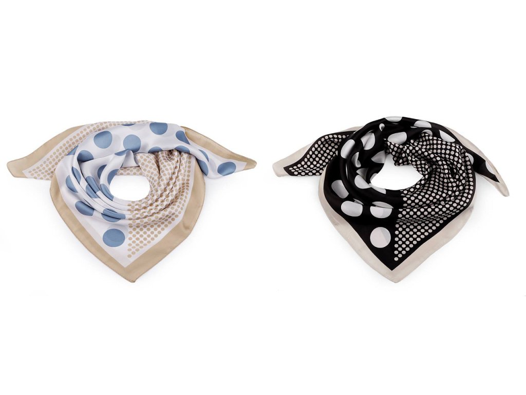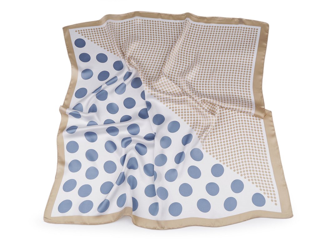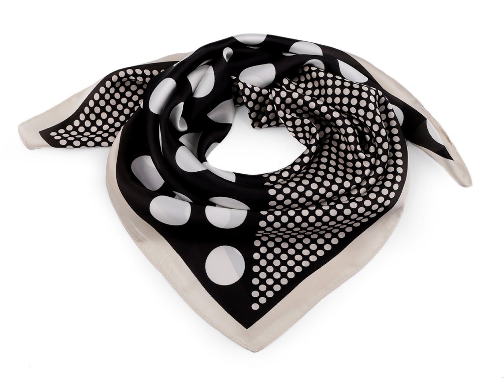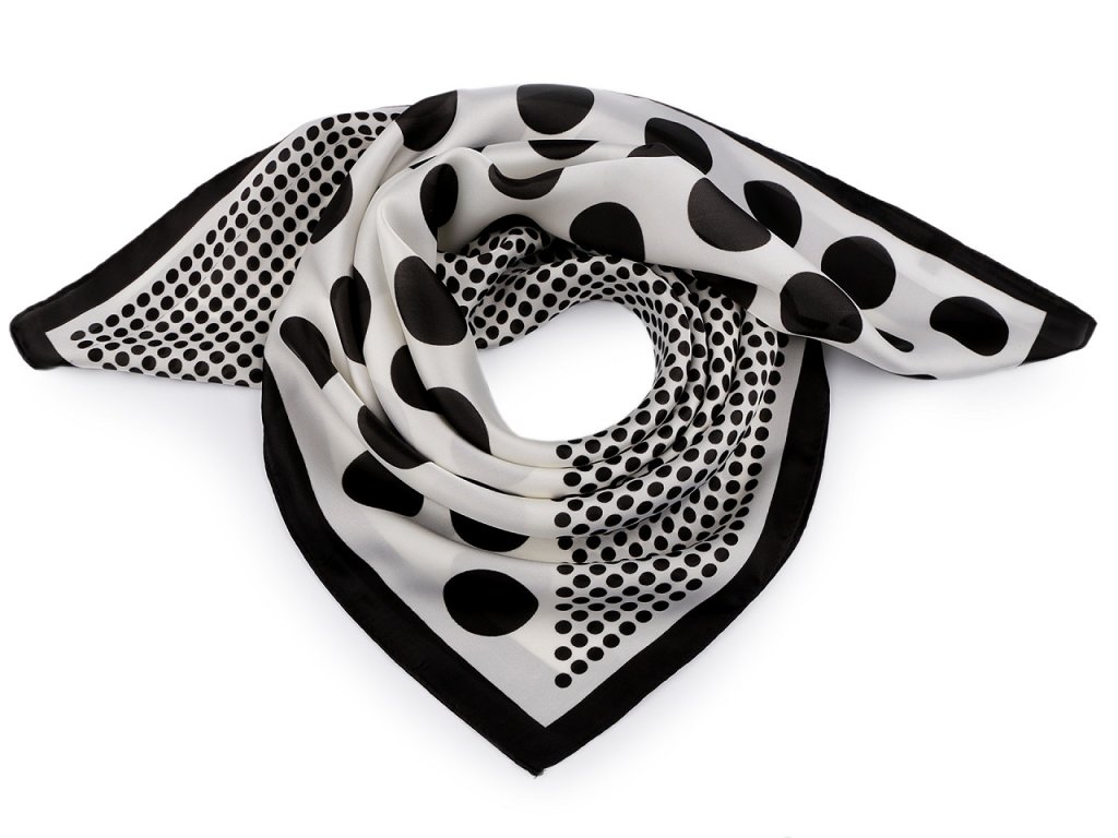 Saténový šátek s puntíky můžete uvázat do slušivého uzlu, který podtrhne dokonalost vašeho oděvu. Diagonálně je rozdělaný na dvě poloviny s různou velikostí puntíků. Oživíte s ním sáčko, halenku i tričko. Šátky mají špatné štítky, skutečné složení je polyester. Omlouváme se za toto nedopatření a děkujeme za pochopení.- Šířka: 70 cm