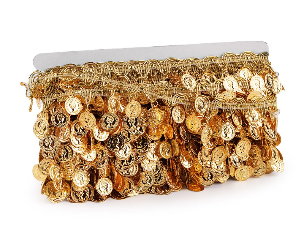 Shakira leonský prýmek s penízky je okouzlující dekorativní prvek, který upoutá svou jedinečností a elegancí. Je typický svými zavěšenými kovovými penízky s reliéfem hlavy, které při pohybu jemně cinkají. Určitě jej znáte z kostýmů břišních tanečnic, kterým pomáhá zvýraznit jejich pohyb při tanci. Prýmek je pevný, jednostranný, díky lurexu působí velmi elegantně. Celková šíře prýmku i s penízky je 38 mm. Šíře lurexové části je 18 mm. Penízky mají průměr 15 mm. Použití: Prýmek můžete našít na lemy halenek a sukní. Oceníte jej na výrobu šátků pro břišní tanečnice, hodí se i na ozdobení tanečních a karnevalových kostýmů. Je také je skvělou volbou pro dekoraci interiérů, například na ozdobení polštářů, závěsů a jiných textilních doplňků.- Celková šíře: 38 mm