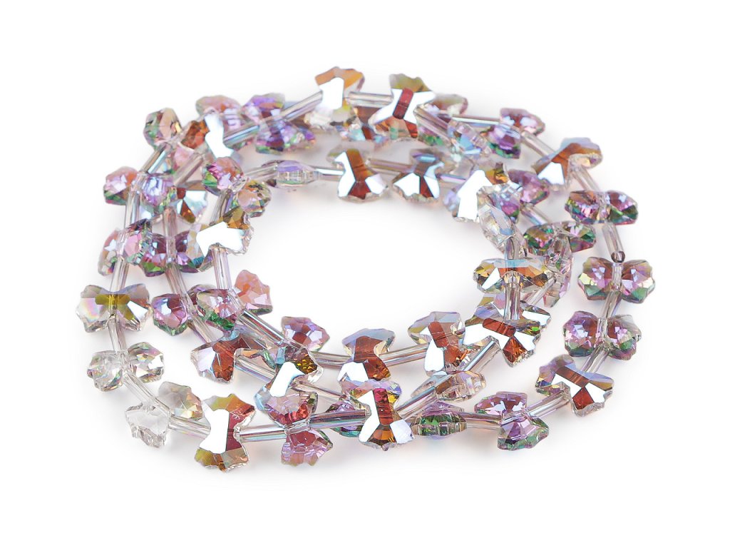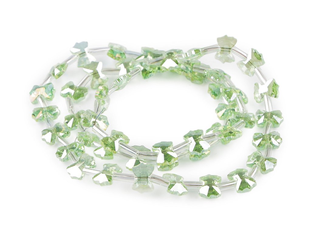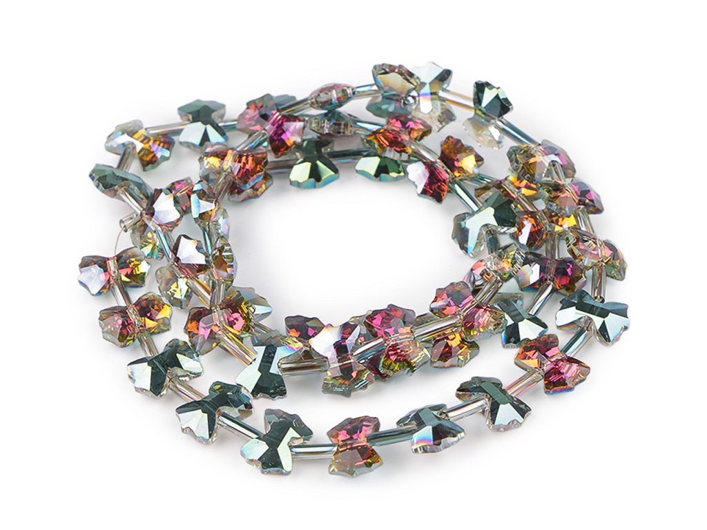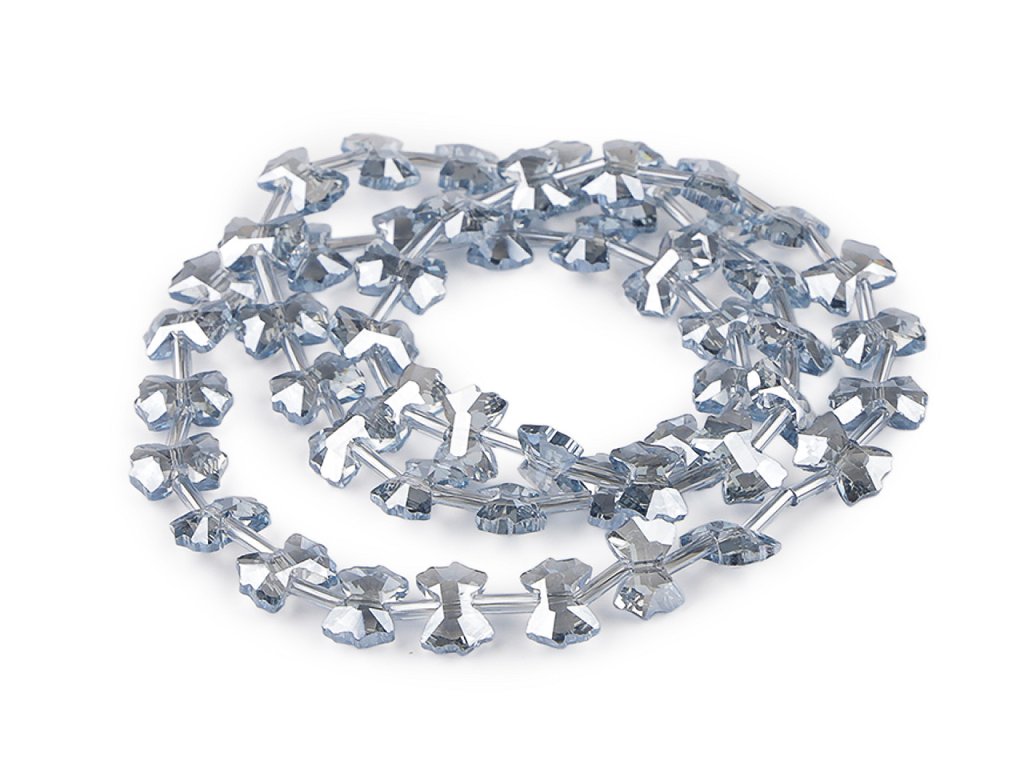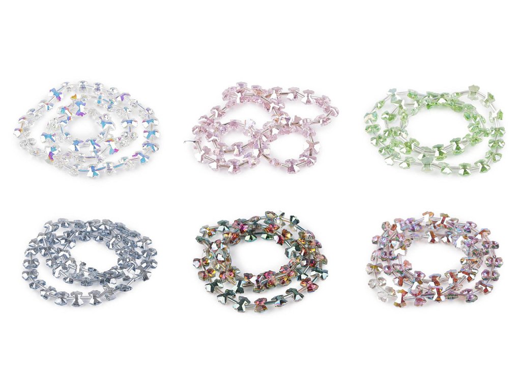 Skleněné broušené korálky mašličky jsou velice zajímavé svými třpytivými odlesky i tvarem. Jsou navlečené na drátku a zkombinované s hladkými tyčkami dlouhými 6 mm. Využijete je na ketlování, do šitých šperků, na drátování apod. Jsou také vhodné pro použití v různých hobby projektech, kde mohou posloužit jako detailní ozdoba. Jejich luxusní vzhled oceníte při tvorbě náušnic, náhrdelníků i náramků. Budou úchvatné i jako detail na prstýnku. 1 sáček obsahuje cca 50 ks mašliček a 50 ks tyček navlečených na jemném drátku. Návlek je dlouhý cca 47 cm. Hmotnost sáčku i s korálky je 18 g.- Rozměry mašle: 7 x 10 x 3,5 mm