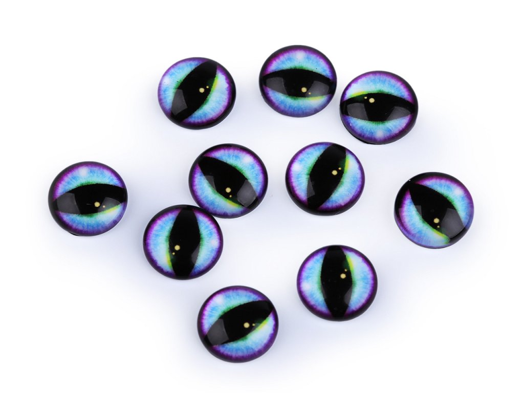 Kulaté skleněné oči s motivem kočičího / dračího oka mají kvalitní zpracování. Díky tvaru vypouklé čočky obrázek oka krásně vynikne. Využijete je na tvorbu různých postaviček a zvířátek. Pro jejich přilepení je vhodné použít lepidlo na lepení kamínků. S oblibou se používají i na výrobu bižuterie, jako kabošony jsou vhodné k nalepení do kovového lůžka nebo k obšití korálky a rokajlem. Velice působivé jsou v drátovaných špercích.- Průměr: č. 1; 2; 9-12: 10 mm
