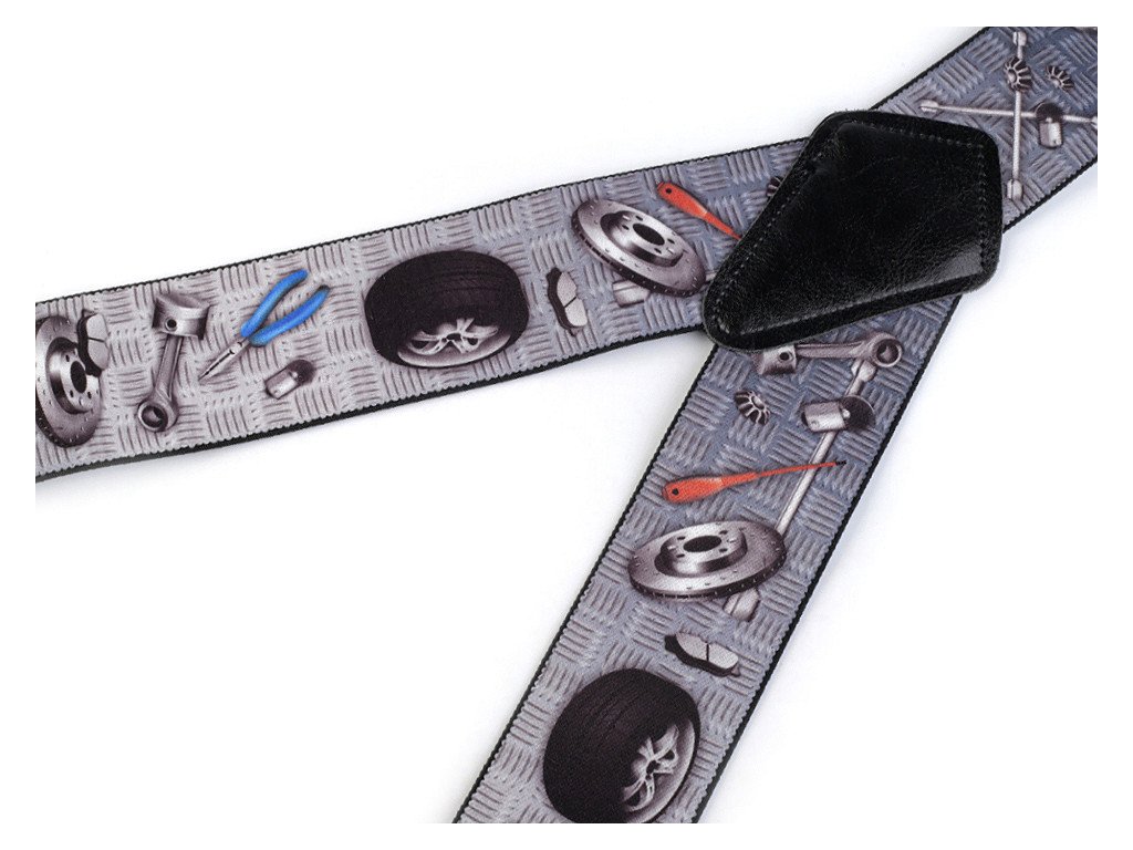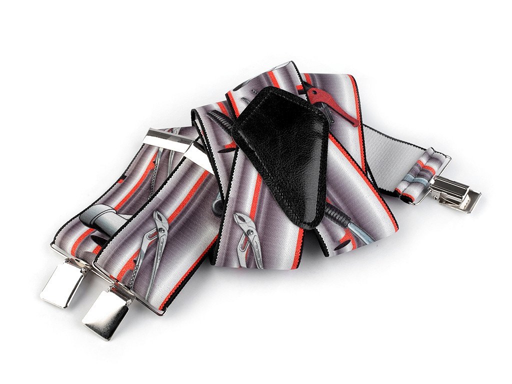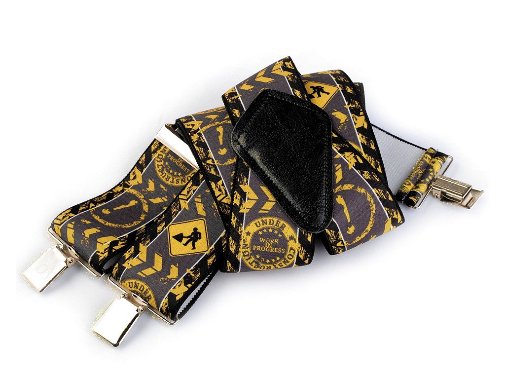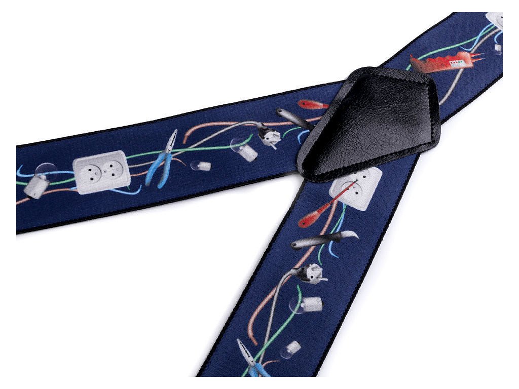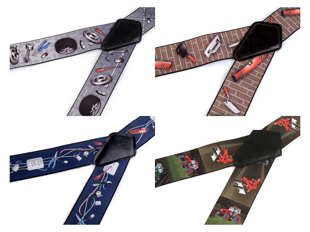 Kšandy s potiskem s řemeslnickými motivy potěší jak muže profesionály, tak domácí kutily. Kšandy bývají nedílnou a zároveň praktickou součástí jejich oblečení. Jsou kvalitní české výroby, elastický materiál umožňuje pohodlné nošení. Zadní vsadka z eko kůže jim dodává stylový vzhled. Ke kalhotám se upevňují na tři žabky - dvě vpředu a jednu vzadu. Kšandy č.1 mají motiv Instalatér. Kšandy č.2 mají motiv Automechanik. Kšandy č.4 mají motiv Zedník. Kšandy č.5 mají motiv Elektrikář. Kšandy č. 6 mají motiv Traktor.- Šířka: 5 cm