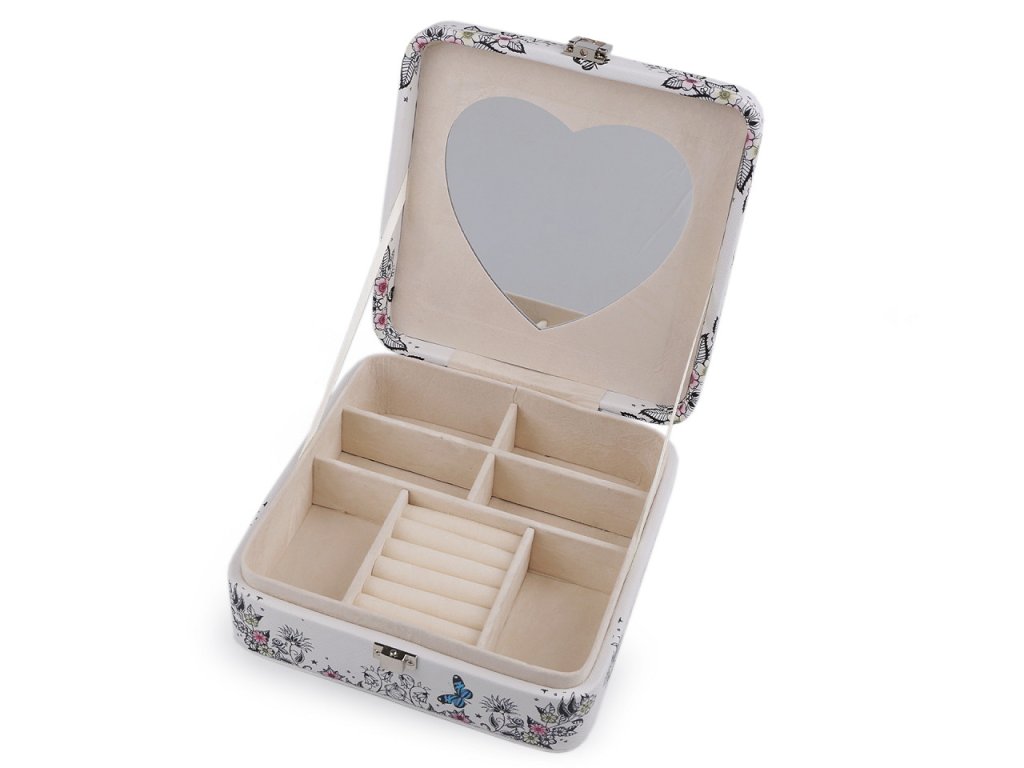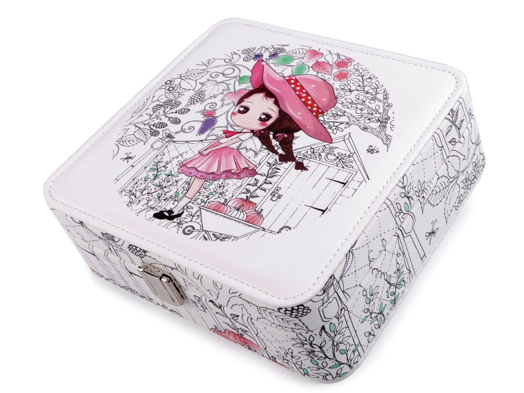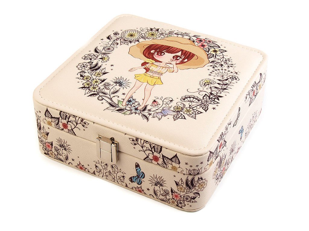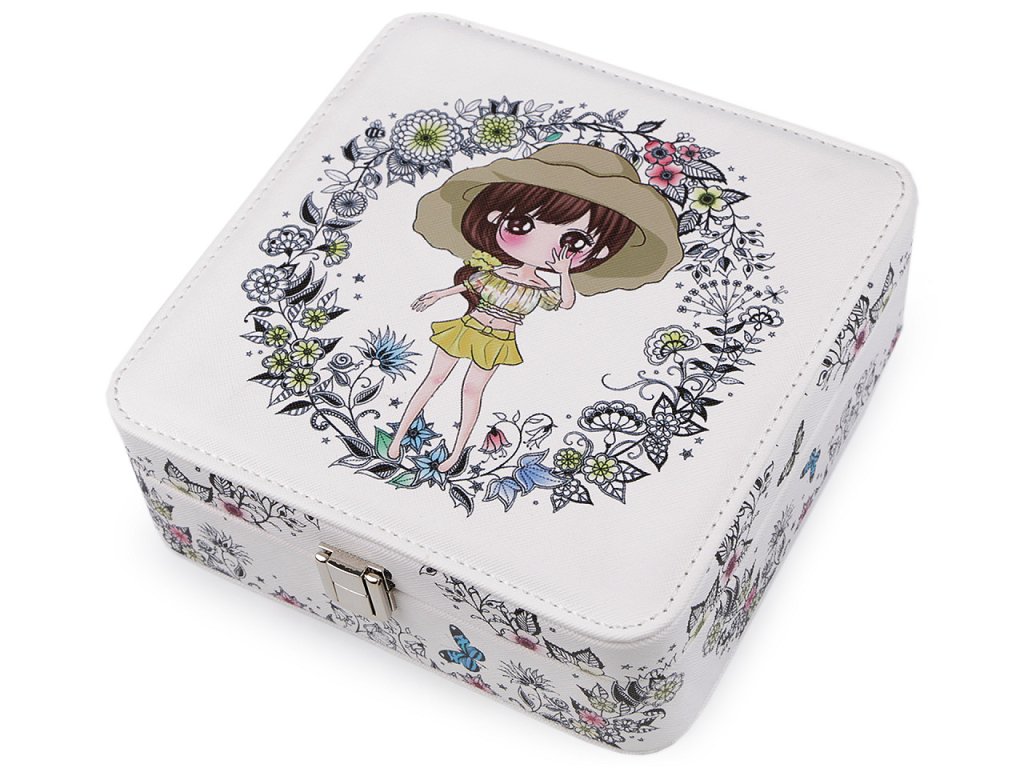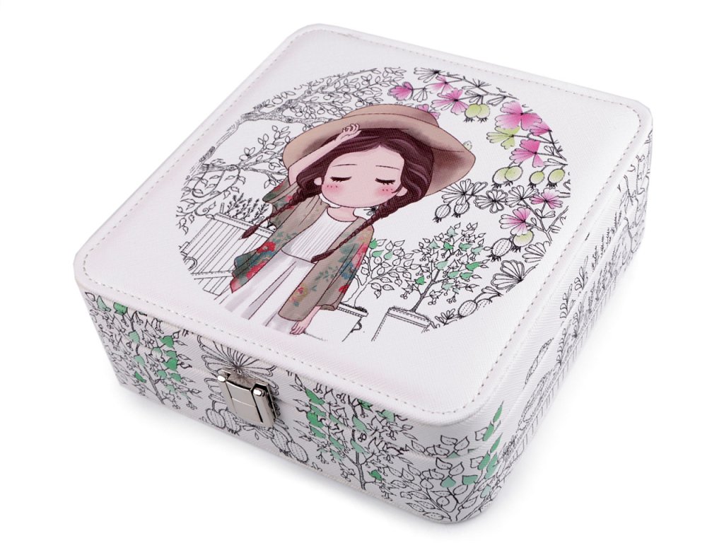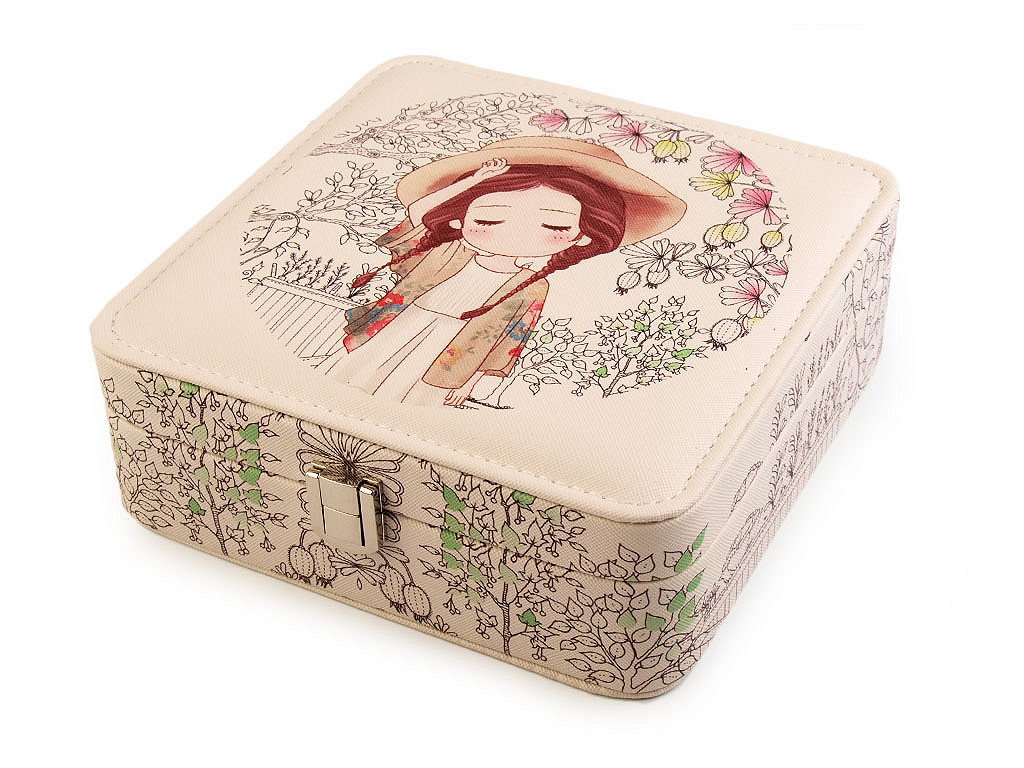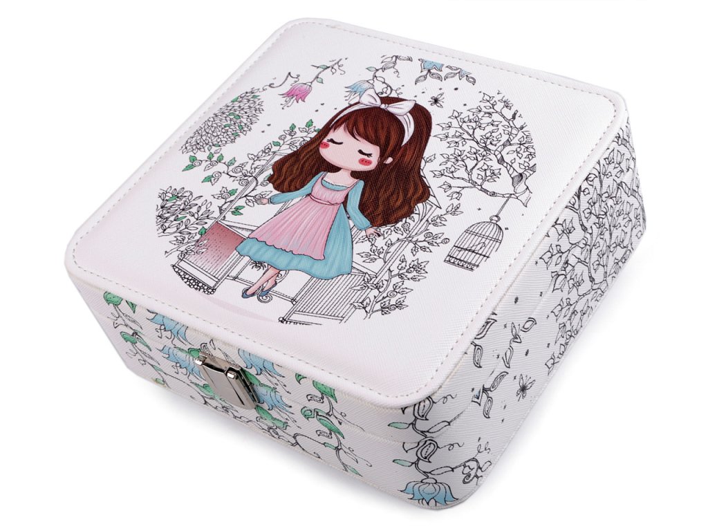 Šperkovnice s dívkou je vyrobená z kvalitní eko kůže. Má kovové zapínání. Spolehlivě ochrání šperky před nepříznivými vlivy okolí jako je světlo nebo vlhkost. Uvnitř šperkovnice je 6 přihrádek, oddíl na prsteny a zrcátko ve tvaru srdce. Šperkovnice má velice kvalitní a precizní provedení.Vzory šperkovnic v mixu se mohou lišit dle aktuálně dostupných skladových zásob, fotografie je pouze ilustrační.- Šířka: 18 cm