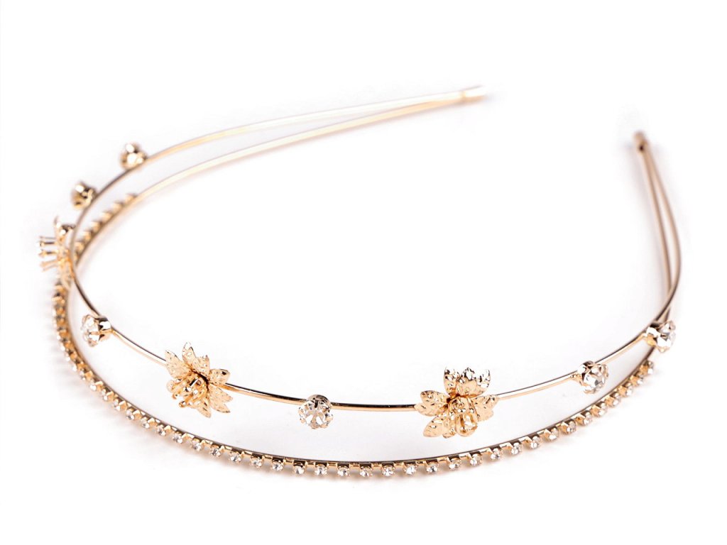 Dvouřadá štrasová čelenka slavnostně dozdobí účes pro jakoukoli příležitost. Vyniká svým rafinovaným designem, který kombinuje jemnost a eleganci. Z kovového drátu je vytvořená konstrukce, na níž jsou pevně připevněná kovová lůžka se skleněnými štrasovými kamínky a květy. Čelenka působí jemným dojmem, díky kamínkům se oslnivě třpytí. Dá se kombinovat s různými druhy účesů, od uvolněných kadeří po elegantní drdoly.- Obvod: 38 cm