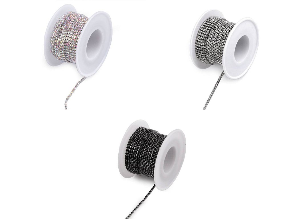 Luxusní bižuterní řetízkovou bortu zdobí třpytivé broušené kamínky vsazené do kovových kotlíků. Použití: Borta elegantně ozdobí plesové a společenské šaty i různé oděvní doplňky, například klobouky, kabelky, psaníčka či boty. Na 10 cm kousku borty je 37 kamínků.- Šíře: 2 mm