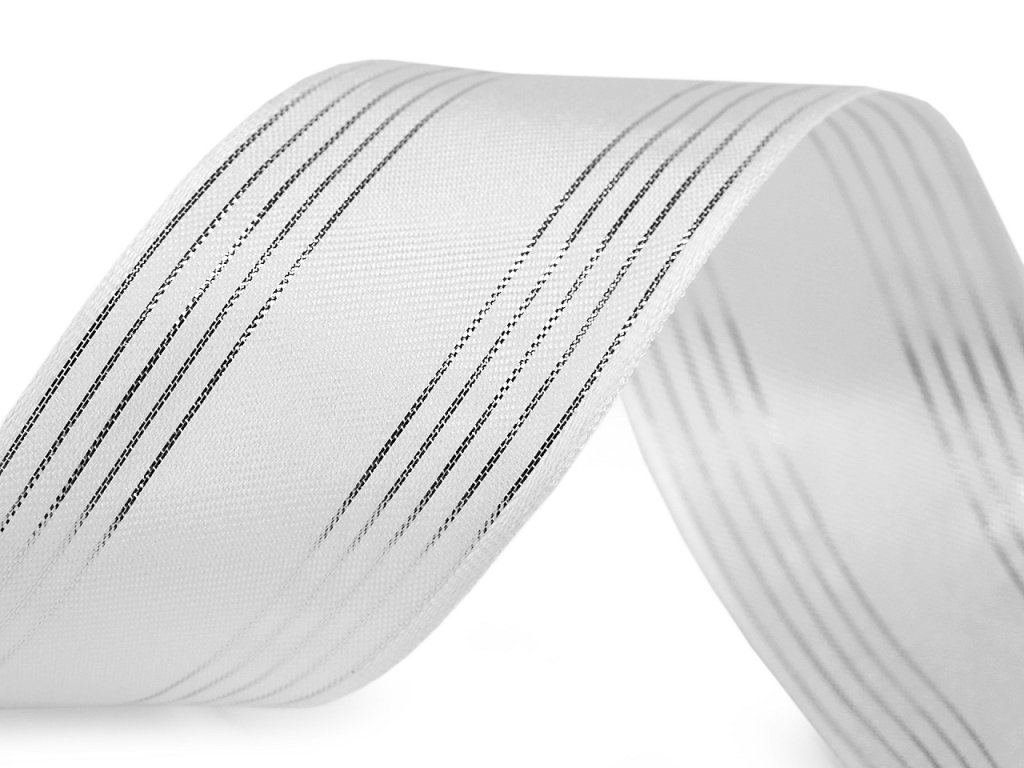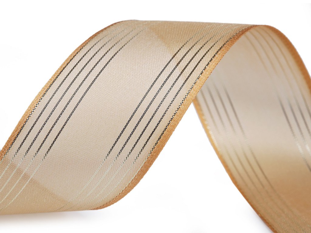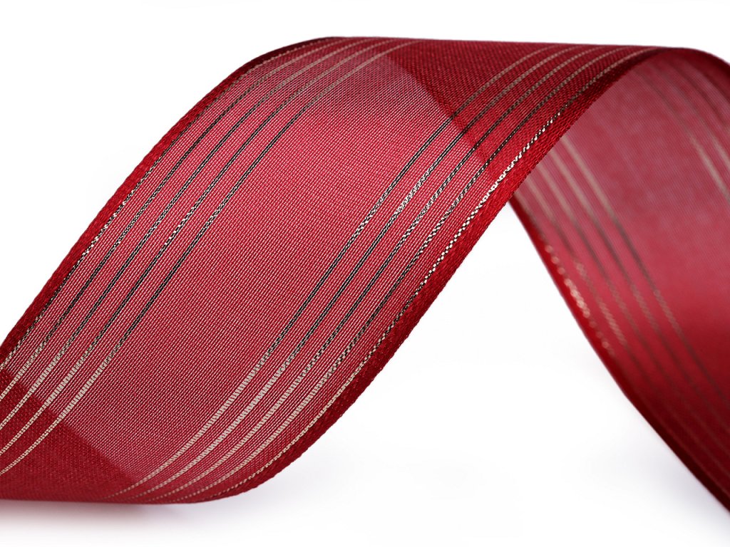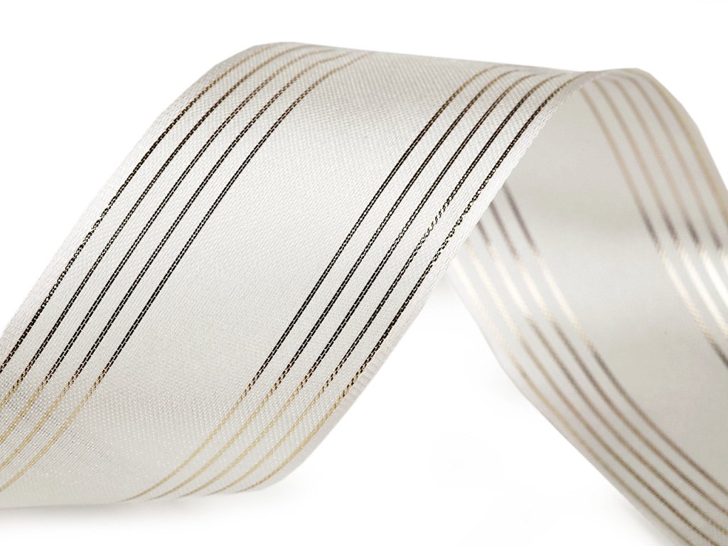 Dekorační stuhu zdobí lurexové pruhy. Díky nim se poutavě leskne. Stuha má pevné okraje, je jemně průsvitná, oboustranná. Použití: bude se perfektně vyjímat u vánočních dekorací, můžete ji použít na různé věnce, vazby nebo s ní originálně zabalit dárky.- Šíře: 40 mm
