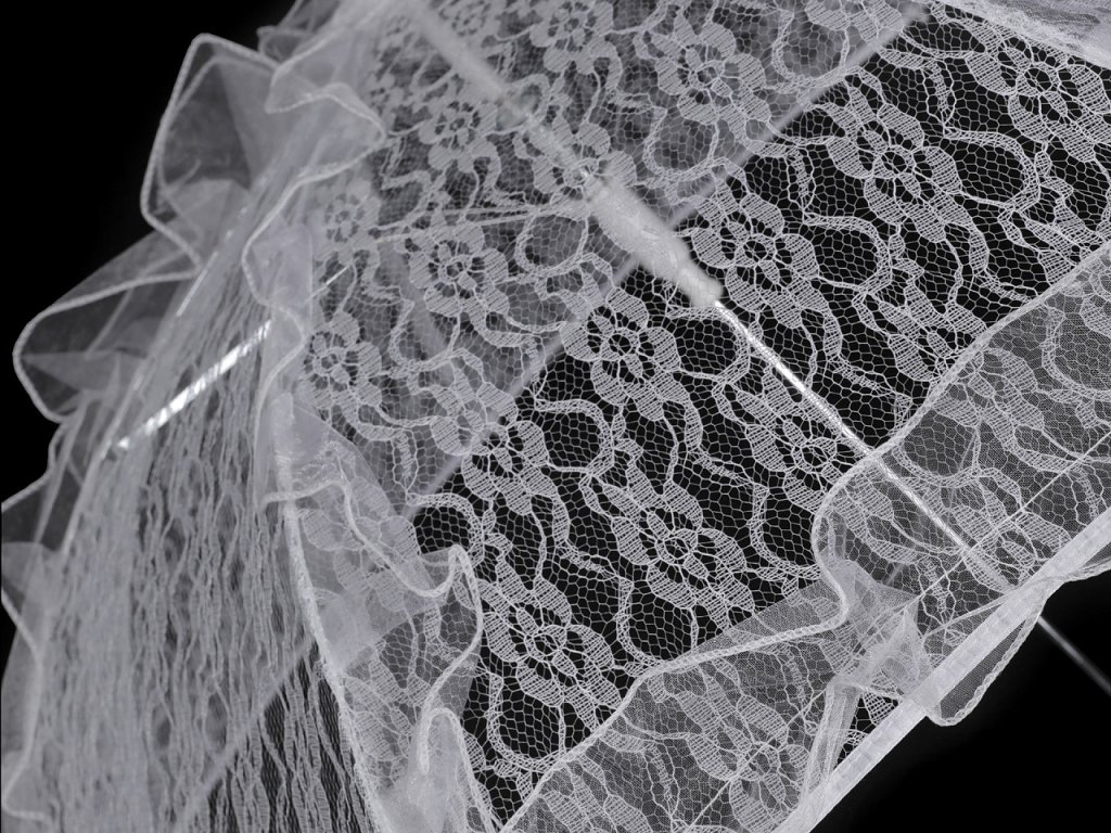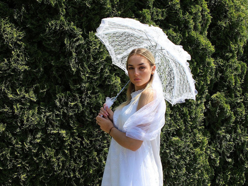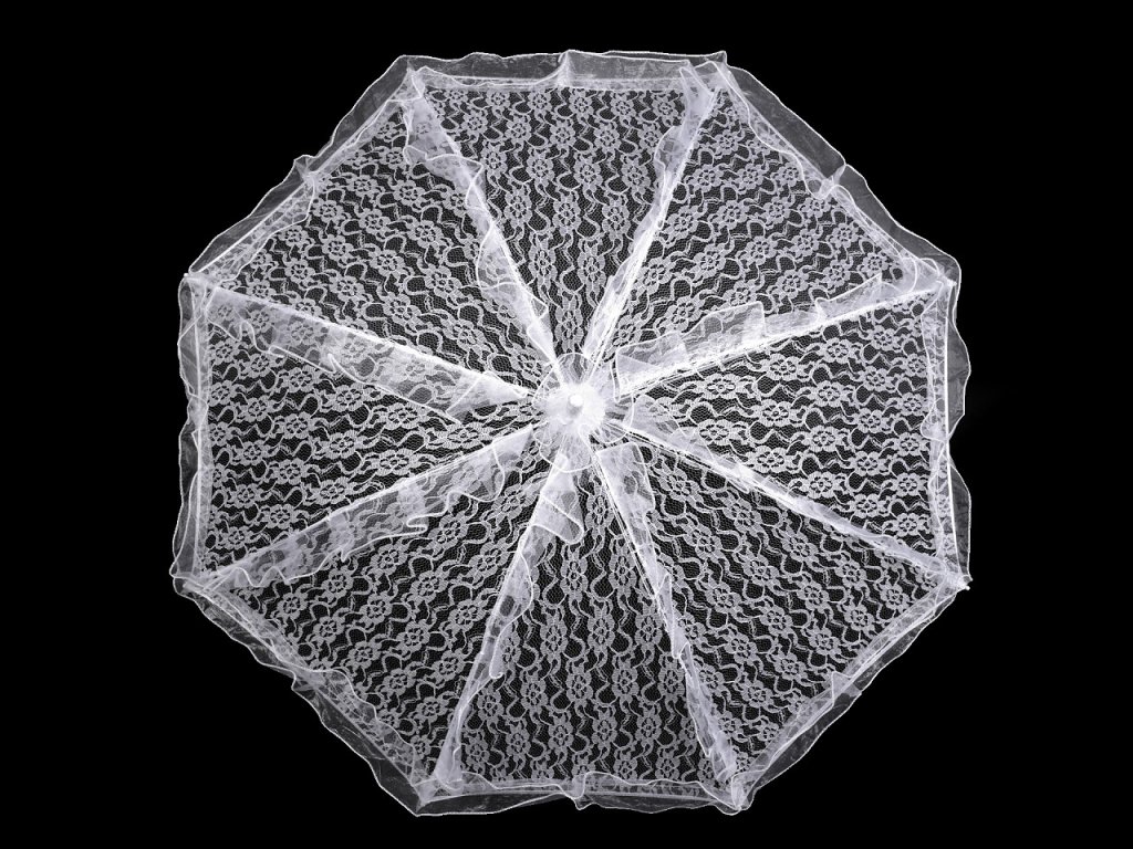 Krajkový deštník se hodí pro nevěsty v jejich svatební den i pro romantické focení v exteriéru nebo ateliéru. Můžete jej v případě hezkého počasí využít jako doplněk při focení. Není vhodný do deště. Deštník je vystřelovací, celokrajkový, okraje i jednotlivá pole má ozdobené nařaseným volánkem. Má klasickou tyč zakončenou pevnou rukojetí, která je obalená krajkou. Kovová konstrukce deštníku se skládá z 8 polí, zajišťuje vysokou pevnost a stabilitu. Hloubka deštníku je 21 cm.- Rukojeť: plastová