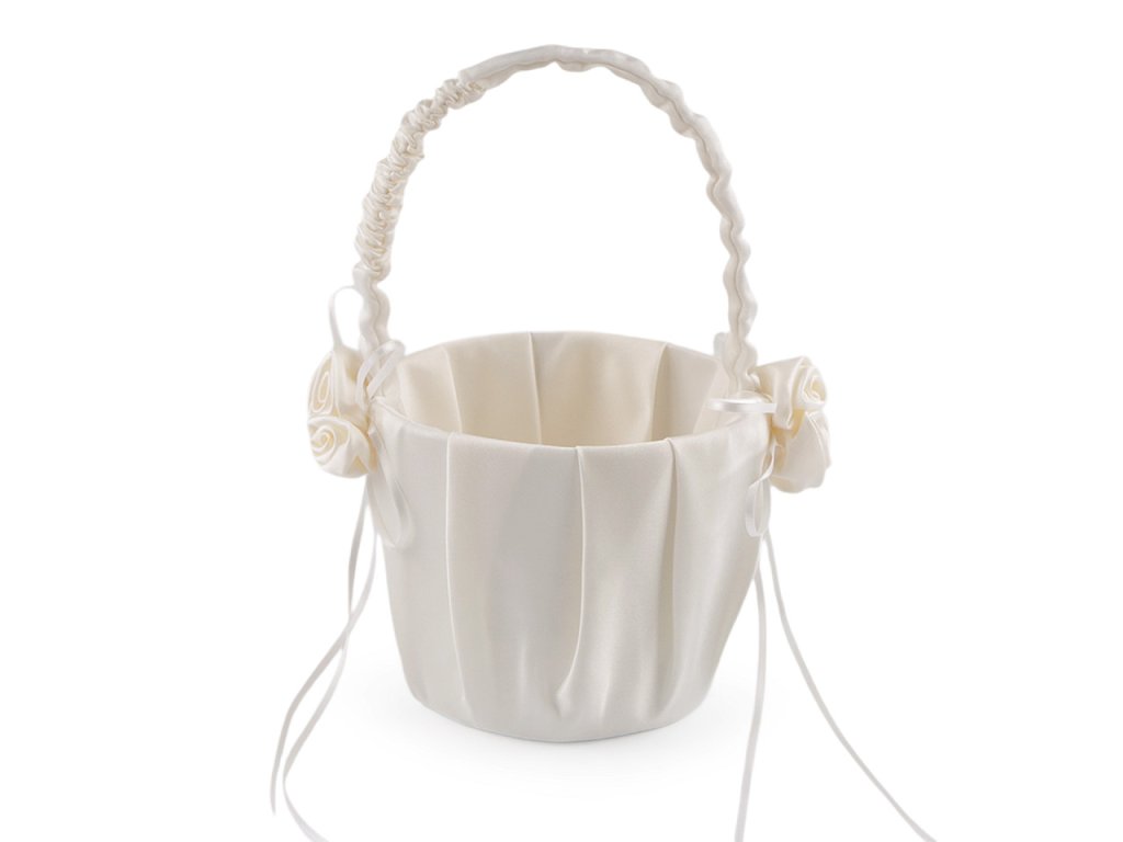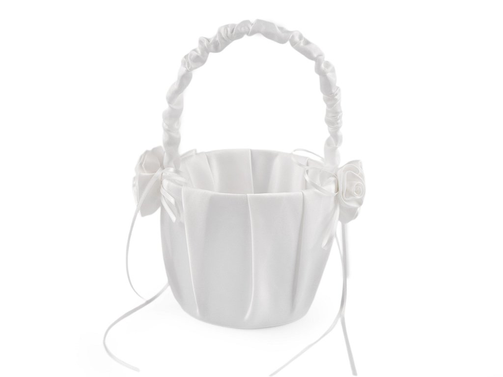 Saténový košíček je skvělým svatebním doplňkem pro malé družičky. Uvnitř košíčku se budou vyjímat plátky růží nebo květinová aranžmá. Košíček je vyrobený z pevnějšího plastu. Zdobí ho saténové květy a stuhy.- Průměr: 13 cm