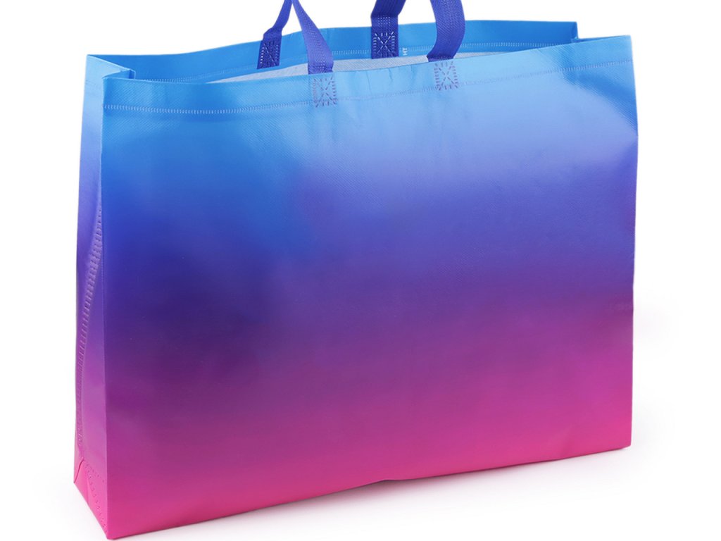 Velká taška z laminované netkané textilie vás nadchne svým velkým prostorem. Má dvě ucha, dá se složit třeba do kabelky. Díky opakovanému používání je šetrná k životnímu prostředí, stále častěji nahrazuje igelitové tašky. Hodí se k reklamním účelům. Není určená na těžké nákupy.- Rozměry (ŠxVxH): 46 x 36 x 10 cm