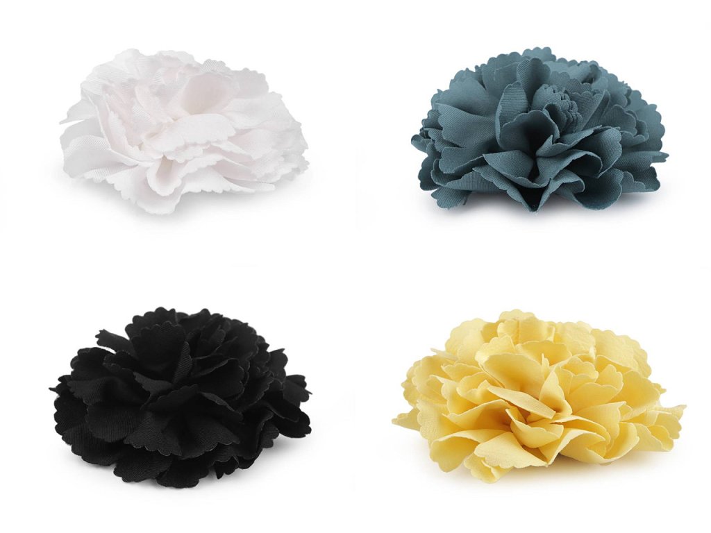 Velký textilní květ připomínající karafiát je velice poutavý. Ve spodní části má filcové kolečko, díky kterému jej pohodlně kamkoliv upevníte. Můžete ho našít či nalepit jako ozdobu na šaty, kabátky, svetry apod. V kombinaci s brožovým můstkem s ním vytvoříte zajímavou brož. Díky klipu ho zase můžete připevnit na boty.- Průměr: 10 cm