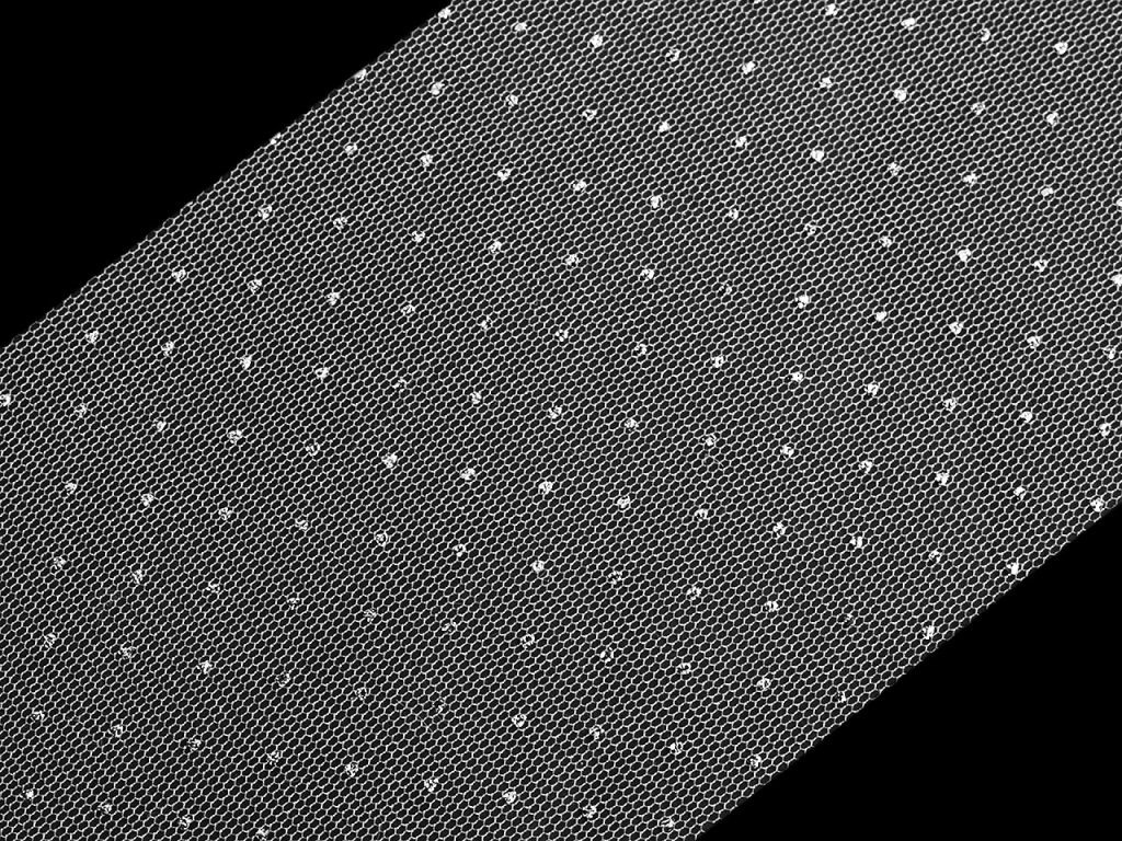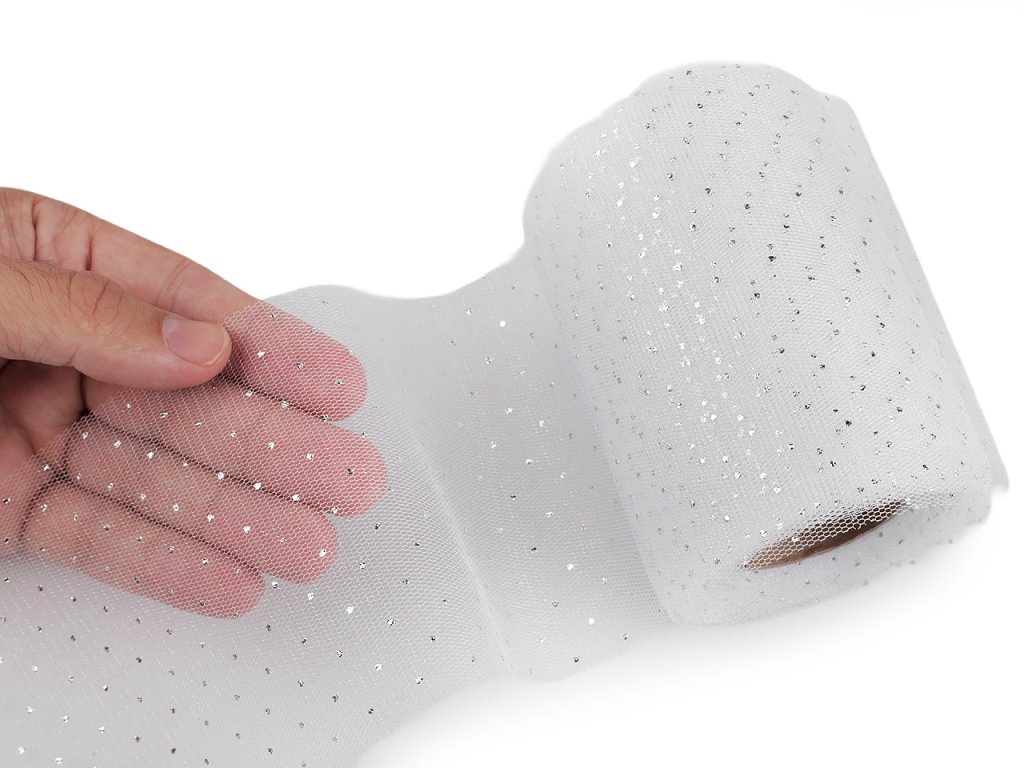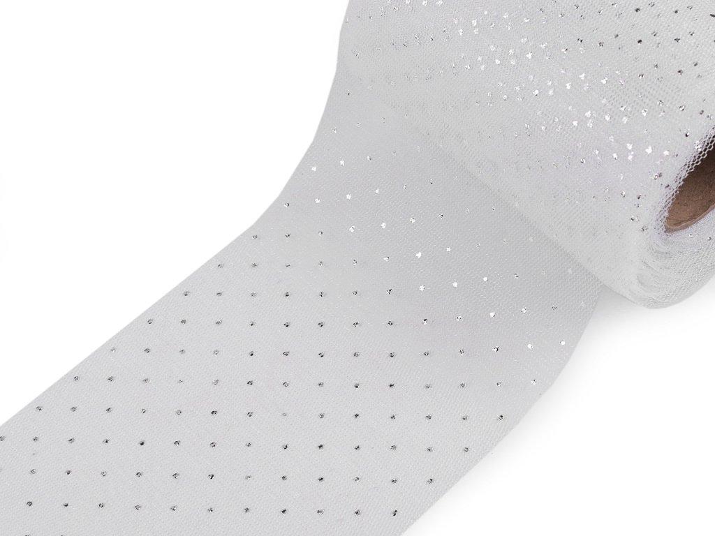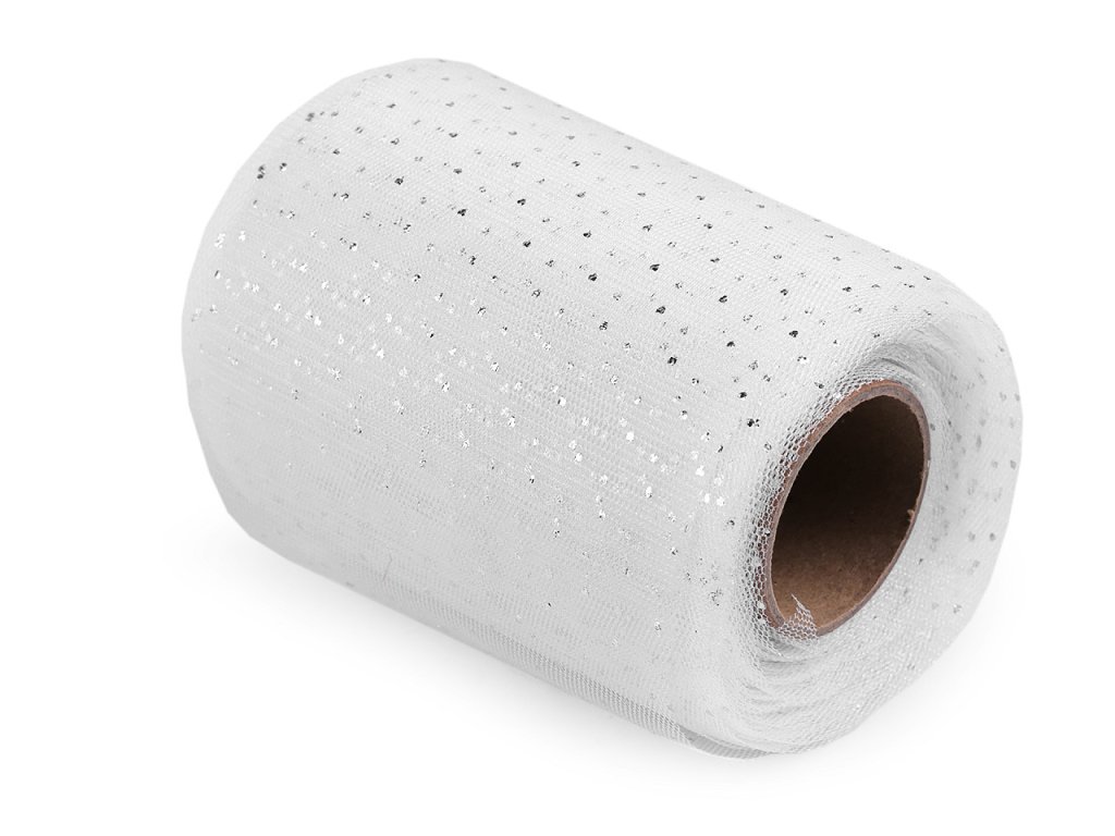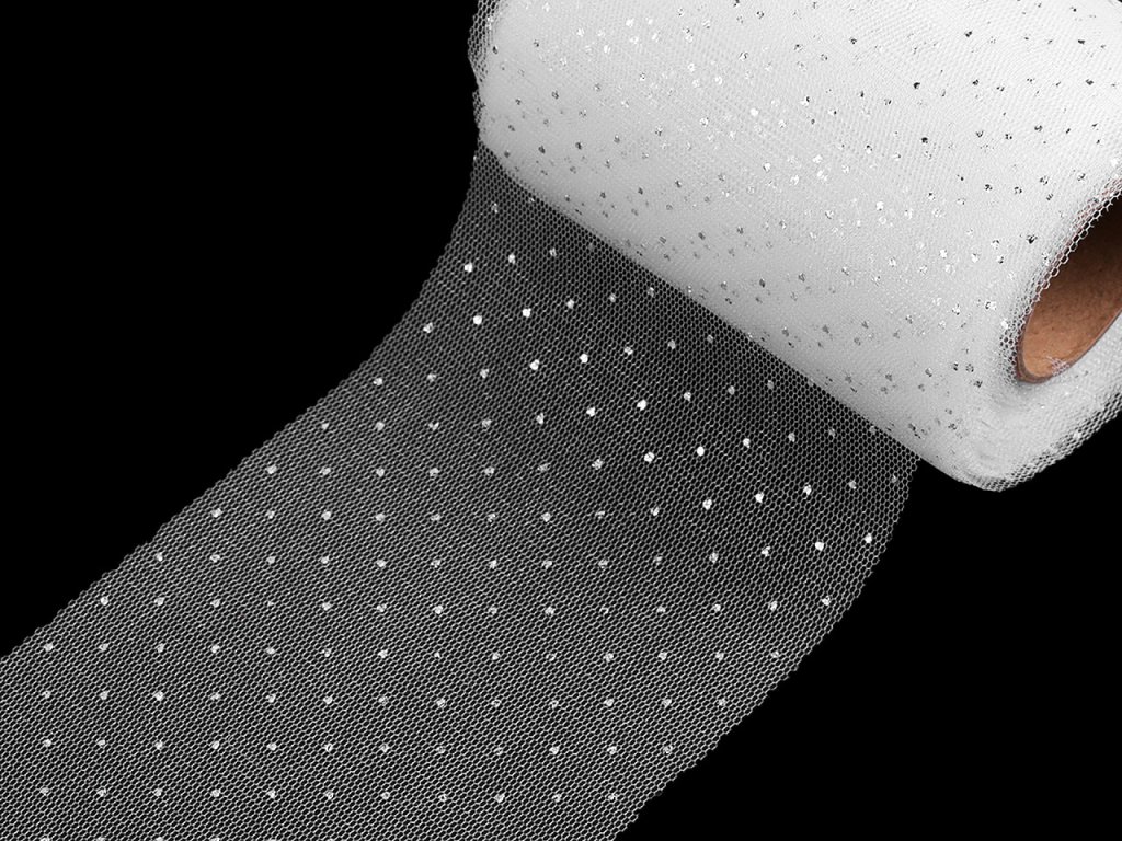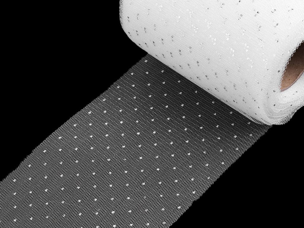 Široká tylová stuha je po celé délce ozdobená stříbrnými puntíčky, díky kterým se elegantně třpytí. Je oboustranná, velice poutavá, tyl dodává stuze vzdušnost a lehkost, což ji činí ideální pro různé dekorační účely. Použití: Stuhu využijete při různých slavnostních příležitostech (například na svatbě) jako dekoraci na židle, stoly, auta, manžety květin apod. Můžete z ní vyrobit i jednoduché mašle, stuha dobře drží tvar. Je také vynikající na balení dárků, kterým dodá luxusní vzhled.- Šíře: 10 cm