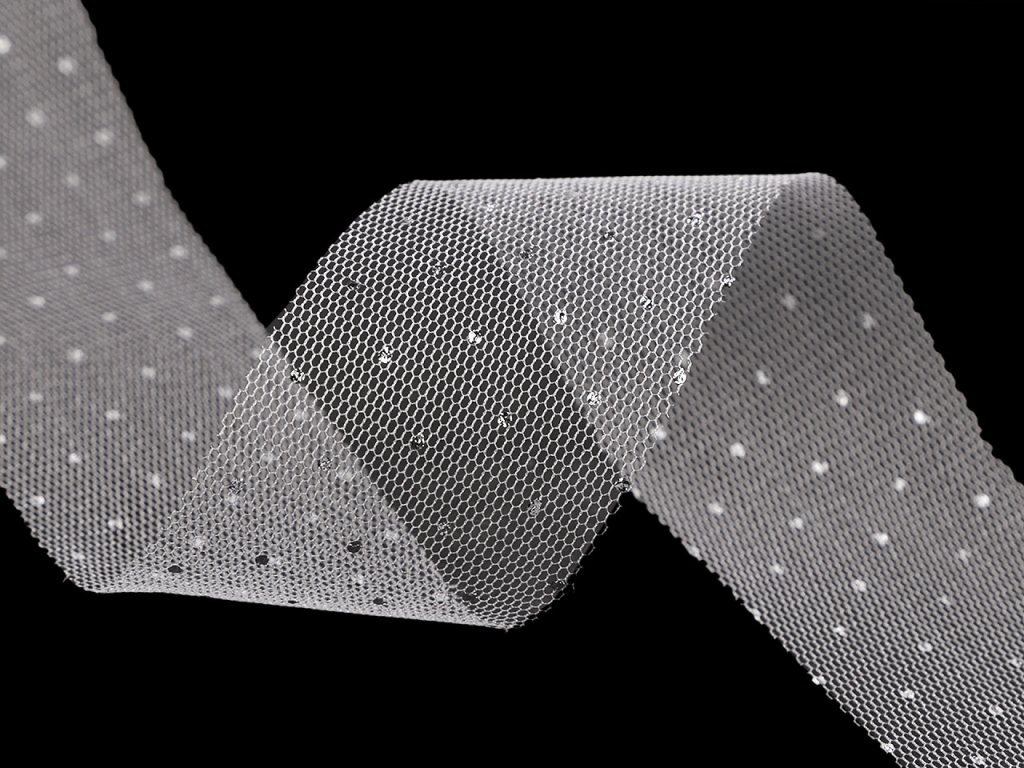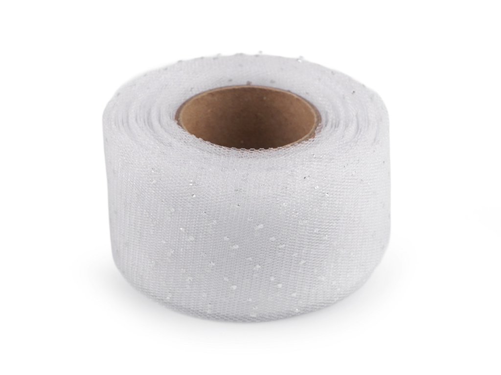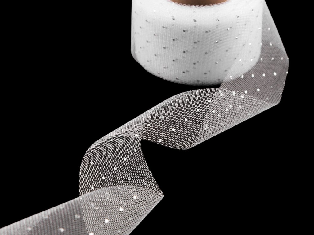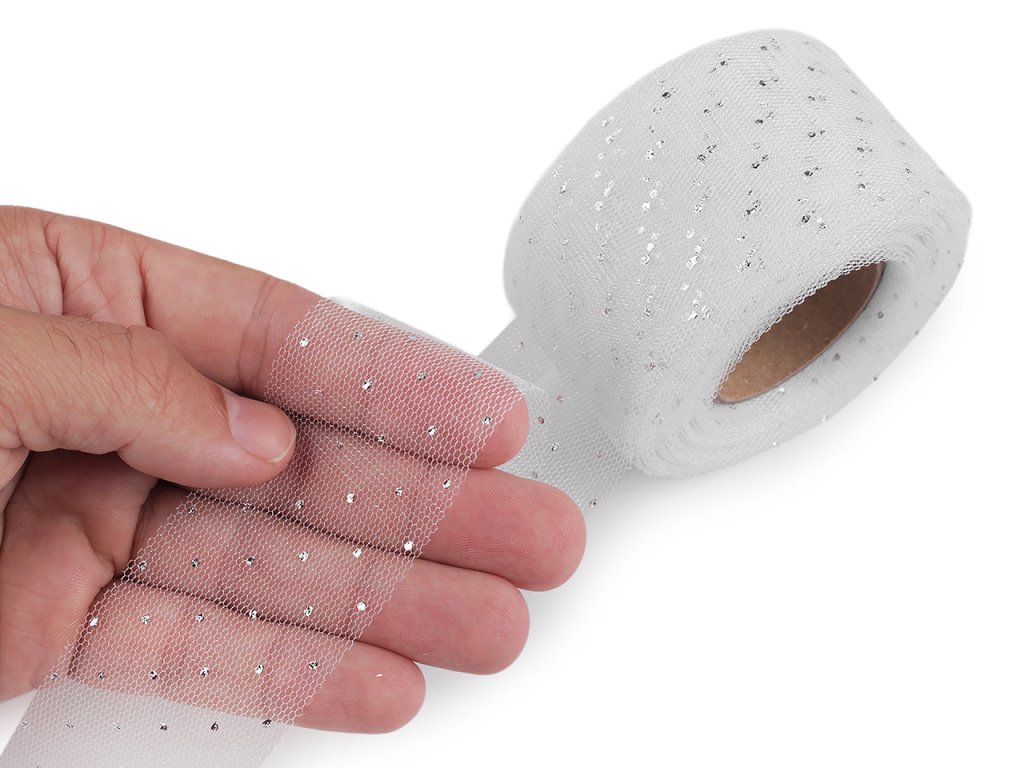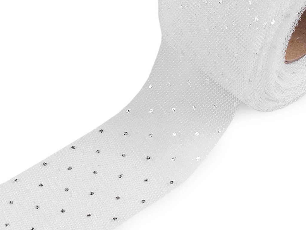 Elegantní tylová stuha je po celé délce ozdobená stříbrnými puntíčky, díky kterým se poutavě třpytí. Je oboustranná, velice poutavá, tyl dodává stuze vzdušnost a lehkost, což ji činí ideální pro různé dekorační účely. Použití: Stuhu využijete při různých slavnostních příležitostech (například na svatbě) jako dekoraci na židle, stoly, auta, manžety květin apod. Můžete z ní vyrobit i jednoduché mašle, stuha dobře drží tvar. Je také vynikající na balení dárků, kterým dodá luxusní vzhled.- Šíře: 40 mm