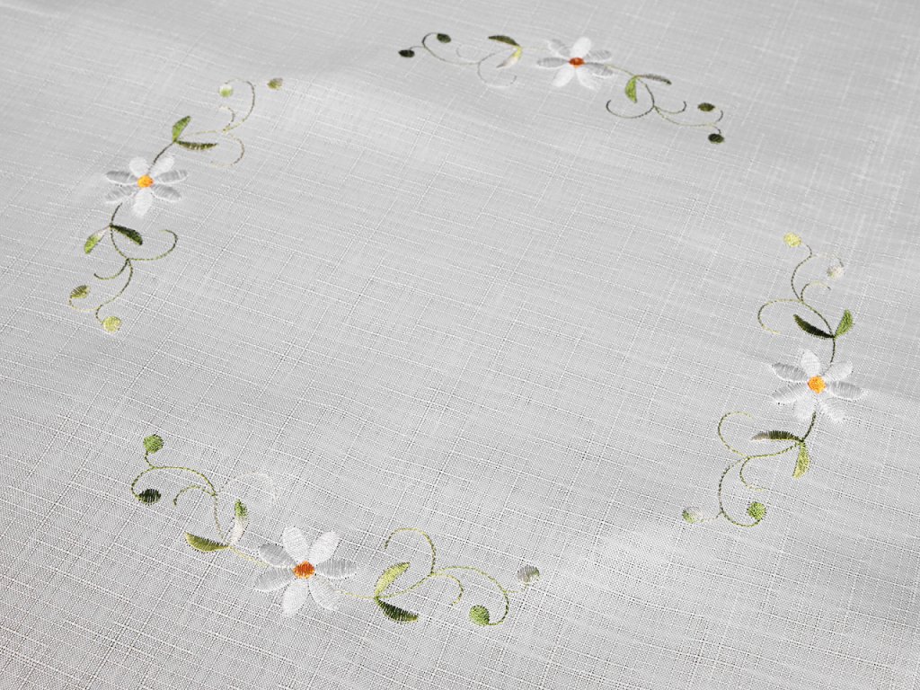 Textilní ubrus se strojovou výšivkou květů je nádherným doplňkem pro každou jídelnu či obývací pokoj. Jeho jemné vyšívání a elegantní design dodávají každému stolování příjemný vzhled. Je ideální volbou pro každodenní použití i slavnostní příležitosti. Skvěle se hodí na sváteční stoly, rodinné oslavy nebo romantické večeře. Je vhodný pro kombinaci s širokou škálou porcelánu, skla či příborů, a to jak v moderním, tak i tradičním stylu. Je jednostranný, vyrobený z kvalitního textilu, který je pevný a odolný. Okraje má zakončené zoubky.- Rozměry: 86 x 86 cm