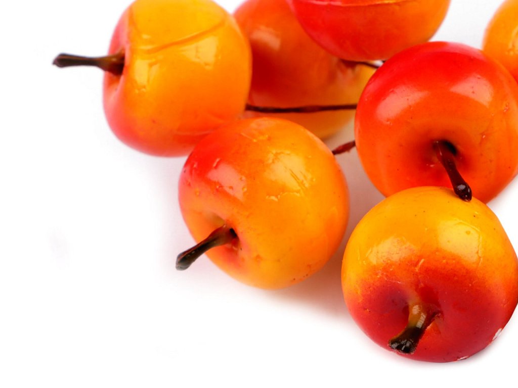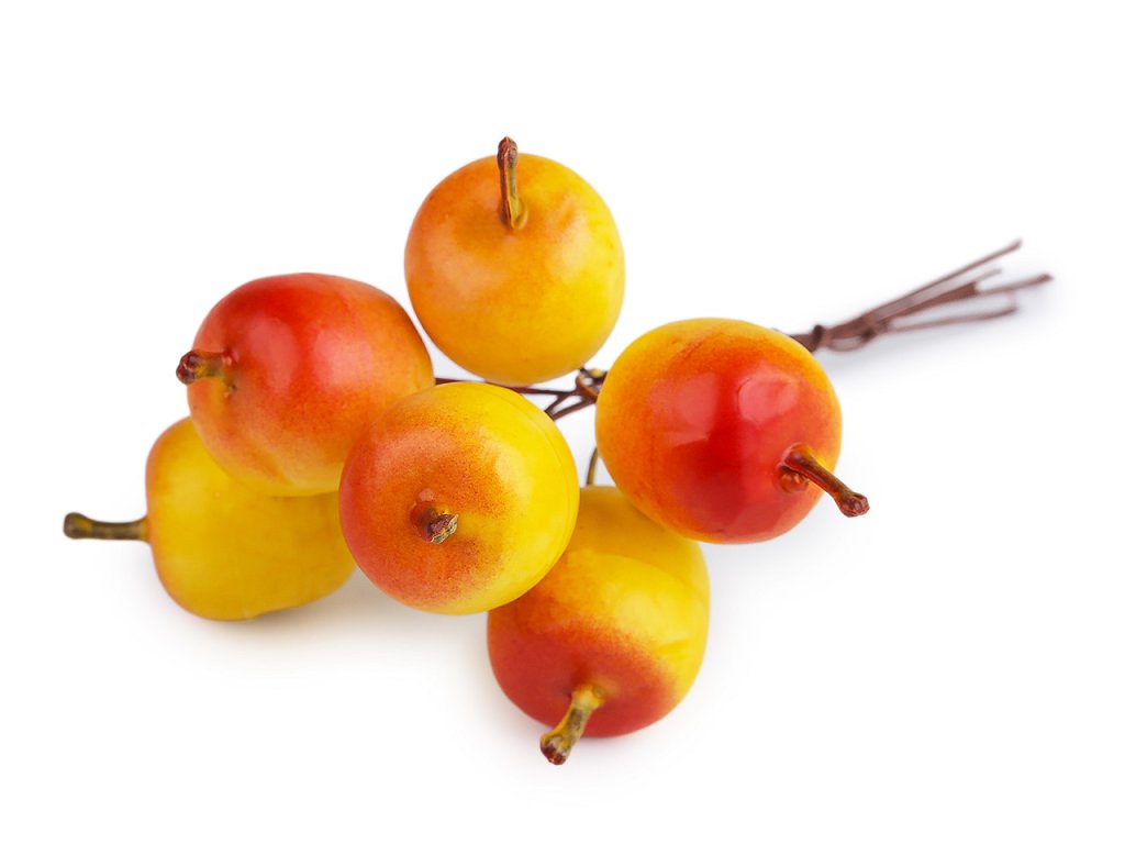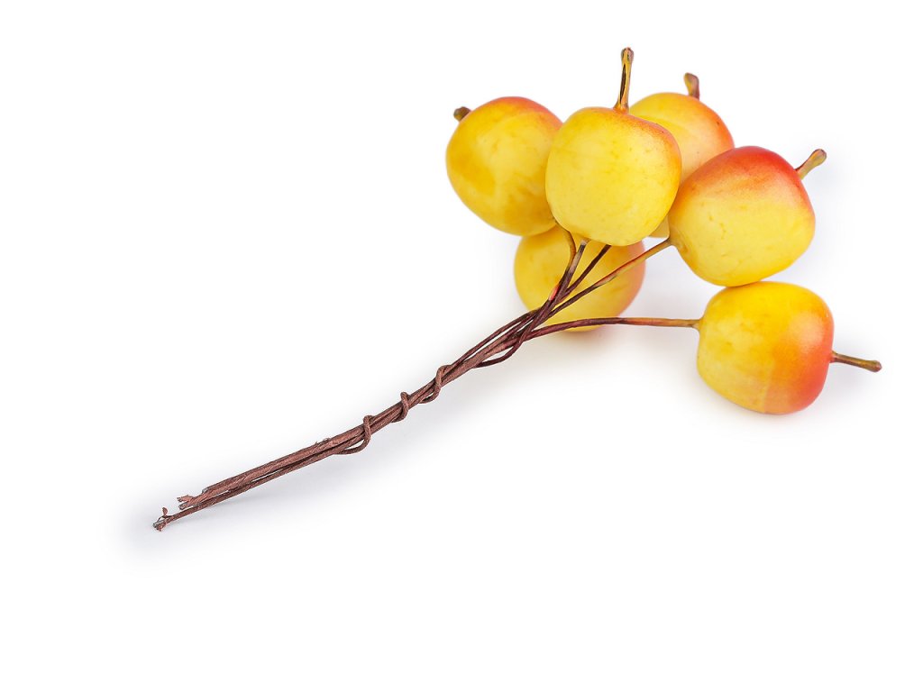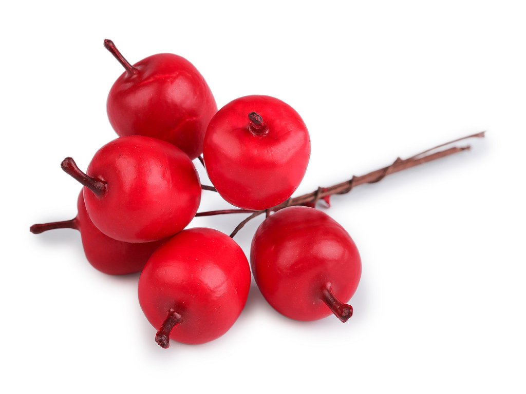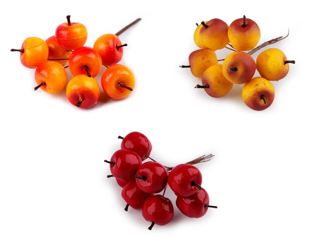 Dekorační jablíčka jsou připevněná na drátku, který se dá dobře tvarovat. Lehce se zapichují do polystyrenových polotovarů, věnců, květinových vazeb apod. Svazek 6 ks je převázaný floristickou páskou. Vlivem výroby mohou být některá jablíčka slepená dohromady.- Průměr: cca 2,3 cm
