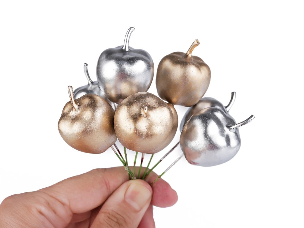 Dekorační jablíčka působí díky svému metalickému zabarvení slavnostně. Jsou připevněná na drátku, který se dá dobře tvarovat. Lehce se zapichují do polystyrenových polotovarů, věnců, dekoračních vazeb, květináčů apod.- Průměr: 3,2 cm