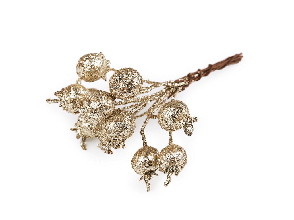 Dekorační bobule jsou připevněné drátku a celé se díky glitrům třpytí. Můžete je zakomponovat do věnců, polystyrenových polotovarů, ikeban, květinových vazeb apod.