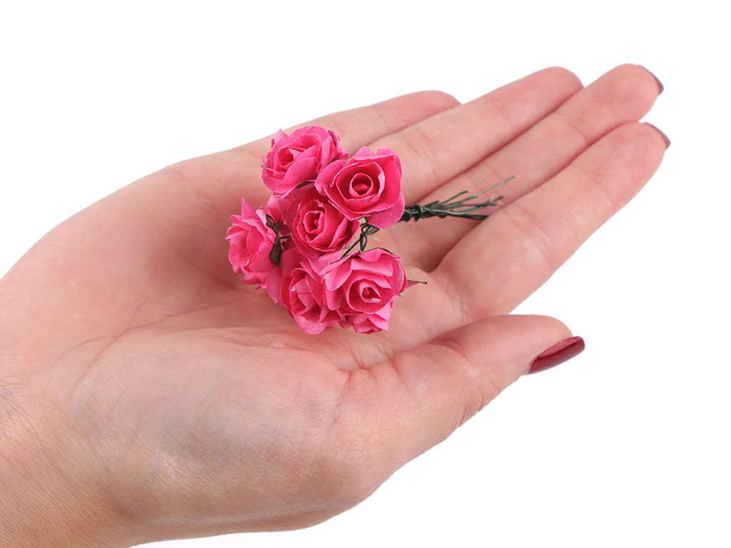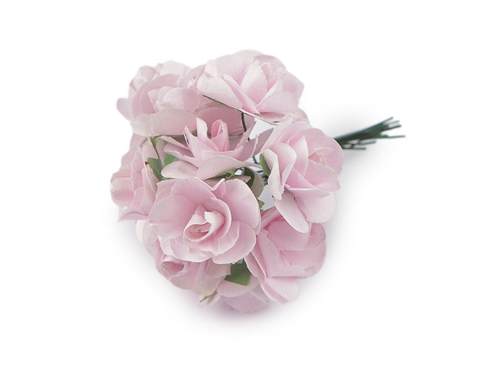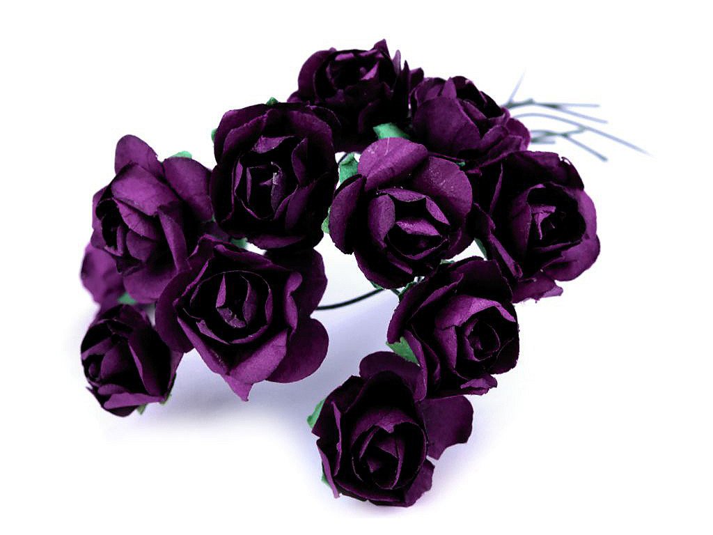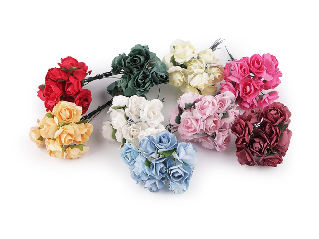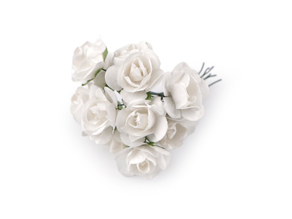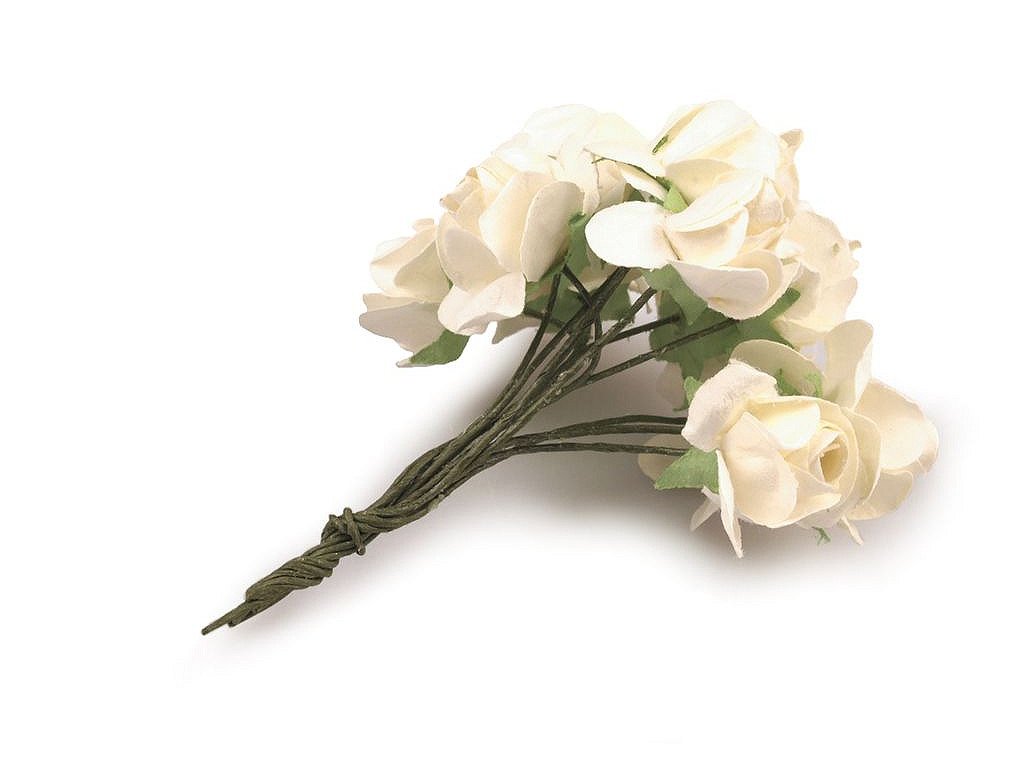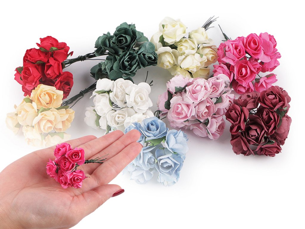 Kvalitní papírové růže mají jemný romantický vzhled. Jako stonek slouží ohebný drát. V jednom svazku je 12 ks růží. Použití: Růže jsou vhodné na různá aranžmá a voničky. Vyniknou na věncích, ikebanách apod. Růžičky můžete použít i jednotlivě, například na scrapbooking a ozdobit jimi foto rámečky, alba, pozvánky nebo přání. Využijete je také například na výrobu čelenek a fascinátorů do vlasů. Odstíny barev růží se mohou mírně lišit.- Průměr květu: 1,5 - 2 cm