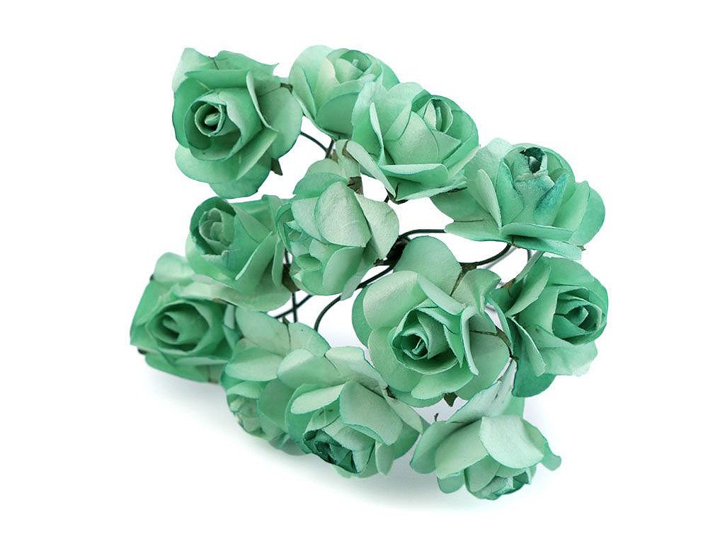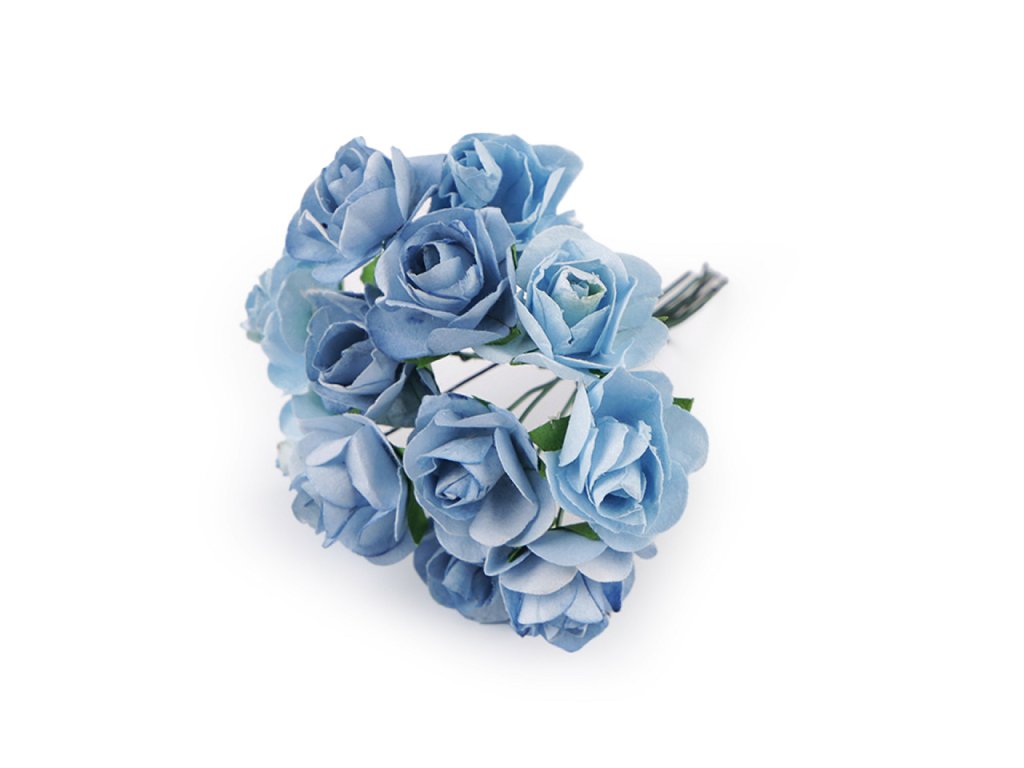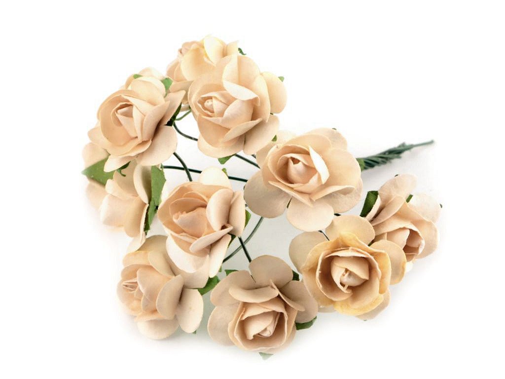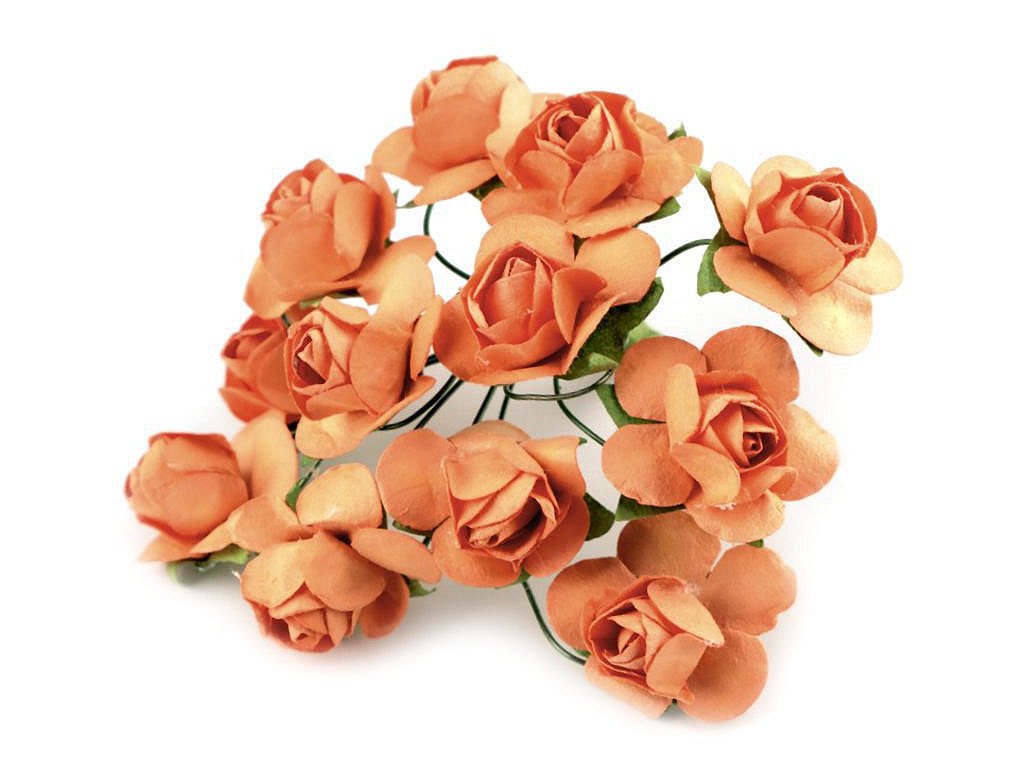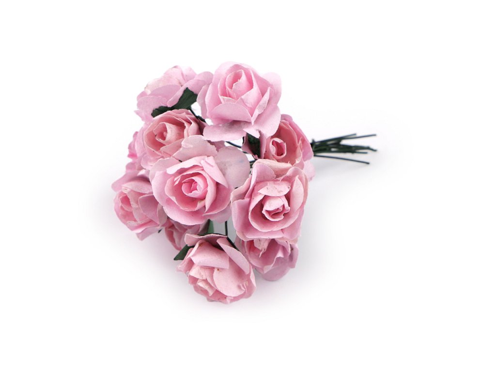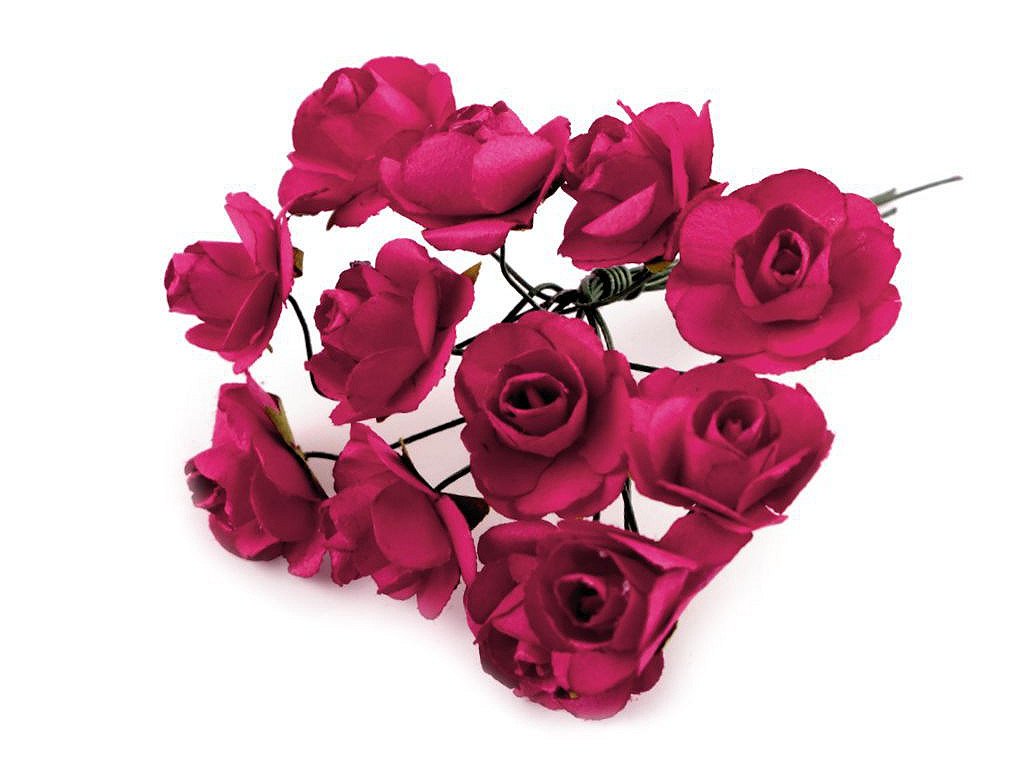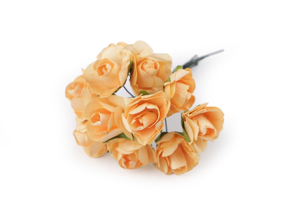 Kvalitní papírové růže mají jemný romantický vzhled. Jako stonek slouží ohebný drát. V jednom svazku je 12 ks růží. Použití: Růže jsou vhodné na různá aranžmá a voničky. Vyniknou na věncích, ikebanách apod. Růžičky můžete použít i jednotlivě, například na scrapbooking a ozdobit jimi foto rámečky, alba, pozvánky nebo přání. Využijete je také například na výrobu čelenek a fascinátorů do vlasů. Odstíny barev růží se mohou mírně lišit.- Průměr květu: 1,5 - 2 cm