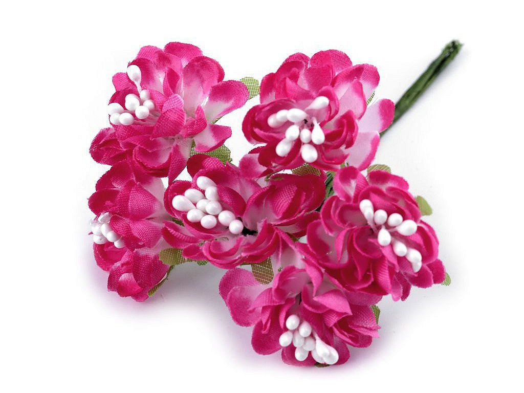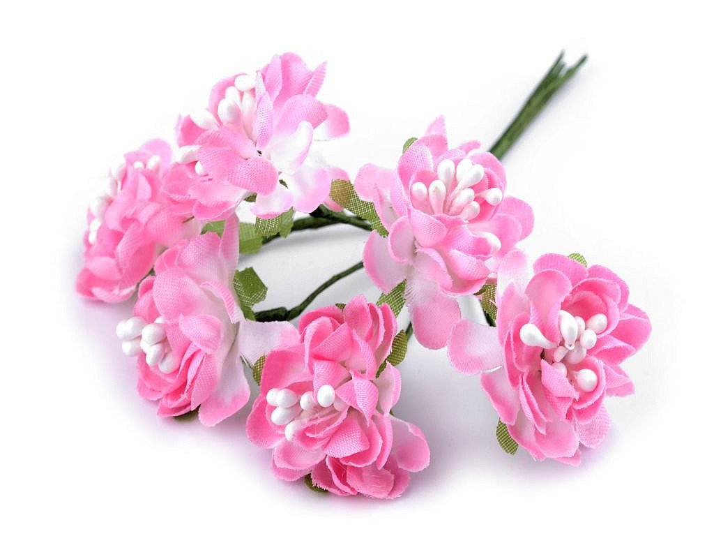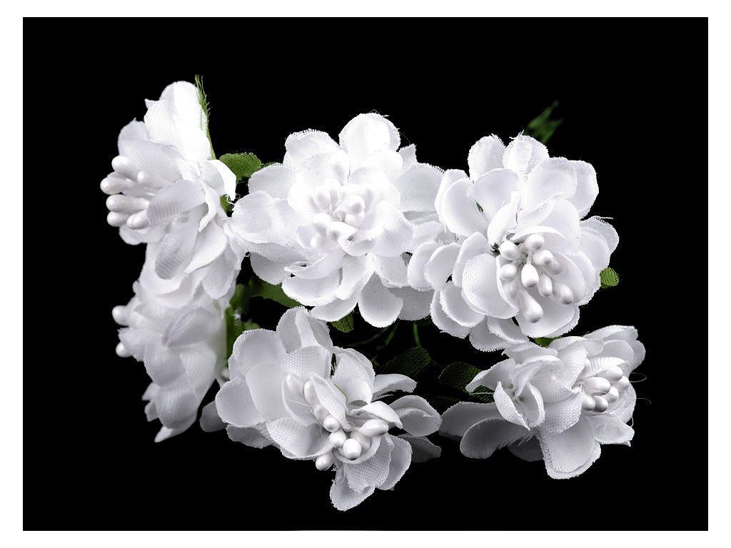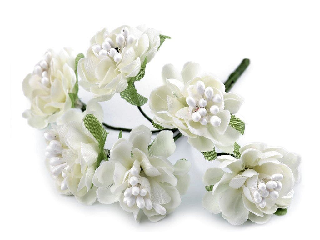 Textilní květy skvěle dozdobí vaše květinové dekorace a aranžmá. Jsou detailně propracované a ozdobené drobnými pestíky. Jednotlivé květy jsou připevněné k ohebnému drátku, omotaném floristickou páskou, který umožňuje snadnou manipulaci a lehkou tvarovatelnost. Použití: Květy využijete při výrobě svatebních dekorací nebo k ozdobení čelenek do vlasů, věnců, apod. 6 kusů květů je spojeno do svazku.- Průměr: 35 mm
