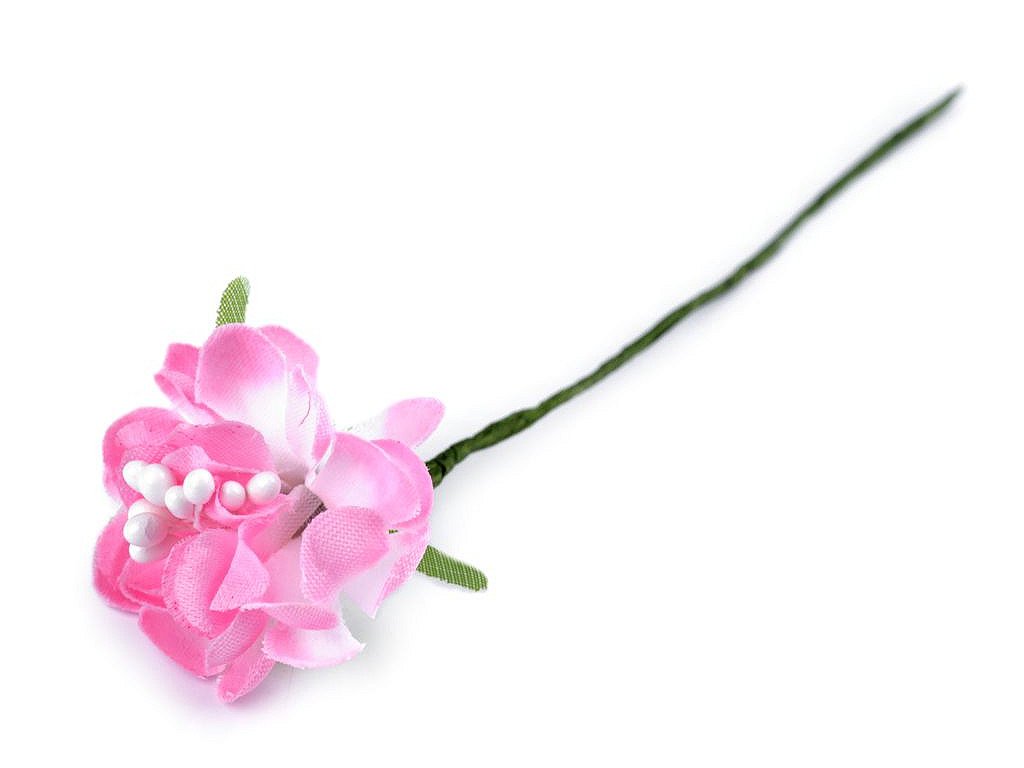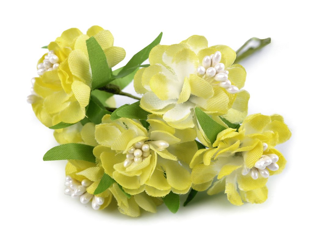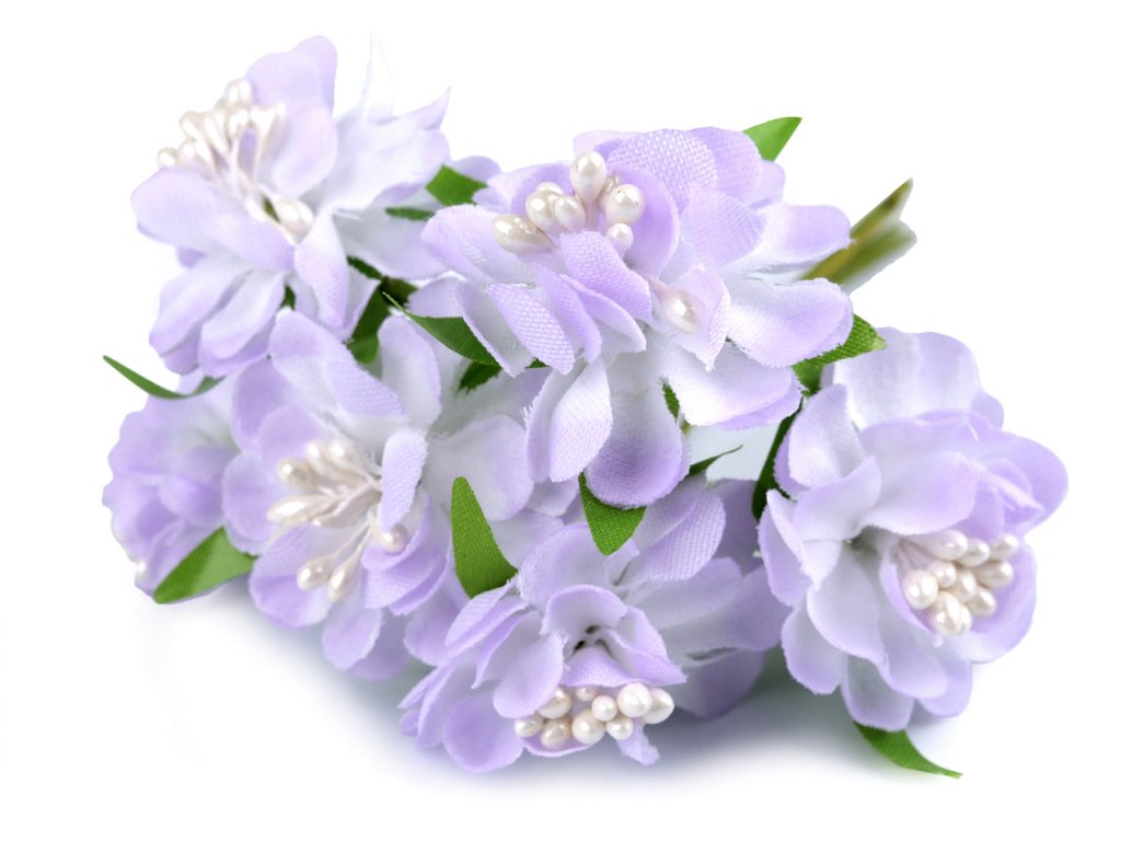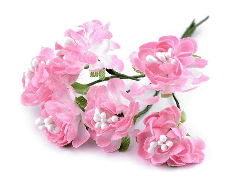 Textilní květy skvěle dozdobí vaše květinové dekorace a aranžmá. Jsou detailně propracované a ozdobené drobnými pestíky. Jednotlivé květy jsou připevněné k ohebnému drátku, omotaném floristickou páskou, který umožňuje snadnou manipulaci a lehkou tvarovatelnost. Použití: Květy využijete při výrobě svatebních dekorací nebo k ozdobení čelenek do vlasů, věnců, apod. 6 kusů květů je spojeno do svazku.- Průměr: 35 mm