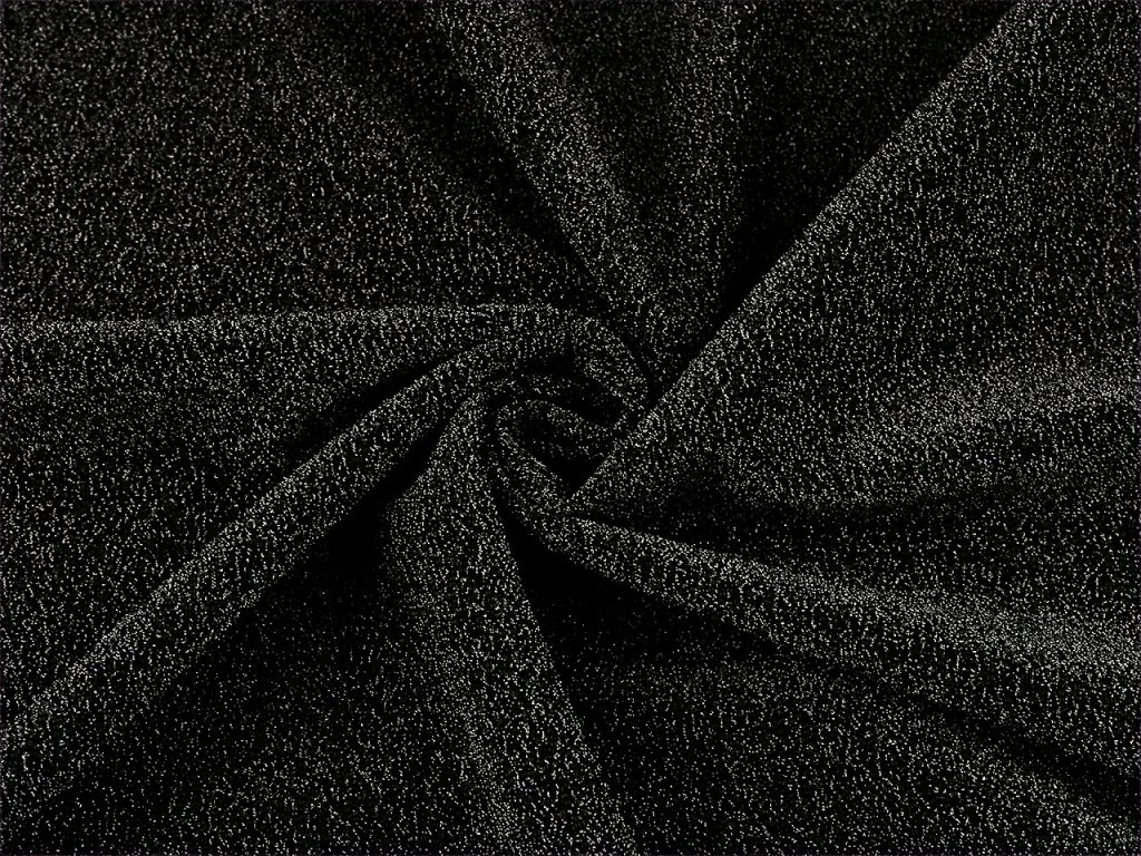 Třpytivý úplet je protkaný luxerem, který mu dodává slavnostní vzhled. Je splývavý, lehký, z rubové strany hladký a pruží všemi směry. Neprosvítá. Úplet je vhodný na šití společenských šatů, sukní, bolerek, kardiganů, halenek i širokých elegantních kalhot. Lurex je černý.- Gramáž: 170 g/m²