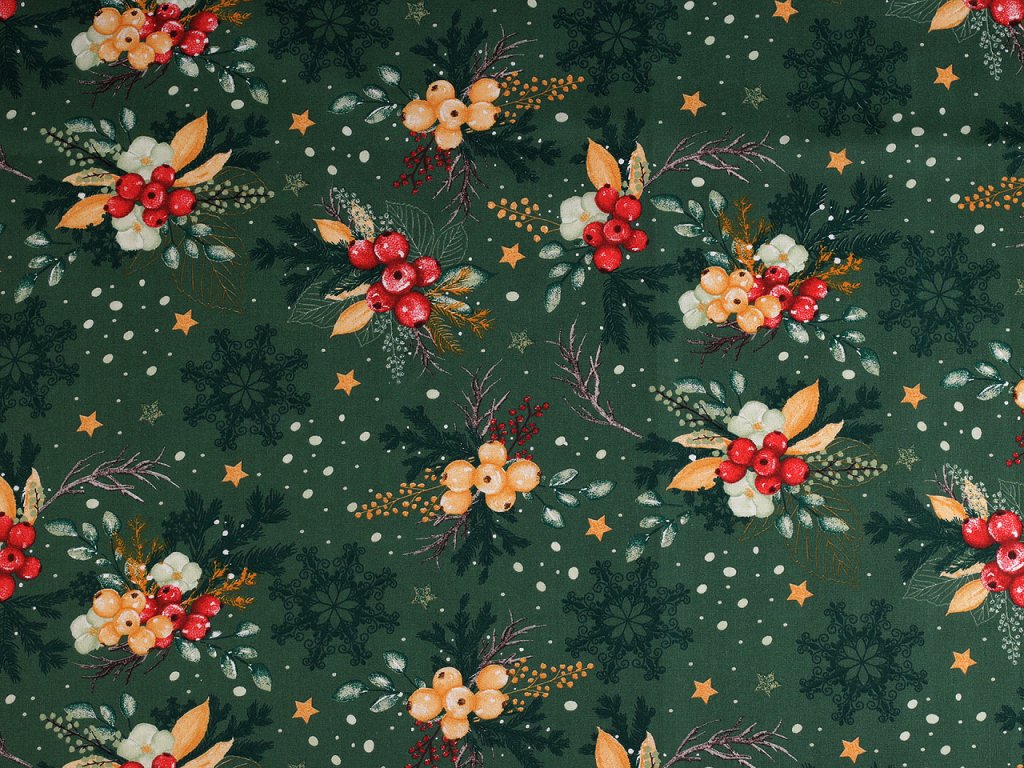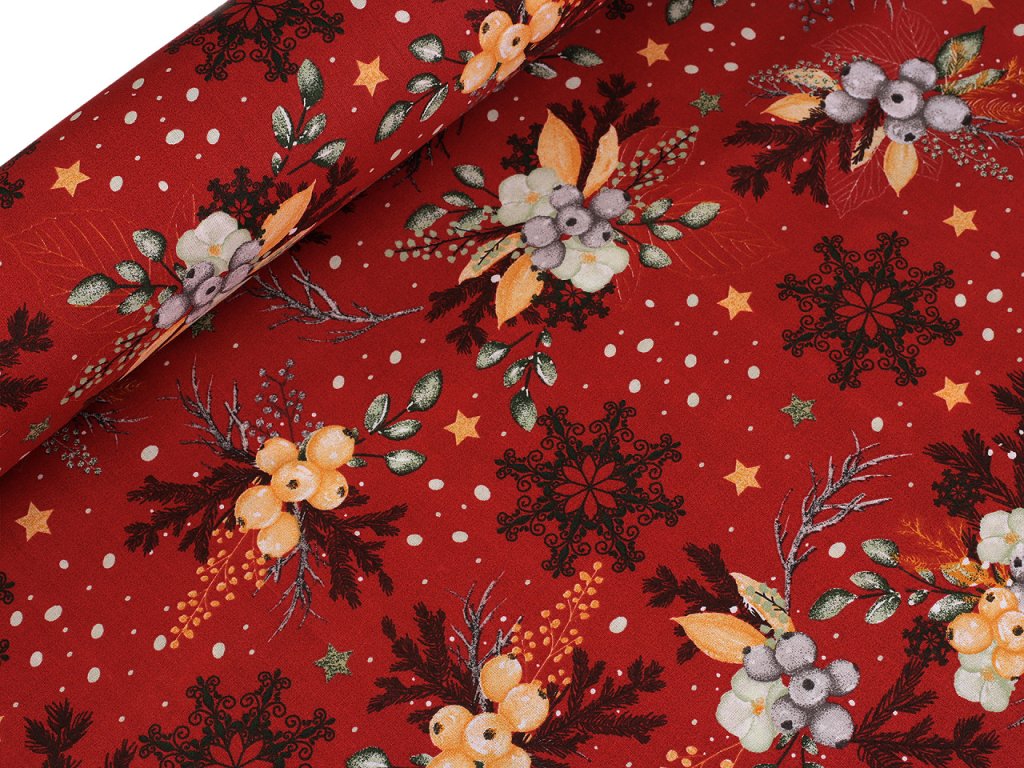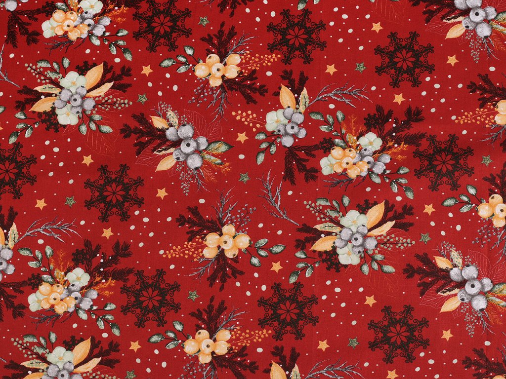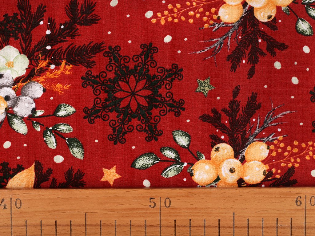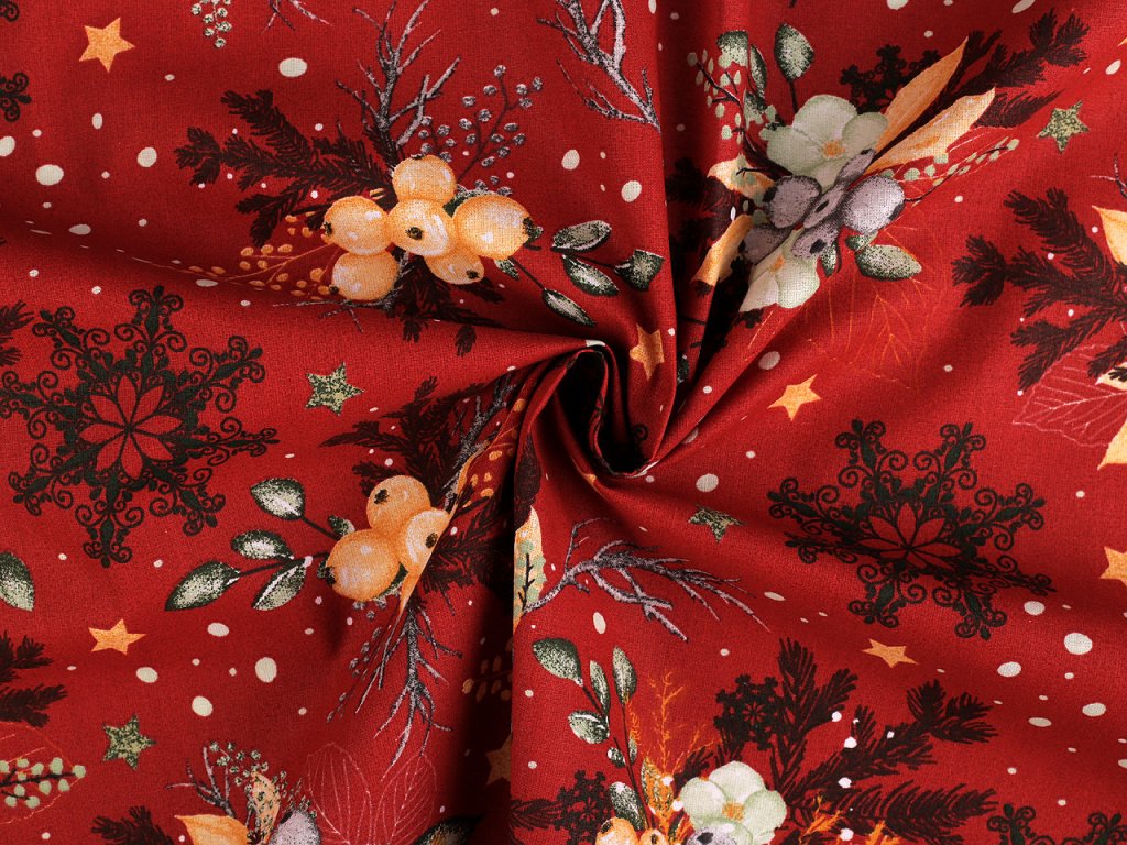 Bavlněné plátno zdobí poutavý vánoční potisk s větvičkami a sněhovými vločkami. Můžete z něj ušít různé vánoční dekorace, ubrusy, polštáře, povlečení, pytlíčky apod. Ušité výrobky dodají vašemu domovu sváteční atmosféru.- Gramáž: 115 g/m²