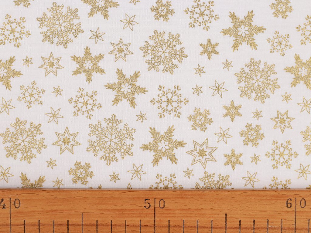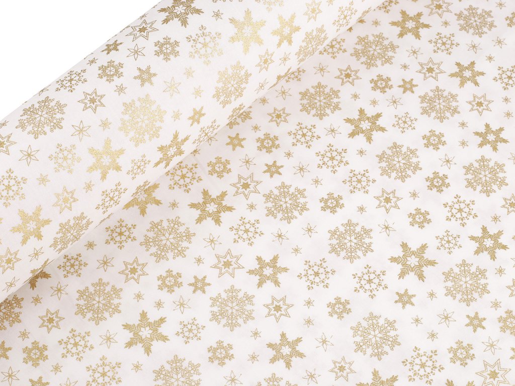Bavlněnou látku s metalickými sněhovými vločkami využijete na šití svátečních dekorací, prostírání, běhounů, ubrusů, dekoračních polštářů, pytlíčků apod. Látka je měkká a příjemná na dotek.