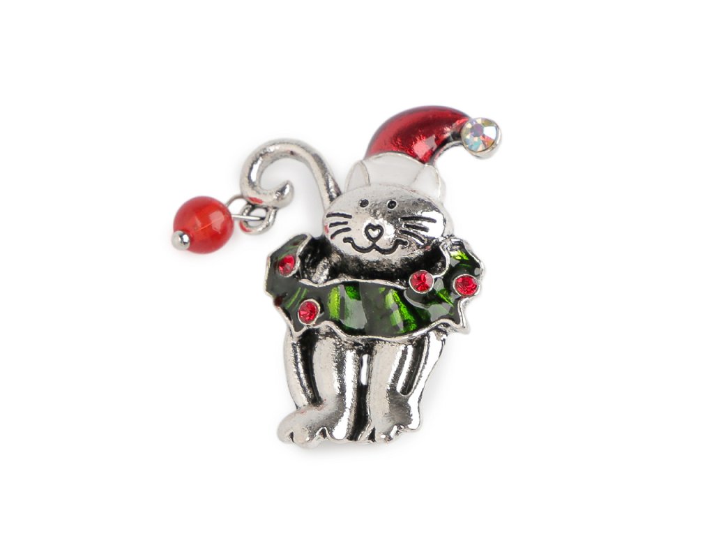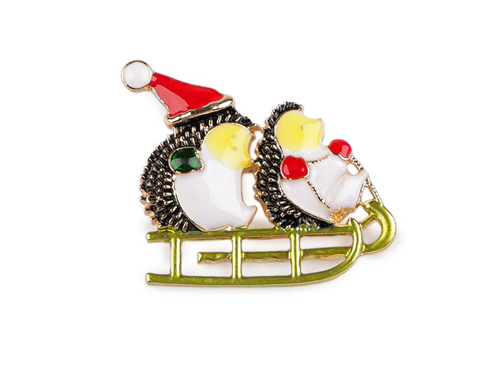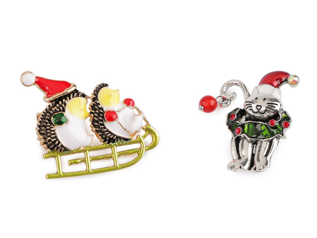 Vánoční brož ježci na saních, kočka
