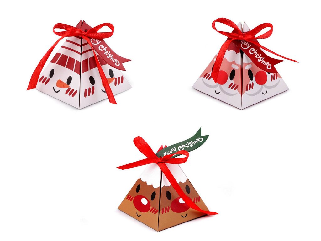 Vánoční krabička pyramida zaujme děti i dospělé. Nahoře se ozdobně zavazuje pomocí přiložené stužky. Součástí balení je i přivazovací vlaječka Merry Christmas. Krabičku můžete použít na drobné dárky nebo ji naplnit dobrotami na Mikuláše. Dodáváme ji v rozloženém stavu (17,5 x 17,5 cm). Složíte ji jednoduše podle vyznačených ohýbacích krajů. Krabička nemá atest na potraviny, pochoutky a jiné laskominy doporučujeme vložit zabalené v sáčku.- Rozměry (ŠxVxH): 7,3 x 8 x 7,3 cm