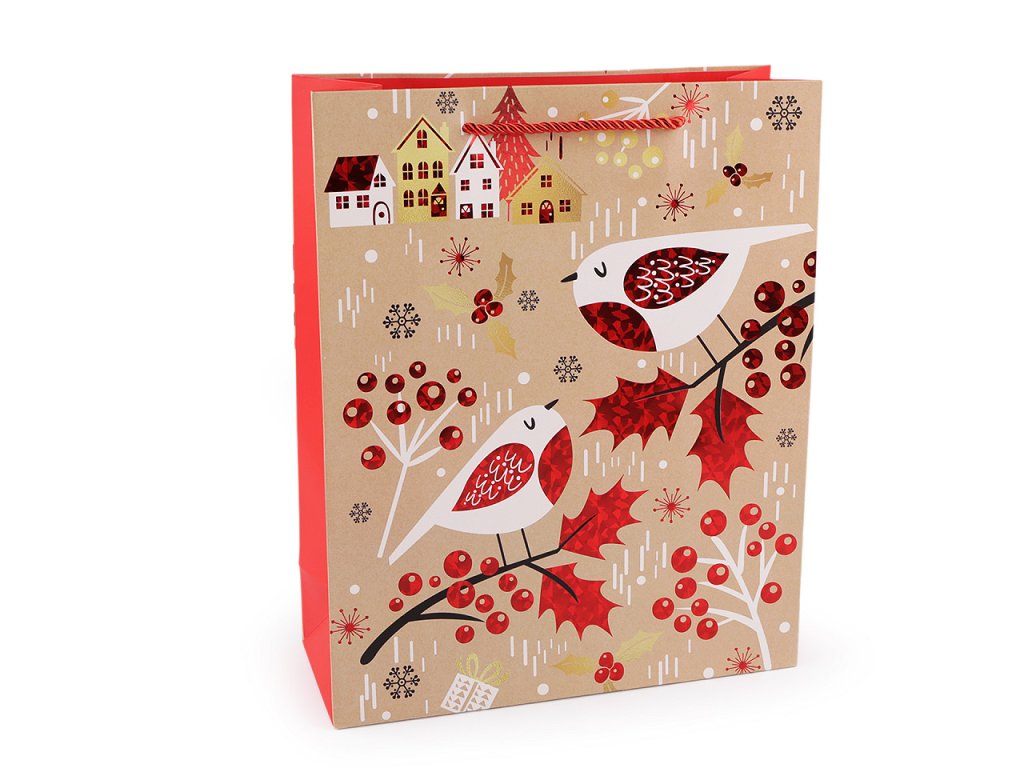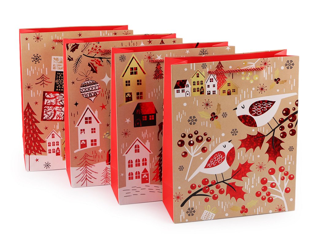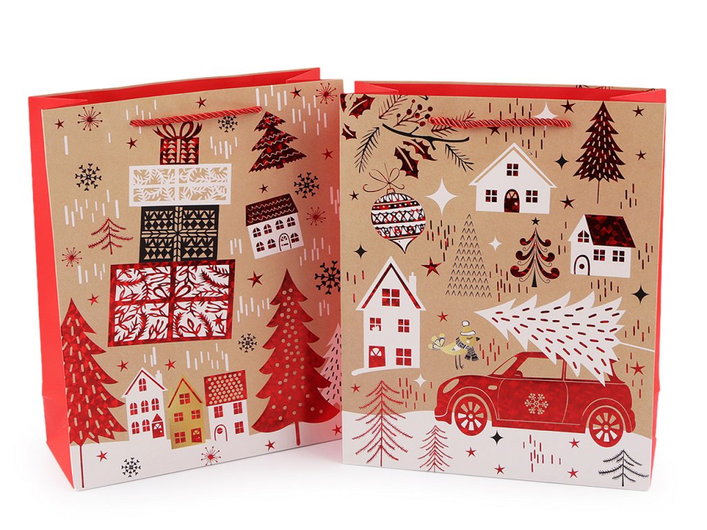 Sada vánočních dárkových tašek je skvělou volbou pro zabalení široké škály vánočních dárků, ať už se jedná o oblečení, knihy, kosmetiku nebo hračky. Ušetří vám spoustu času při balení. Jsou vyrobené z kvalitního pevného křídového papíru. Přední strana je ozdobená potiskem s metalickými detaily, zadní strana má barevný potisk, boky jsou jednobarevné. Ucha tašky jsou z kroucené saténové šňůry.- Rozměry: 26 x 32 x 10 cm