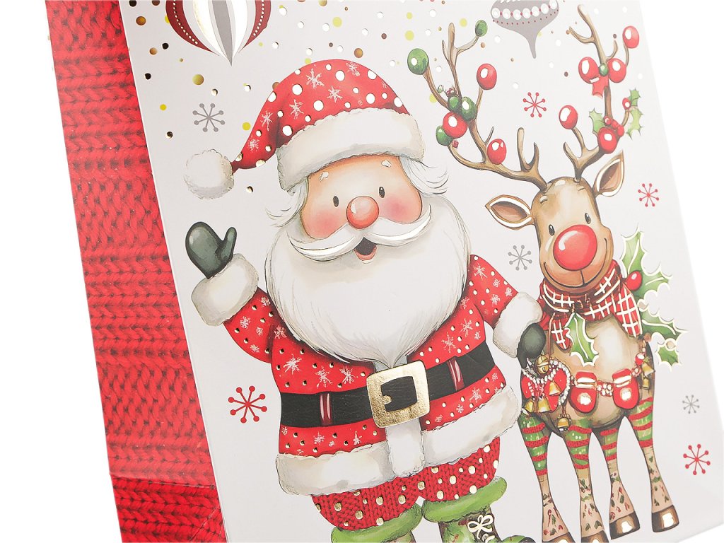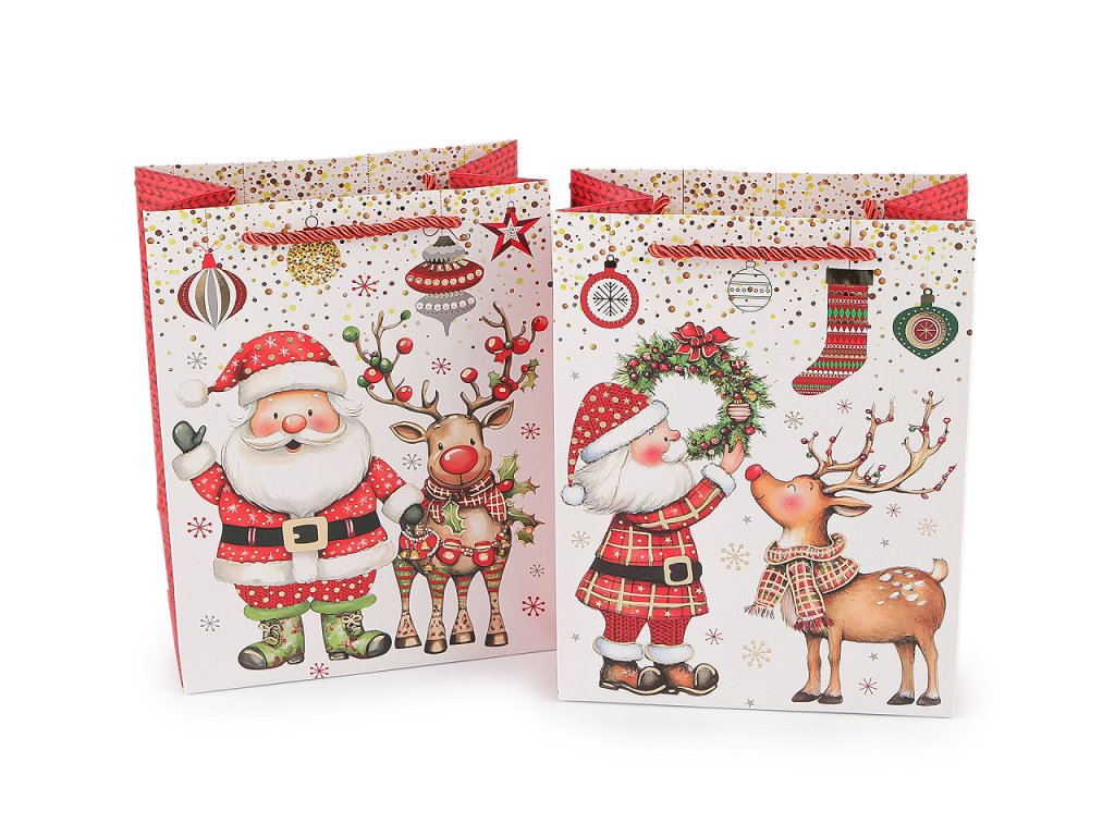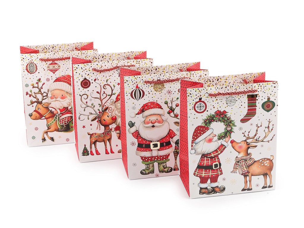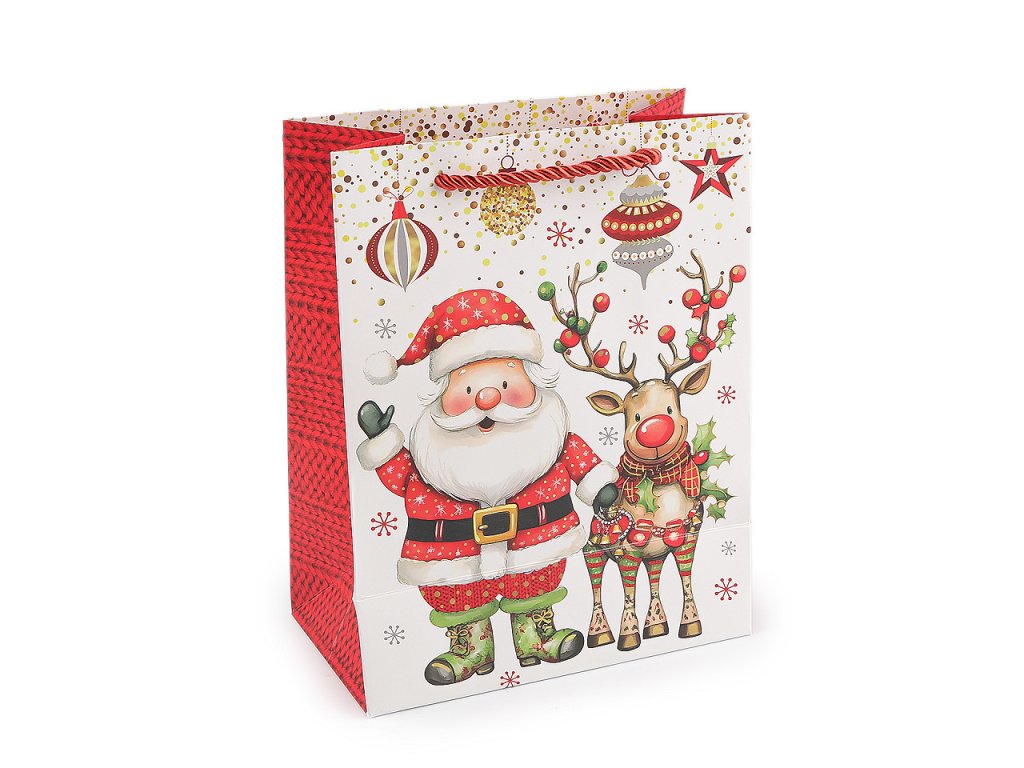 Sada vánočních dárkových tašek Santa se sobem je ideální volbou pro balení vašich nejrůznějších vánočních překvapení. Hodí se pro různé velikosti dárků, od menších po středně velké předměty, ať už se jedná o oblečení, knihy, kosmetiku nebo hračky. Ušetří vám spoustu času při balení. Jsou vyrobené z kvalitního pevného křídového papíru. Přední strana je ozdobená potiskem se zlatými metalickými detaily, zadní strana má barevný potisk, na bocích je potisk pleteniny. Ucha tašky jsou z kroucené saténové šňůry.- Rozměry: 18 x 23 x 10 cm