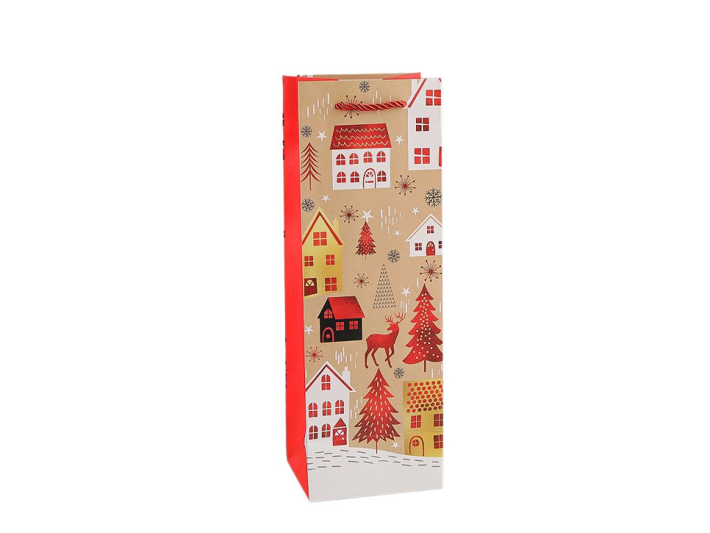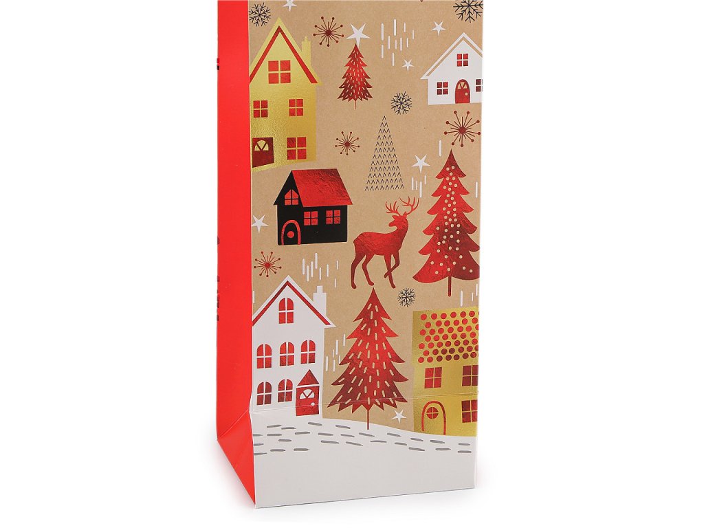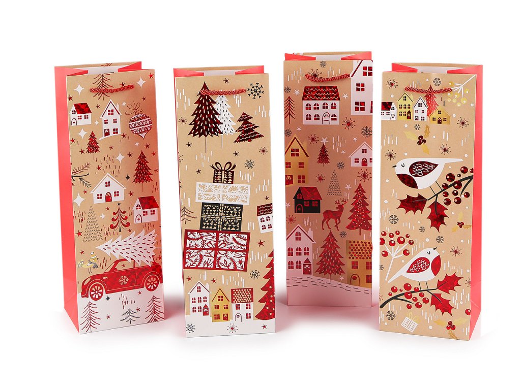 Sada vánočních dárkových tašek je určená na zabalení lahví a jiných podlouhlých dárků. Tašky jsou dostatečně vysoké, ať už se rozhodnete pro dárek s alkoholem nebo s domácí limonádou, tašky vám ušetří čas při balení. Jsou vyrobené z kvalitního pevného křídového papíru. Přední strana je ozdobená potiskem s metalickými detaily, zadní strana má barevný potisk, boky jsou jednobarevné. Ucha tašky jsou z kroucené saténové šňůry.- Rozměry: 12 x 35 x 10 cm