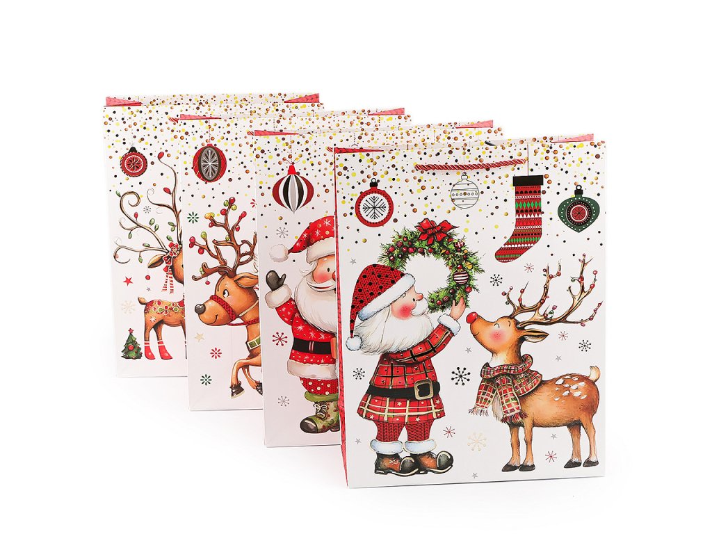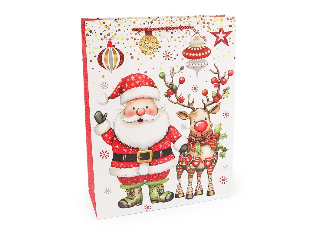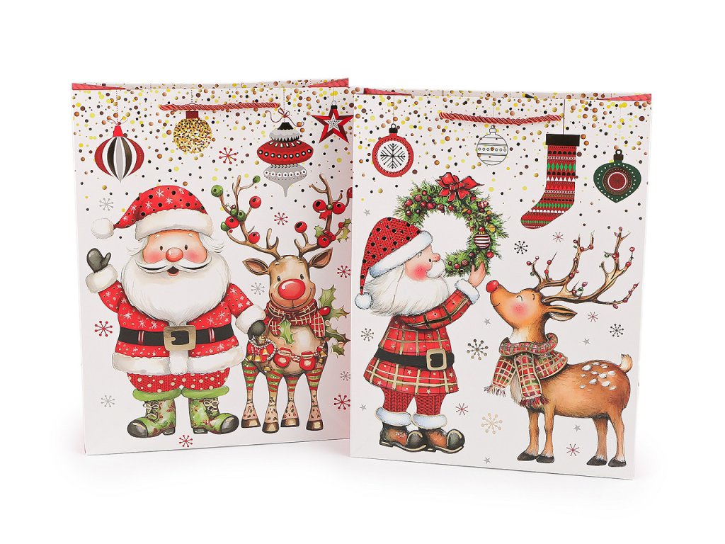 Sada vánočních dárkových tašek Santa se sobem je ideální pro balení větších předmětů, ať už jde o hračky, oblečení nebo různé dekorace. Ušetří vám spoustu času při balení. Jsou vyrobené z kvalitního pevného křídového papíru. Přední strana je ozdobená potiskem se zlatými metalickými detaily, zadní strana má barevný potisk, na bocích je potisk pleteniny. Ucha tašky jsou z kroucené saténové šňůry.- Rozměry: 30 x 39 x 12 cm