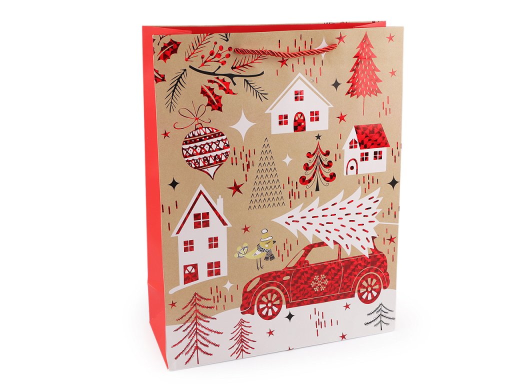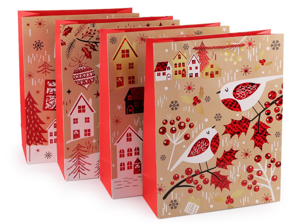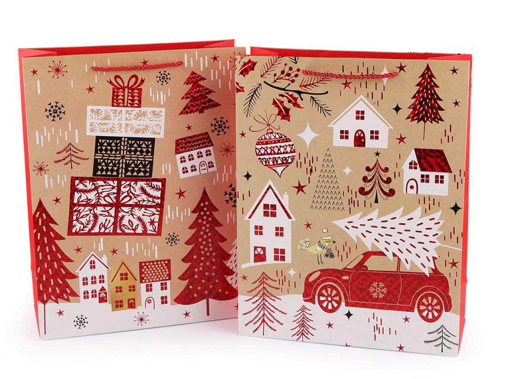 Sada vánočních dárkových tašek je ideální pro balení větších předmětů, ať už jde o hračky, oblečení nebo různé dekorace. Ušetří vám spoustu času při balení. Jsou vyrobené z kvalitního pevného křídového papíru. Přední strana je ozdobená potiskem s metalickými detaily, zadní strana má barevný potisk, boky jsou jednobarevné. Ucha tašky jsou z kroucené saténové šňůry.- Rozměry: 30 x 39 x 12 cm